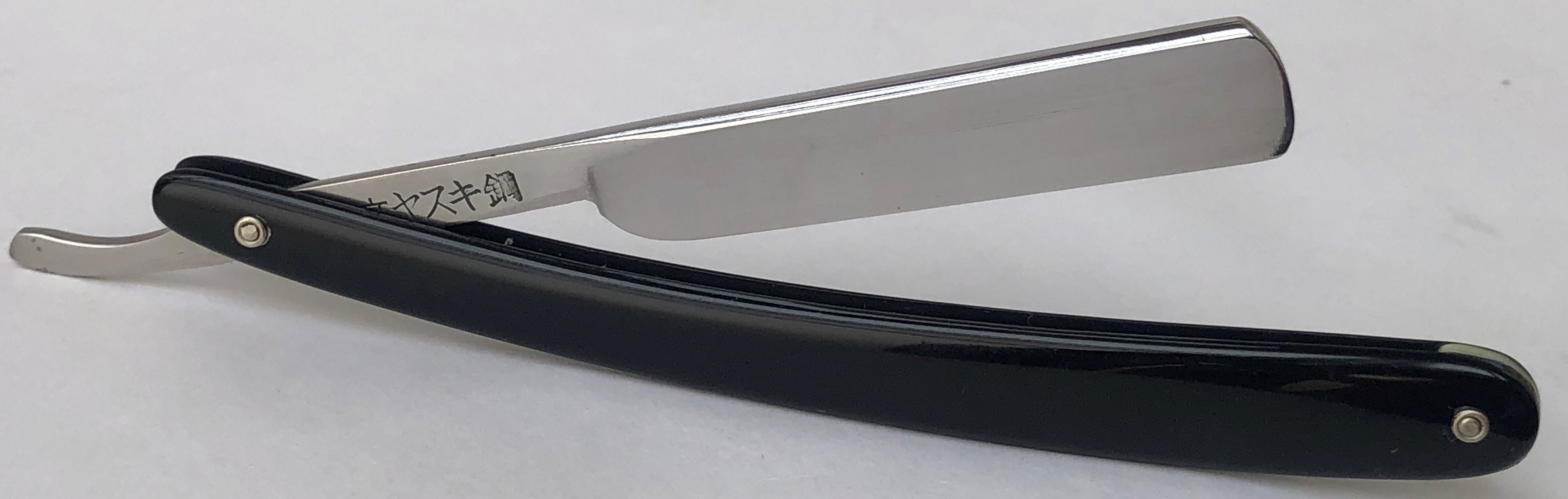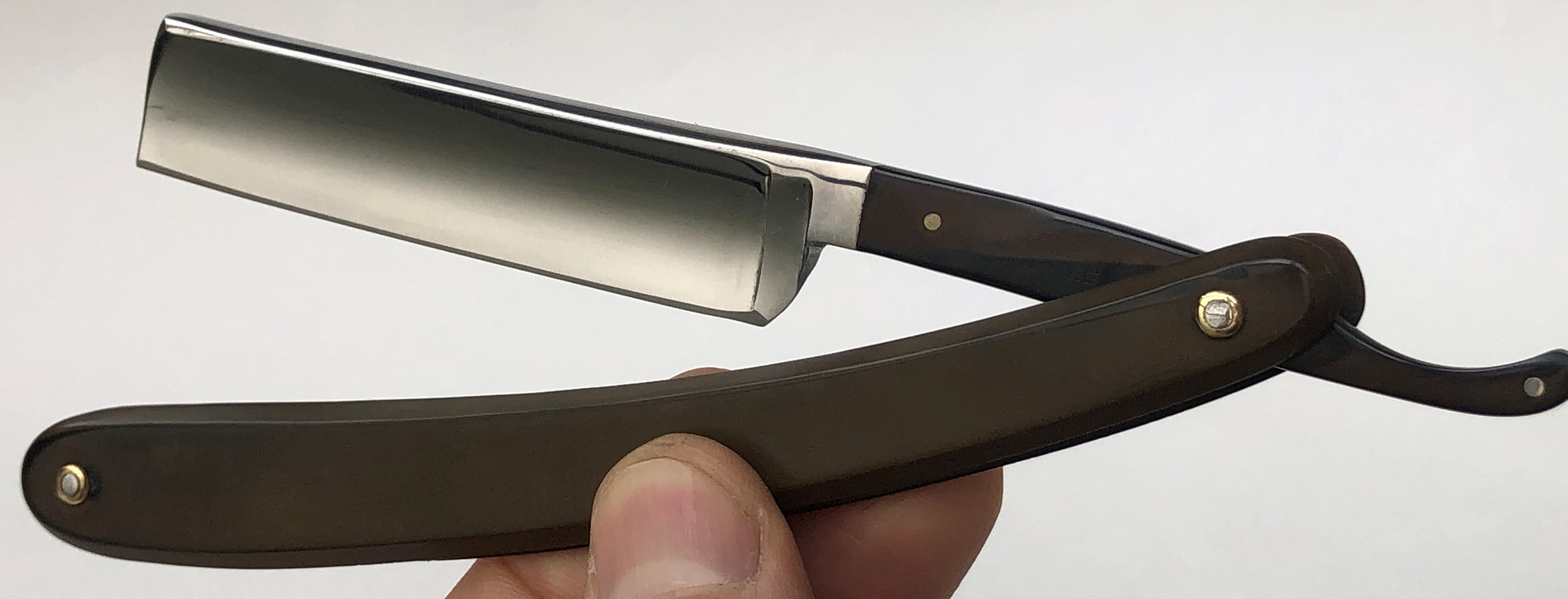 Бритва была разобрана и многолетняя патина была убрана, путем ручной шлифовки на камнях, по принципу шлифовки катан.Шлифовка полотна до 800 грит и полировка.Следы ковки на эрле оставил, как , по всей видимости было и задумано мастером.Поставил немецкие пины и добавил внутренние шайбы.