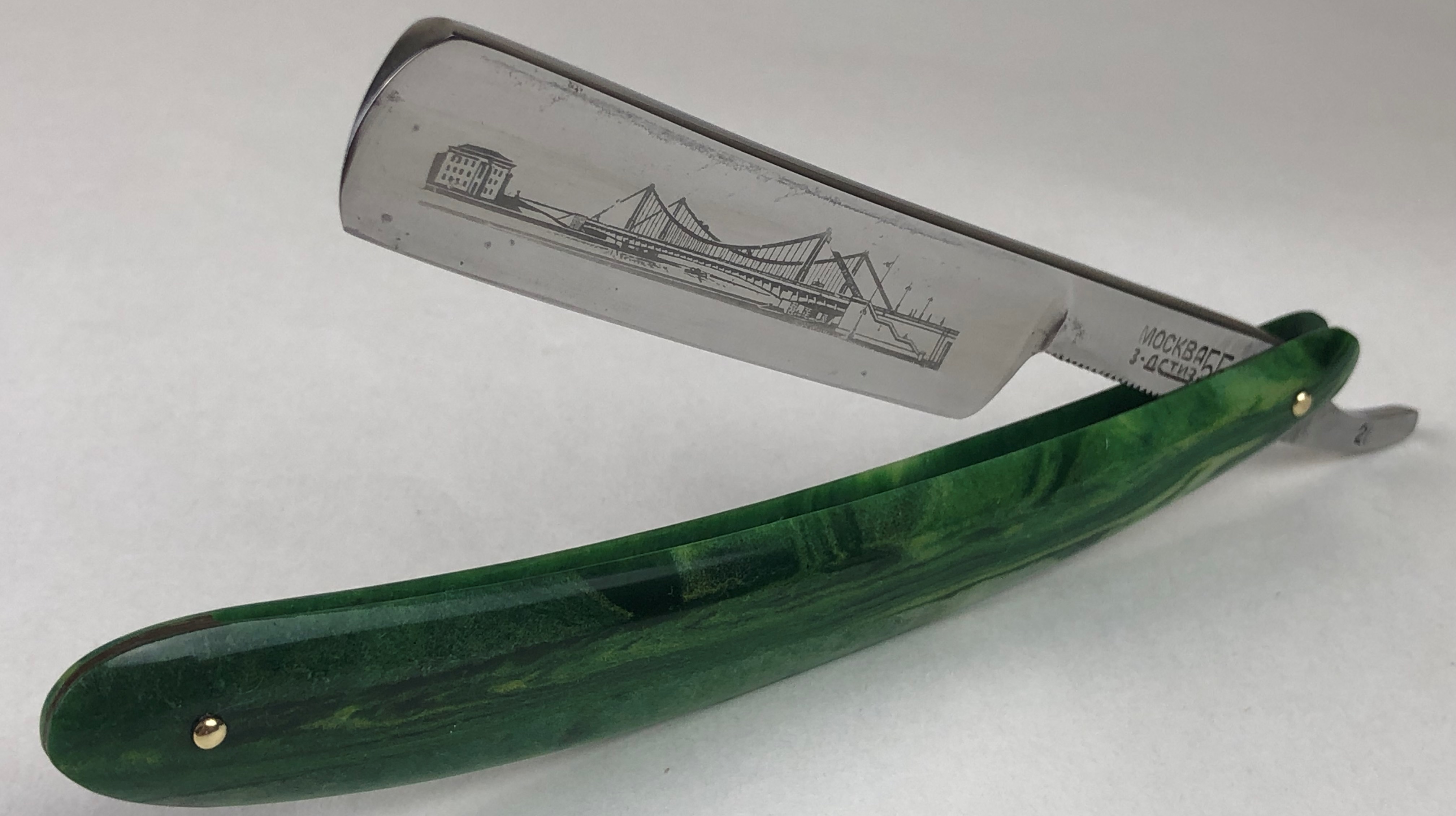 Бритва в прекрасном состоянии для своих лет. Минимальные следы пользования, практически незаметны.Не разбиралась и не ремонтировалась.Оригинальная шлифовка и полировка полотна. Красивая, эффектная гравировка.Очень хороший и удобный вариант для новичка.