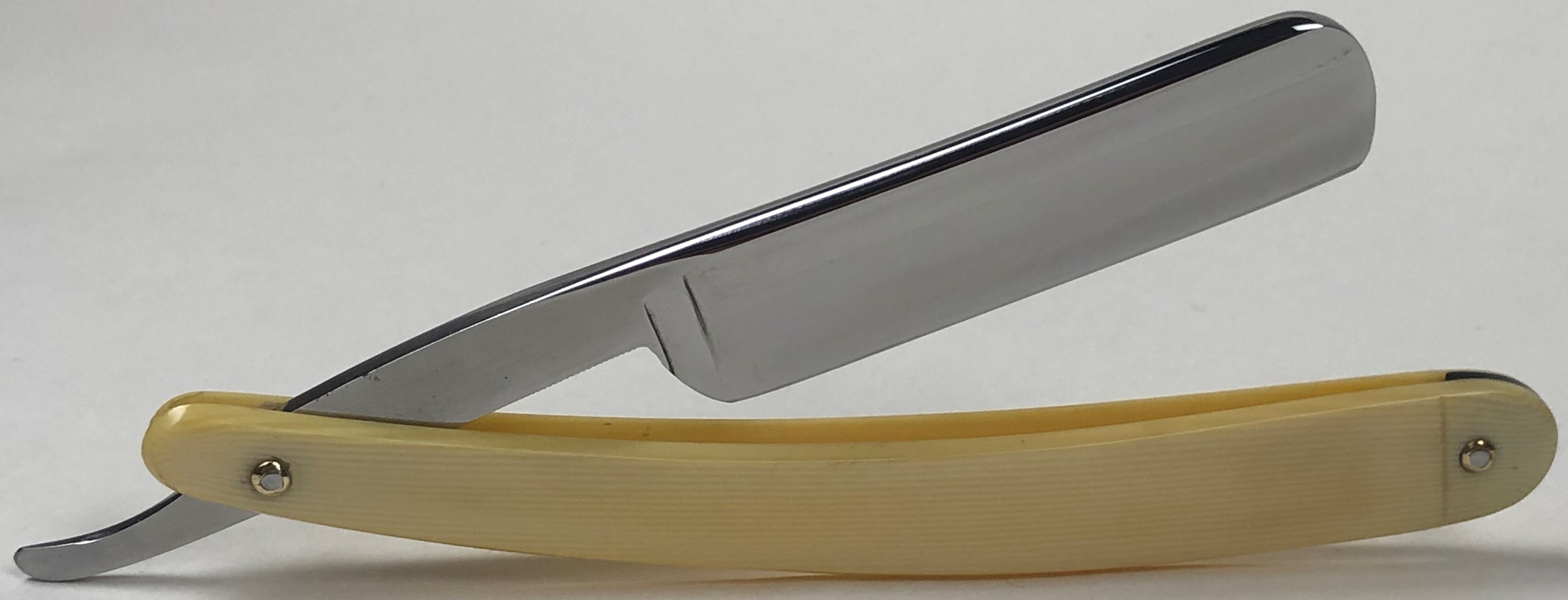Бритва в очень хорошем состоянии, близком к идеальному.Без следов пользования.Была разобрана, немного освежено полотно и почищен район осевого пина и снова собрана, с заменой оригинальных пинов на немецкие двух-цветные втулки.Идеальная геометрия клинка:кромочка равномерна по всей длине.Сталь чистая , без дефектов. Бритва очень удобна для обучения не только как брить, но и как бриться.Укороченное полотно даёт возможность легко подобраться в самые труднодоступные места.Бритва заточена и готова к пользованию.