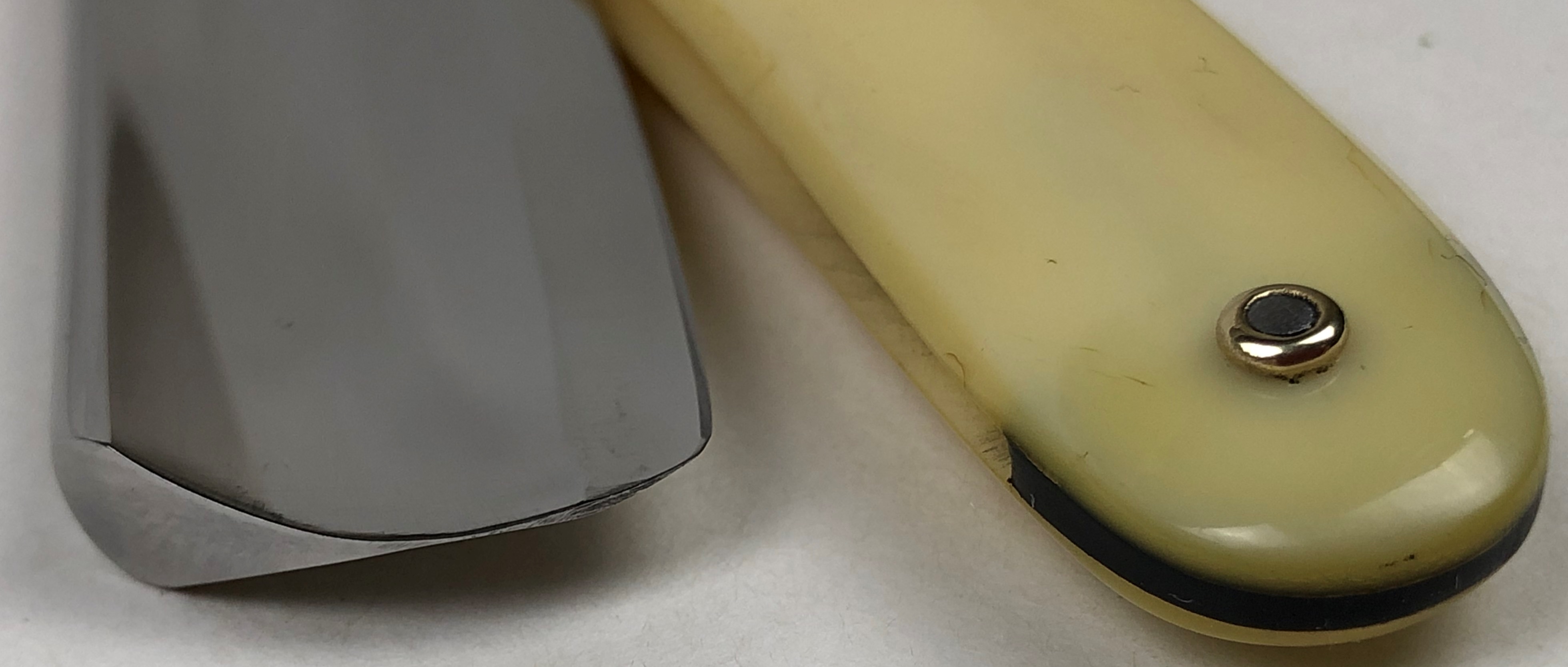 viewtopic.php?t=2083 Ширина полотна-19.5 мм. Толщина обушка-5 мм. Полная вогнутость. Углеродистая сталь. По всей видимости самое начало 20-го века, возможно и раньше. Бритва в очень хорошем и малопользованном состоянии."Горбатая" форма лезвия чем то напоминает наш стизовский послевоенный "СПАРТАК", хотя немного более массивный.Клинок был немного почищен от вековой патины и окисления металла, с сохранением шикартный "следов времени" на эрле..Не знаю, родная ли оправа стояла или нет, но в любом случае пины поменял на двух-цветные пины и добавил внутренние шайбы.Очень хорошая геометрия клинка:кромочка приближается у идеальной.Бритва заточена и лично протестирована. Отдельно хочу сказать по поводу заточки и качества стали. На мой взгляд, с точки зрения заточника, сама сталь(и закалка) прекрасно подходит для бритв.Прогнозируемо заточилась.После тонкой доводки на финишном камне уже стала проходить тест на рез волоса, а после правки на ремне тест мягкий , без отскока. Что важно,после бритья бритва прекрасно продолжает проходить тест на рез волоса, без правки на ремне, что говорит о качественной стали , способной хорошо держать заточку. По своей форме лезвия и размерам, бритва будет отличным вариантом для новичка и не только. Цена-10500 р с доставкой.ПРОДАН Spoiler Show