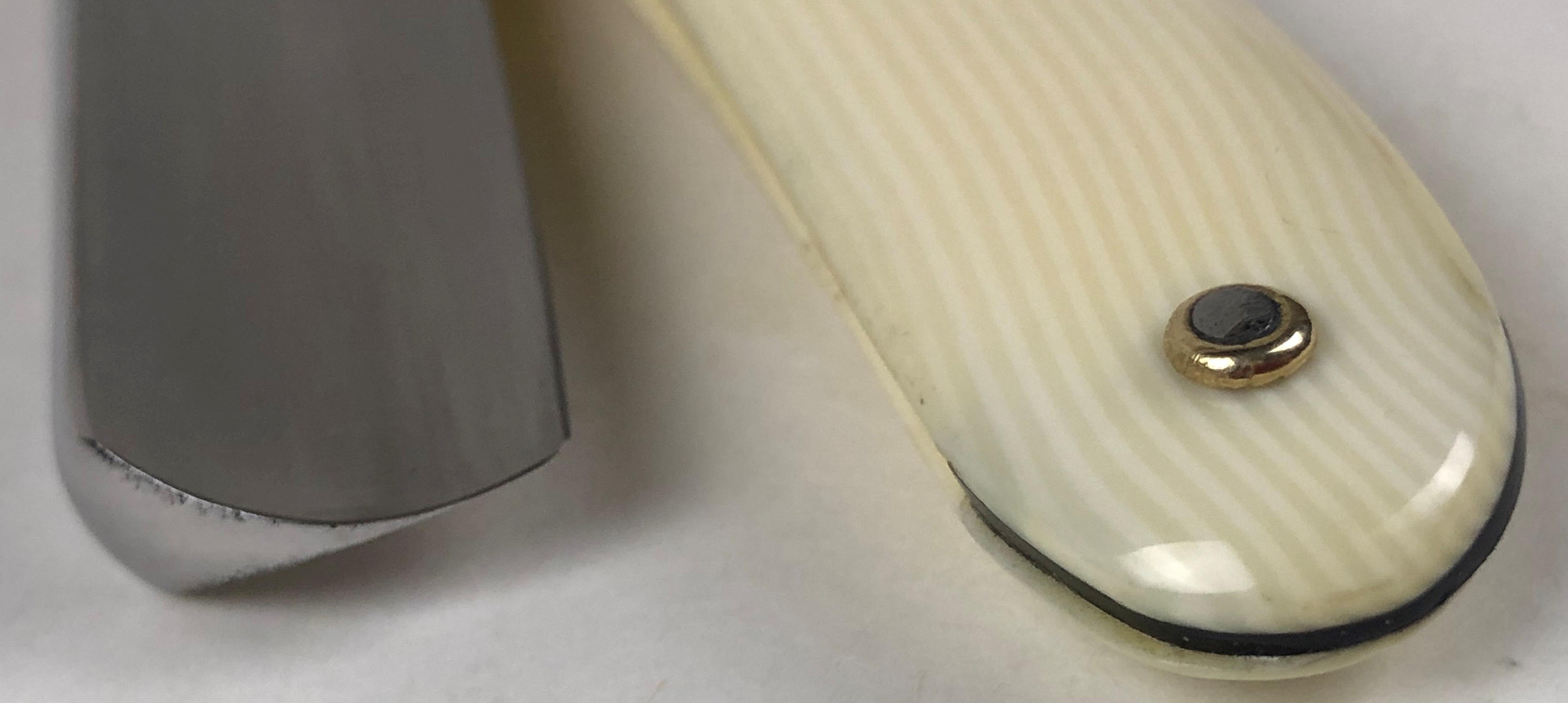 Бритва не разбиралась и не ремонтировалась. Все в оригинале. Заводская заточка была переделана под нормальное бритье.За исключением небольшого и малозначительного окисления с одной стороны полотно, все чисто, без дефектов. Геометрия приближена к идеальной.