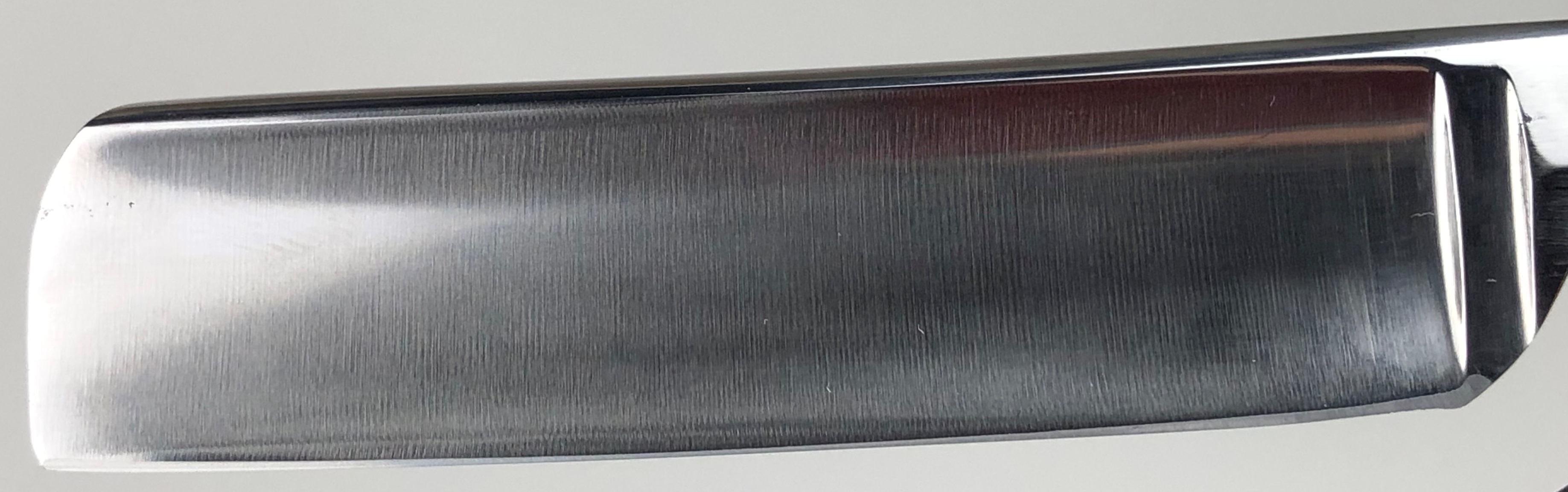 По всей видимости бритва не была в пользовании.Тяжёлый укороченный клинок. Следов от заточных камней на обушке нет и не было.Разобрал бритву, чтобы установить внутренние шайбы, так как без них ручка сильно царапала клинок.Заодно убрал остатки окисления и патины, ну и прошелся косметически по полотну, для порядка. Умеренная полировка.Оригинальные пины удалось заново поставить. Сталь чистая, без дефектов. Кромочка ровненькая по всей длине.Бритва сейчас в состоянии новой.Перед отправкой будет заточена и подготовлена к бритью.