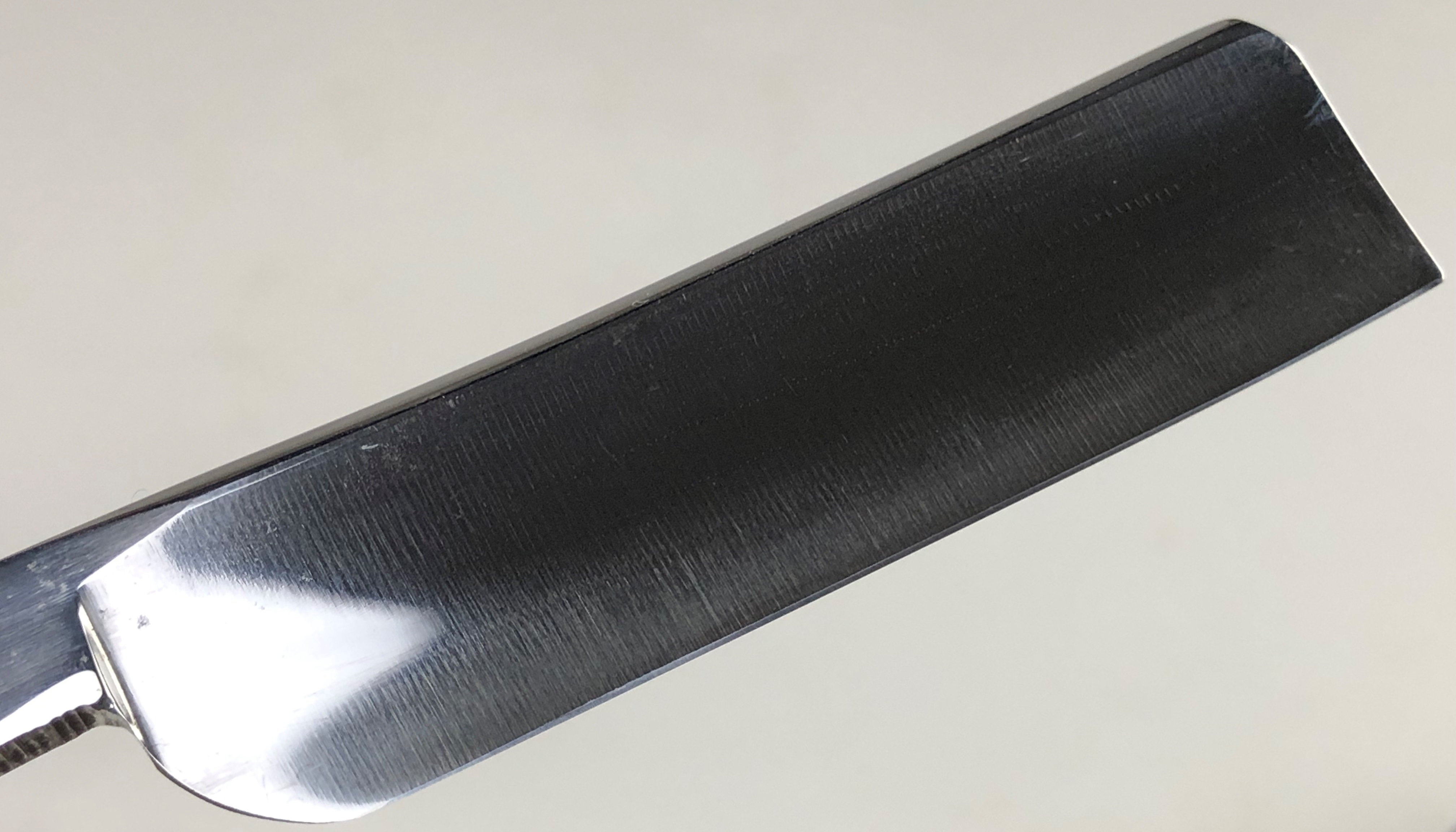 Бритва не разбиралась.Находится в очень хорошем и малопользованном состоянии. Полотно перешлифовал и умеренно отполировал.Идеальная геометрия клинка:кромочка равномерна пов сей длине.Сталь чистая, без дефектов. Заточена и готова к бритью.