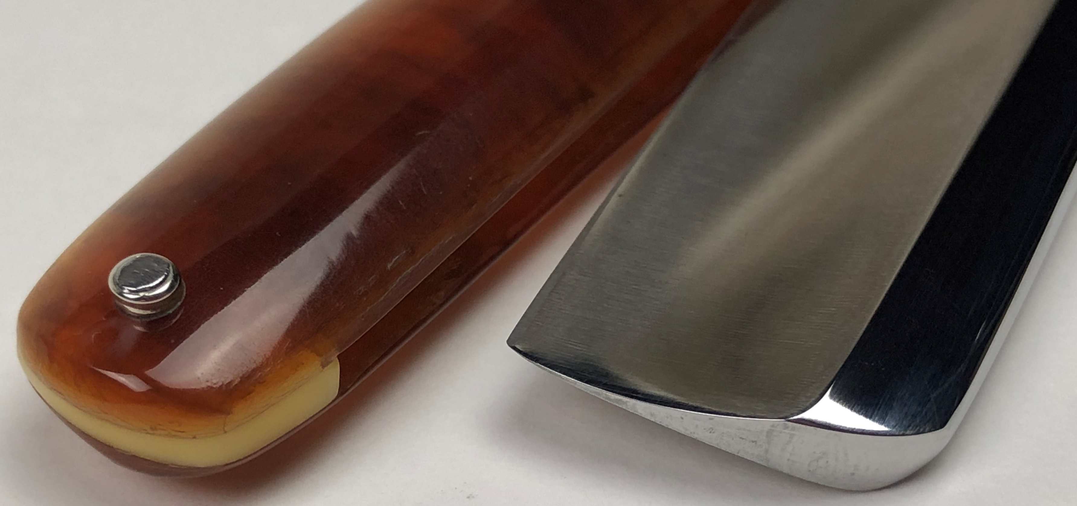По всей видимости бритва не была в пользовании.Тяжёлый укороченный клинок. Следов от заточных камней на обушке нет и не было.Разобрал бритву, чтобы установить внутренние шайбы, так как без них ручка сильно царапала клинок.Заодно убрал остатки окисления и патины, ну и прошелся косметически по полотну, для порядка. Умеренная полировка.Оригинальные пины удалось заново поставить. Сталь чистая, без дефектов. Кромочка ровненькая по всей длине.Бритва сейчас в состоянии новой.Перед отправкой будет заточена и подготовлена к бритью.