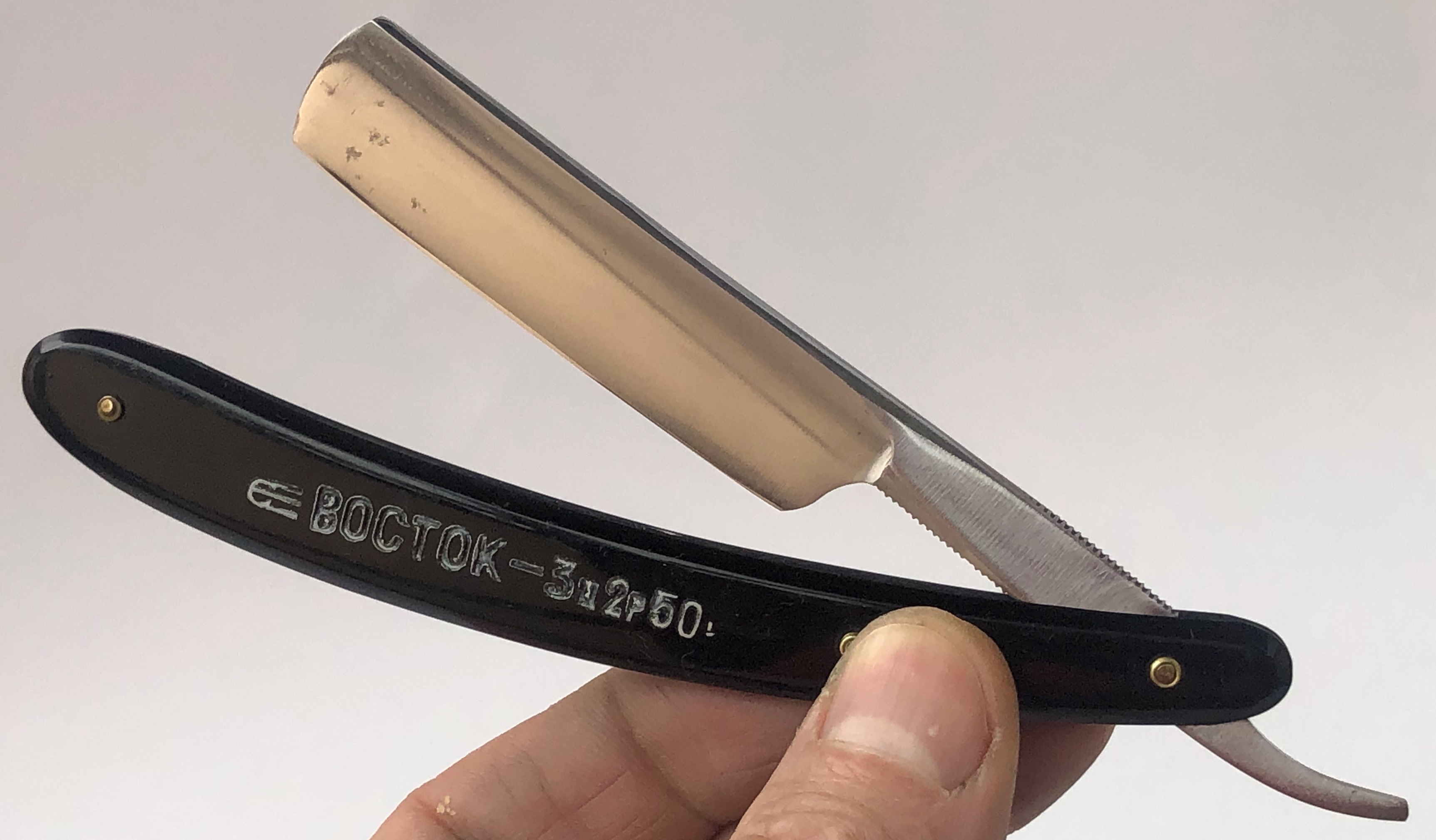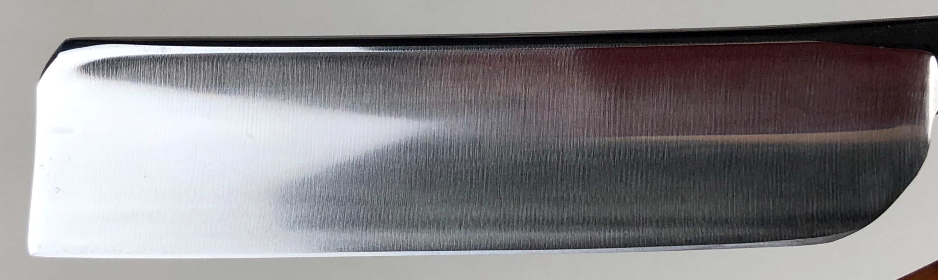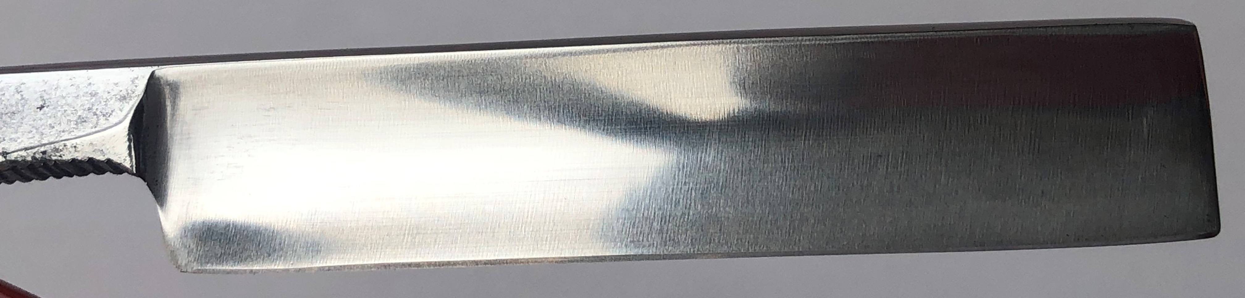 Бритва не разбиралась и не ремонтировалась. Все в оригинале. Заводская заточка была переделана под нормальное бритье.За исключением небольшого и малозначительного окисления с одной стороны полотно, все чисто, без дефектов. Геометрия приближена к идеальной.
