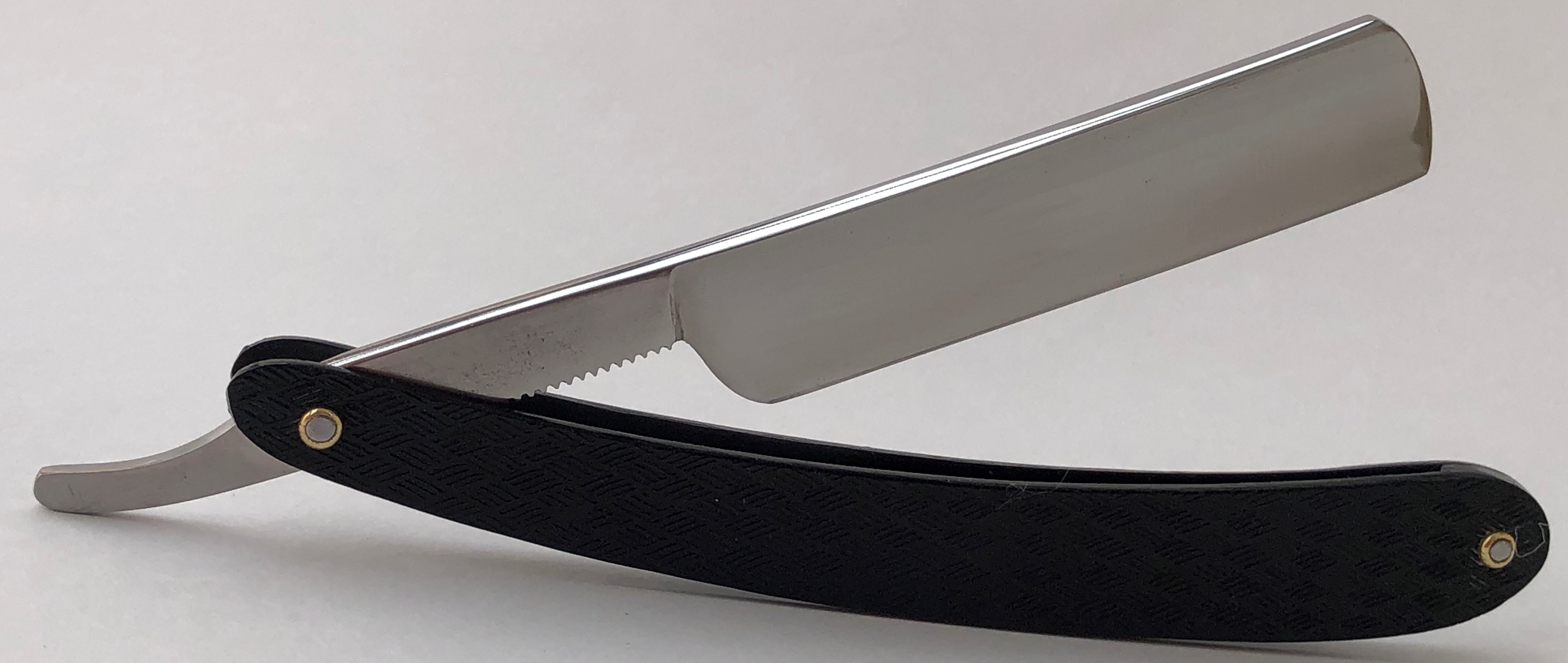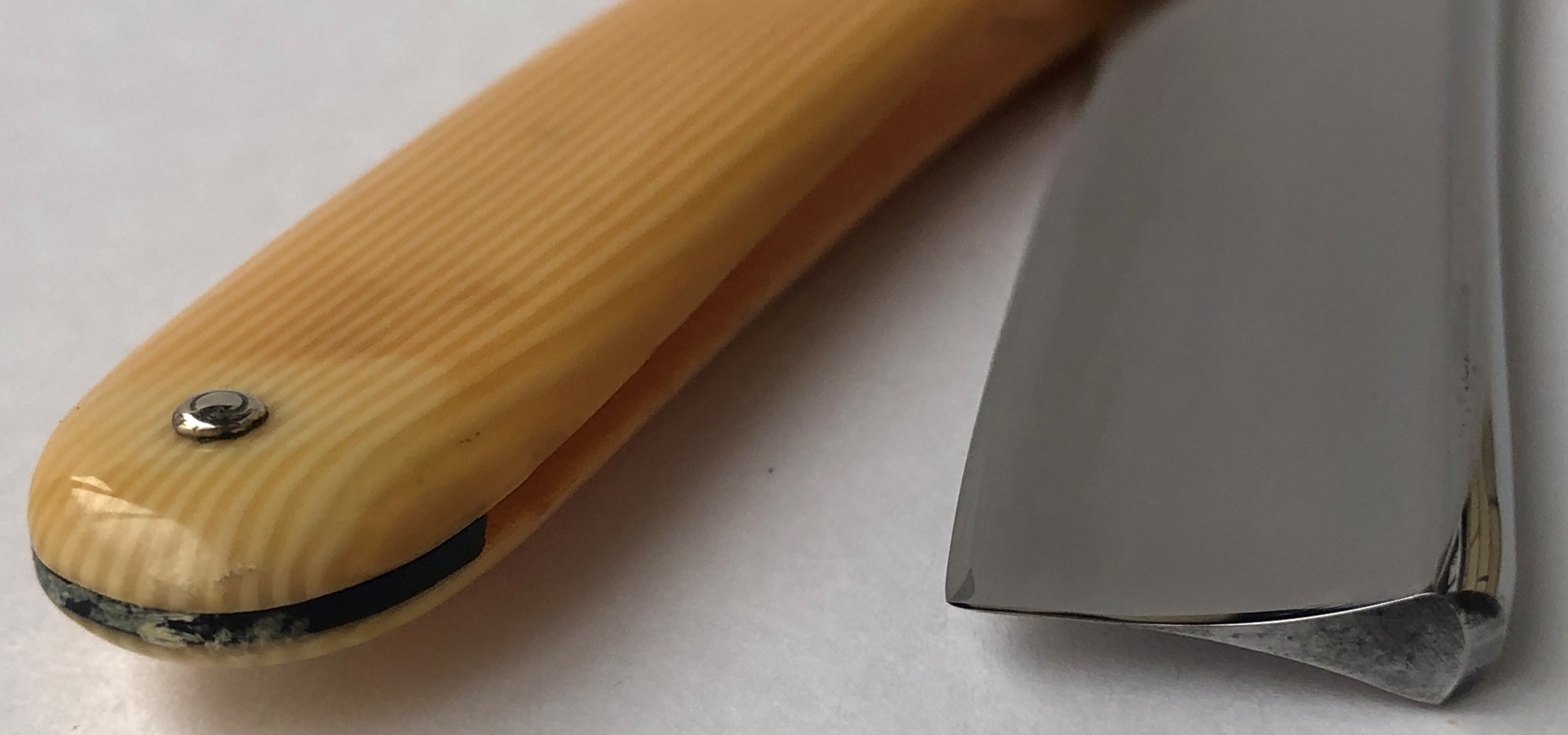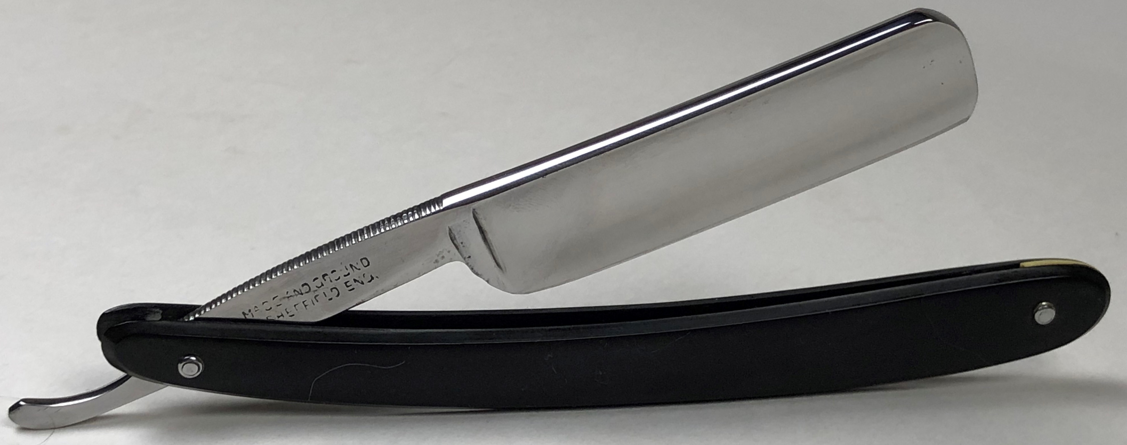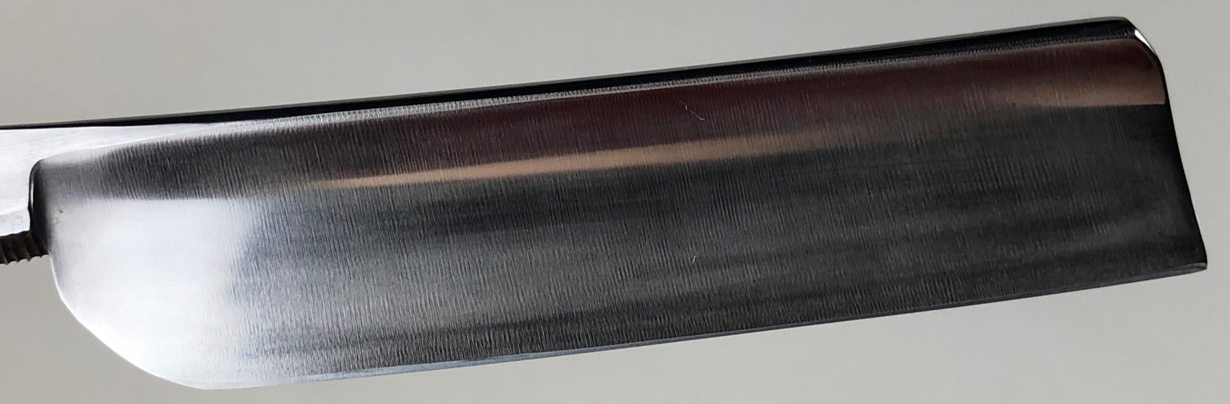 Бритва не разбиралась и не ремонтировалась. Все в оригинале. Заводская заточка была переделана под нормальное бритье.За исключением небольшого и малозначительного окисления с одной стороны полотно, все чисто, без дефектов. Геометрия приближена к идеальной.