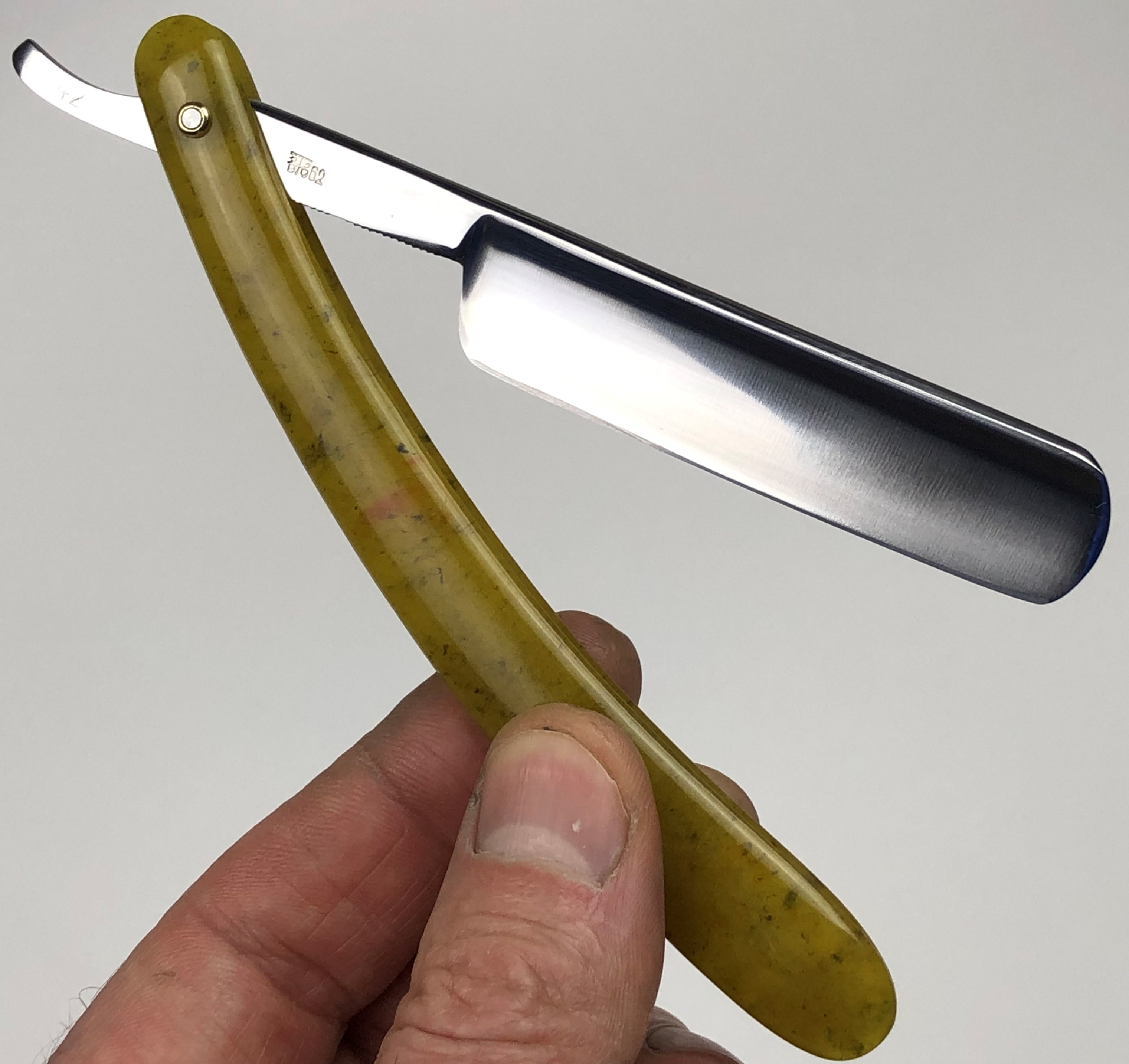 По всей видимости бритва не была в пользовании.Тяжёлый укороченный клинок. Следов от заточных камней на обушке нет и не было.Разобрал бритву, чтобы установить внутренние шайбы, так как без них ручка сильно царапала клинок.Заодно убрал остатки окисления и патины, ну и прошелся косметически по полотну, для порядка. Умеренная полировка.Оригинальные пины удалось заново поставить. Сталь чистая, без дефектов. Кромочка ровненькая по всей длине.Бритва сейчас в состоянии новой.Перед отправкой будет заточена и подготовлена к бритью.