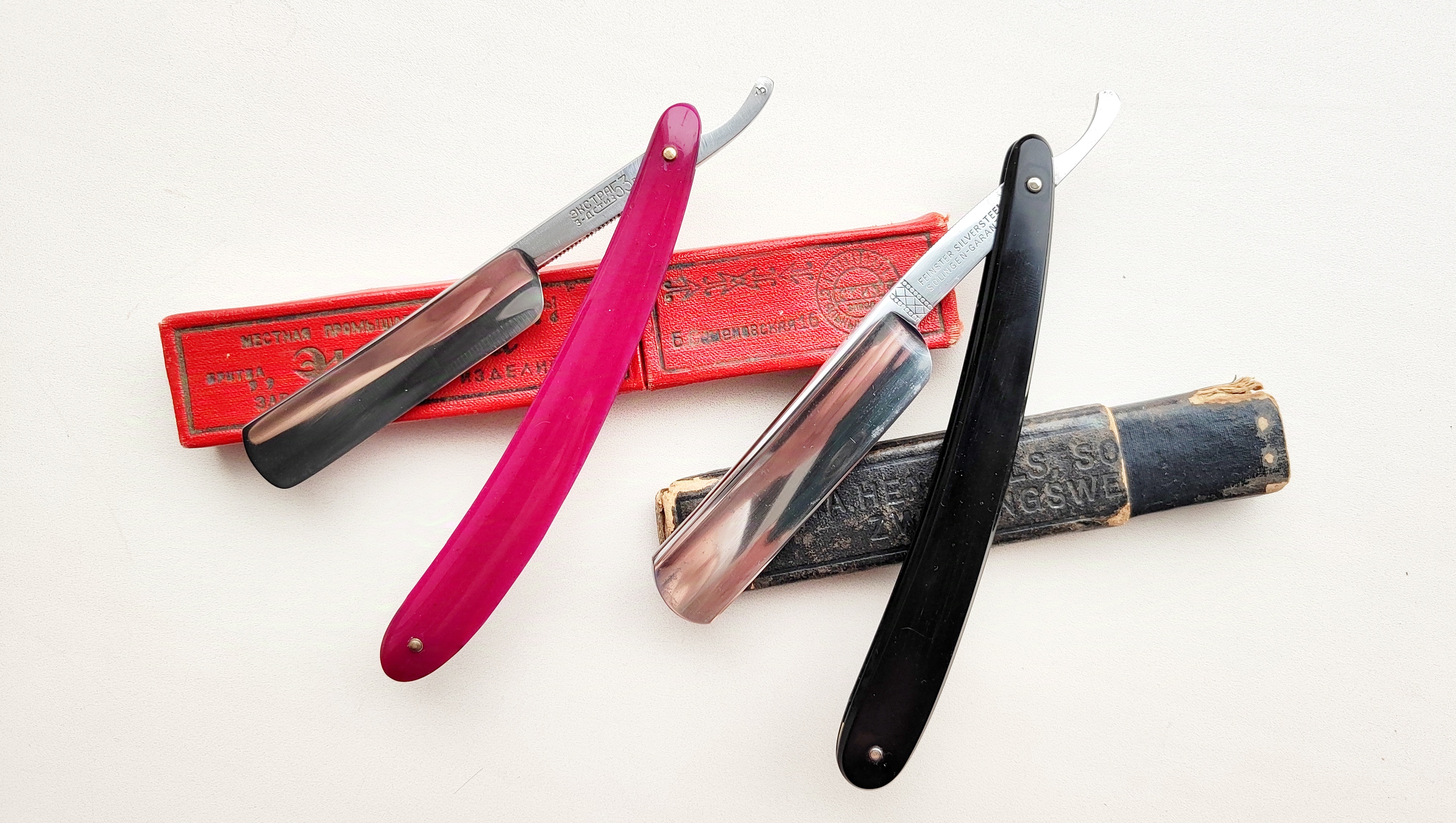 Попалась мне тут пара бритв, владелец у них когда то был один, родственники нашли их в закромах и они теперь мои. Одна Сталина помнит, вторая - некоего Г. И ведь уживались вместе. Немец - бест сильвер стил, ещё и ручку от СТИЗ ей приладили, футляр от Хенкельс. Скорее всего изначально ручка была из целюлоида, этот материал плохо переносит возраст, поменяли и сохранили родной пин. СТИЗ Экстра 53 - ширина 17 мм Feinster SilverSteel Solingen - ширина 20 мм.