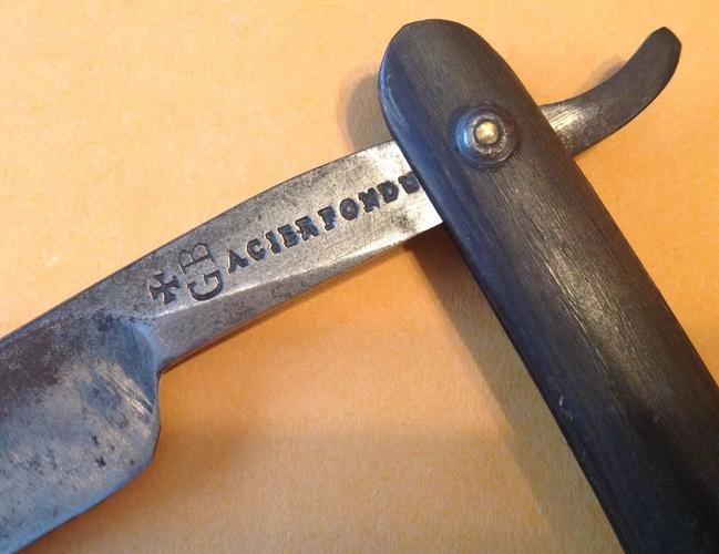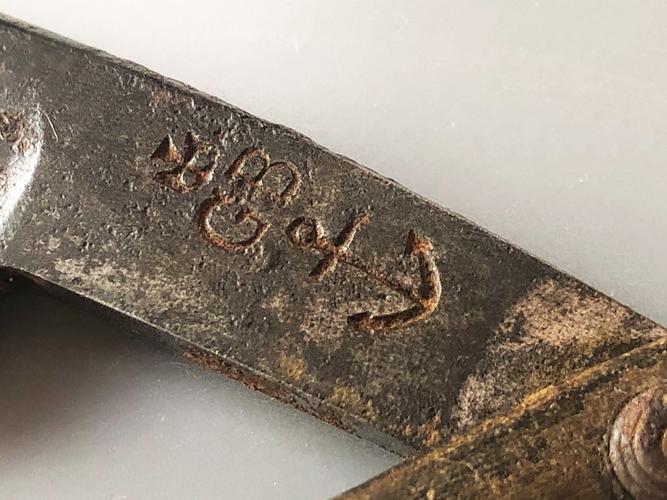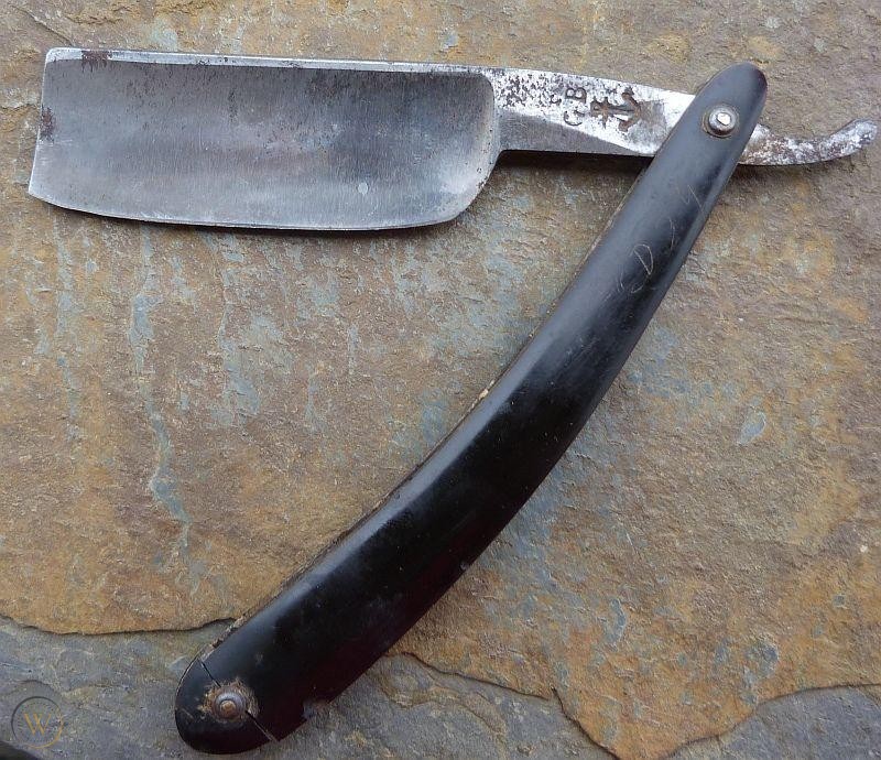 Марка: якорь и мальтийский крест http://homepage.eircom.net/~lawed/SILVERSMITHSPART2.htm "More Old Razors" Генри Т. Ламмус Номер 4. Дата 1785. Производитель Brittain, Wilkinson & Brownell, Шеффилд (1780-1840). Торговая марка: "France". Рукоять: красный рог. George Brittain появился в качестве партнера в компании, которая взяла свое начало на улице Sycamore (1774 год). До этого он был мастером ножевщиком (1773 год). В 1776 году Питер Броунел поступил на обучение к Бриттэйну. В июле 1784 года Джордж Бриттен, Джонатан Уилкинсон, Питер Браунелл и Джозеф Ибберсон основали новую компанию по производству столовых приборов в мастерской Бриттена. Было использовано несколько торговых марок, одна из которых была «GB» с мальтийским крестом и якорем. Значение якоря неизвестно, но его часто можно увидеть с отметками «GB» и мальтийскими буквами. После смерти Джорджа Бриттэйна (1812) его сын, Вердон Бриттэйн (Verdon Brittain) продолжил руководство фирмой с поддержкой Бернарда Бриттэйна. Семья Бриттэйнов была большой, включая ножевиков, сталеваров, производителей пил и другого режущего и прочего инструмента, а так же бритв. С 1815 по 1830-е годы бизнесом руководил третий сын Джорджа Бриттена Вердон, он умер в 1843 году, и семьи разошлись. Фирмы, вовлеченные в компанию,(Бриттэйн , Вилкинсон и Браунел) пошли каждая по своей дороге. Семья Бриттэйнов продолжила свой путь на поприще ножей, режущего инструмента и сталеваров, семья Браунелов продолжили изготавливать ножи (отметка GB и мальтийский крест ушли вместе с ними). Браунелы (Brownells) торговали вплоть до 1861 года, когда они были куплены фирмой Стейси, Пис & Co. (Stacey, Pease & Co), которые так же переняли и логотип (GB и мальтиский крест). В 1850 механик по имени Edward Gem открыл бизнес в Бирмингеме, объединившись с двумя партнерами по фамилии Moilliet сформировал компанию Moilliet & Gem, открывшую офис в Sheffield. Партнерство длилось недолго, прекратившись в 1858 году, но Edward Gem стал представлять себя как преемника Moilliet & Gem, обосновавшись в Шеффилде и изготавливал столовые приборы и ножи, в частности ножи Bowie-style. В какой-то момент, после 1861 года, он приобрел остатки Stacey, Pease & Co, в том числе знаки GB и мальтийский крест. В 1890 бизнес Edward Gems был продан Alfred Field из Alfred Field & Co, который был в производственном бизнесе в Бирмингеме с 1836 года, уехал в Америку и открыл его в Нью-Йорке, вернулся в Бирмингем в 1854 году и открыл филиал в Шеффилде в 1876 году. Хотя Alfred Field умер в 1884 году - за 6 лет, прежде чем его компания купила бизнес Edward Gem & Co, бизнес продолжал его сын Harry и не прекращал торговлю до 1933 года. George Brittain GB, Wilkinson & BrownellОбразцы клейм George Brittain GB, Wilkinson & Brownell