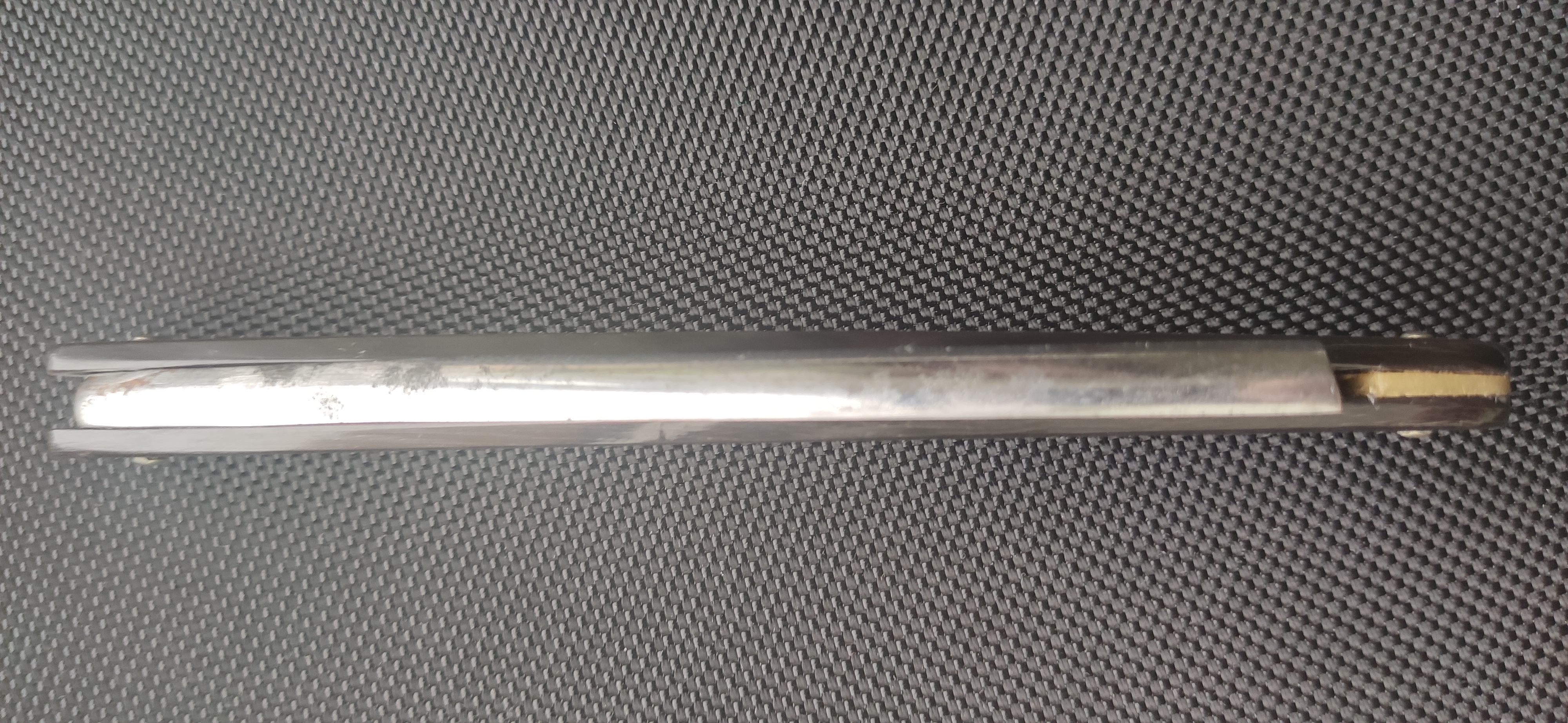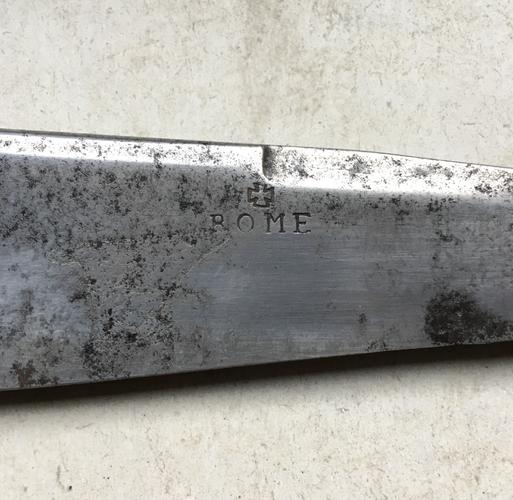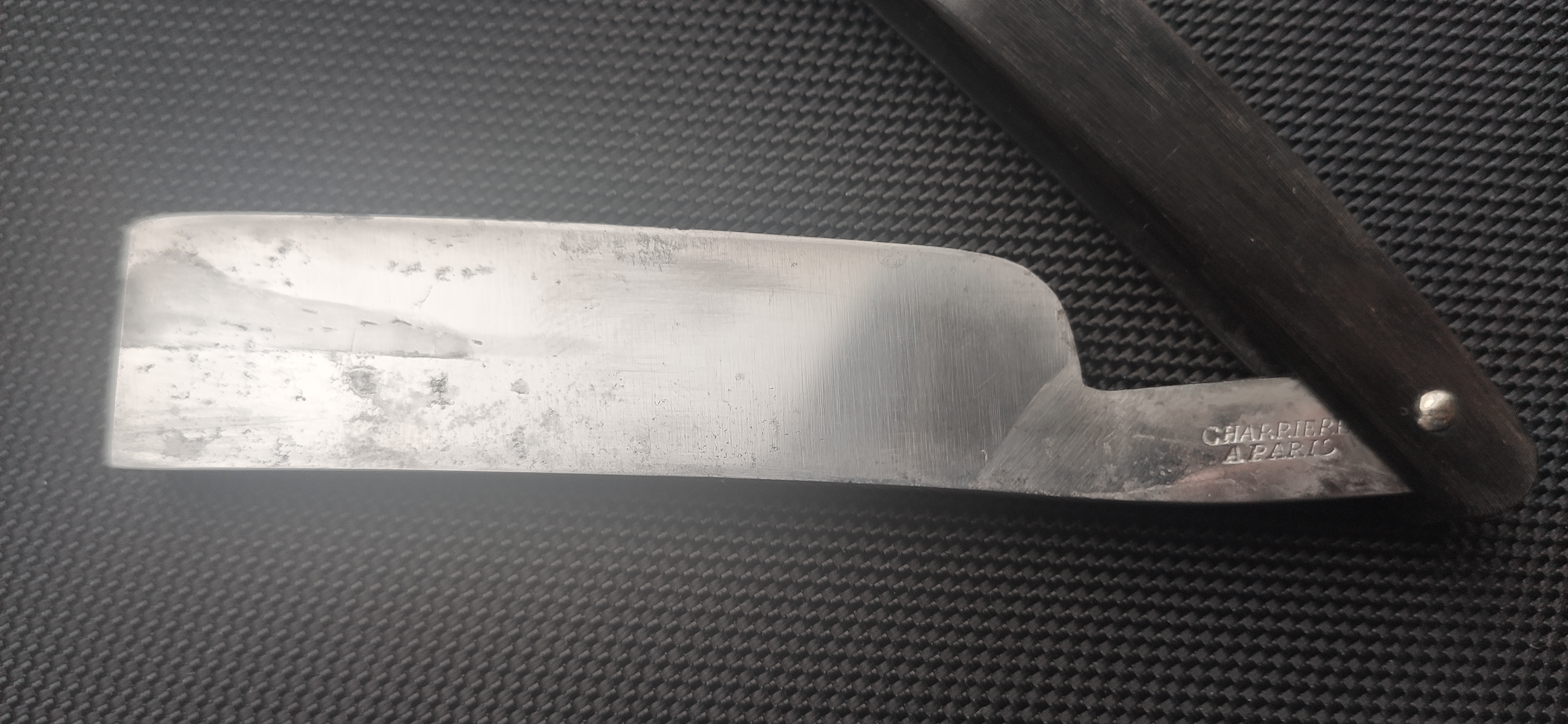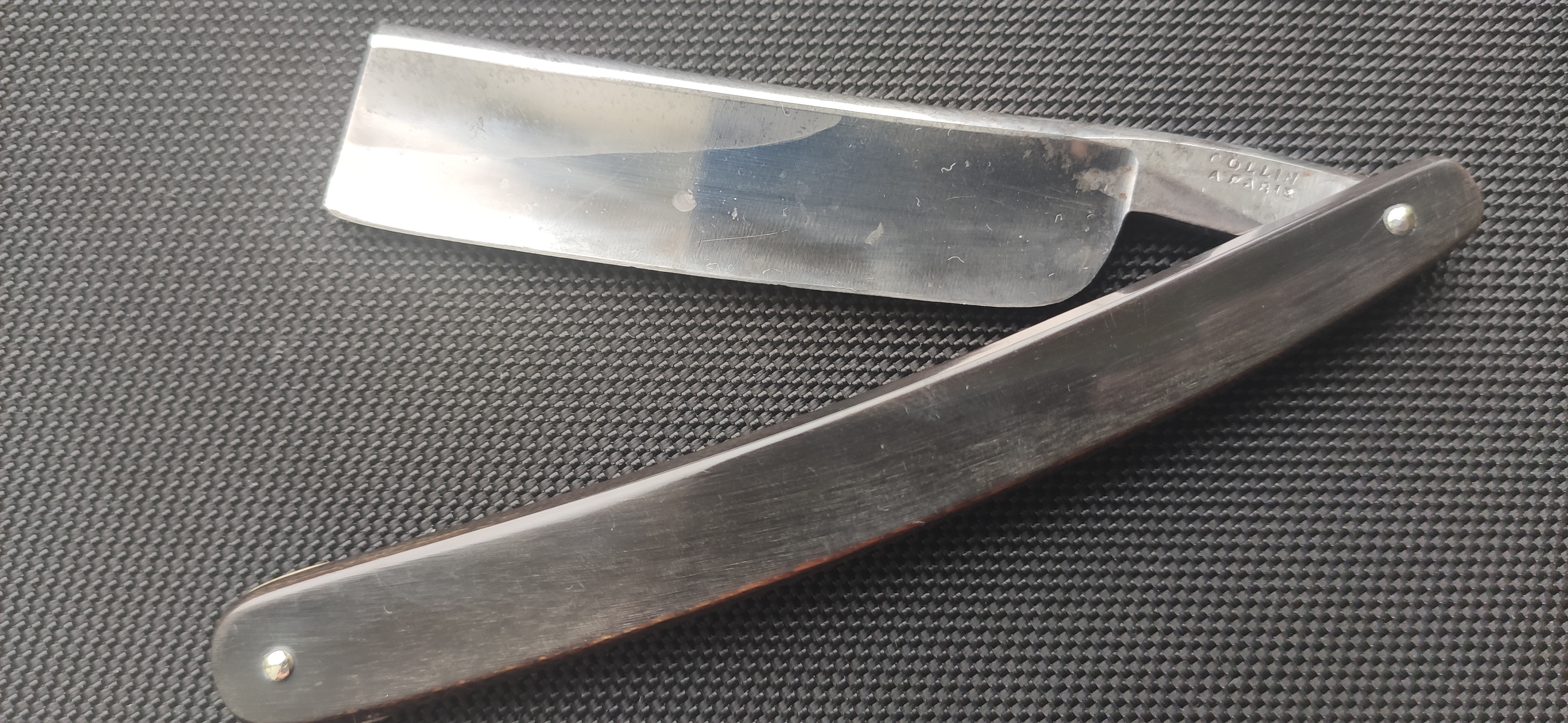 Данный бесхвостик размер 7/8, 22,5 мм, длина лезвия 83 мм, толщина обушка 5,5 мм, длина эрля 30 мм, ручка рог, клинышек кость. Обращает на себя внимание короткий для бесхвостика эрль. Если классические бесхвостики имеют длинные, около 50 мм эрли, для удобства удержания, связанные с отсутствием хвоста, то данный экземпляр всего 30 мм. Но это не главная особенность данной бритвы. Вогнутость клинка ассиметричная, с одной стороны выборка на четверть, с другой стороны полный клин. Но приложив лекальную линейку к стороне, где клин, оказалось, что вогнутость и там есть, но минимальная, на грани восприятия, видимо для возможности заточки: