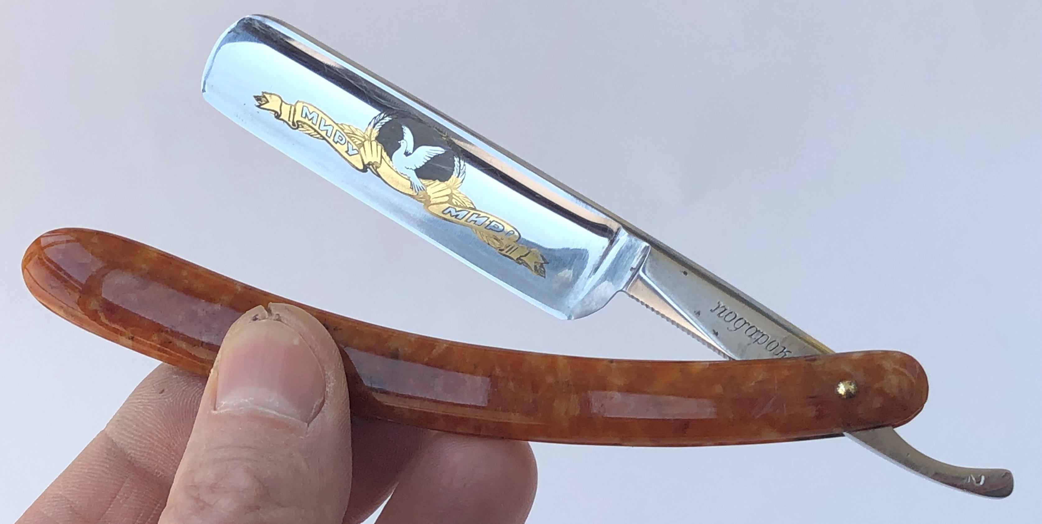 (донор довоенный, примерно 20-30-е годы).Плашки оправы прочные и достаточно толстые,без трещин и дефектов. Природный рисунок кости невероятной красоты.Понятно, что японцы не ставили на свои бритвы (по крайней мере я не видел ничего подобного) ручки из натуральных материалов,но в этот раз захотелось чего то неординарного.Из за свой формы клинка, а также размеров оправы,бритва достаточно тяжёлая и приятно лежит в руке.Бритва заточена и лично протестирована. Бреет прекрасно и без вопросов.