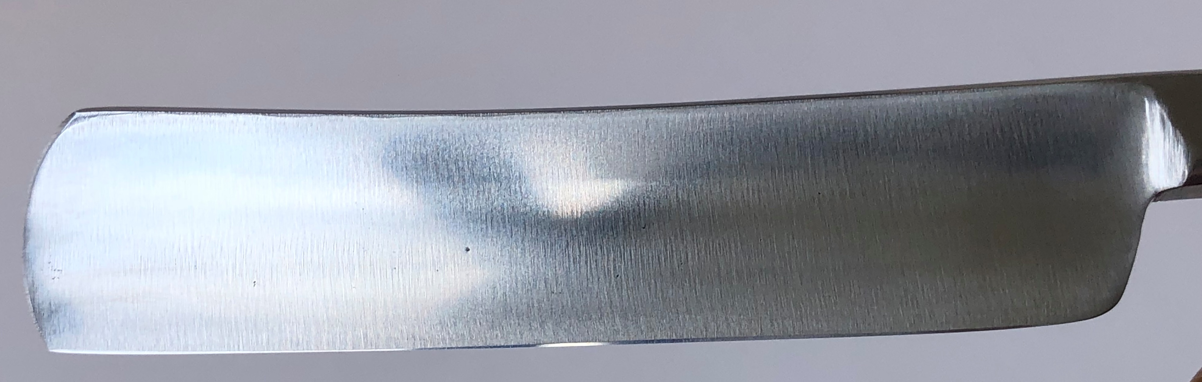 Бритва в идеальном и непользованном состоянии. Была разобрана для удаления окисления в районе осевого пина, а также немного освежил само полотно от небольшого налёта патины.Косметическая, минимальная шлифовка и умеренная полировка.Идеальная геометрия клинка:кромочка равномерна по всей длине.Отличная "звонкая" сталь.Мощная и надёжная трёх-пиновая оправа.Состояние новой. Бритва заточена и готова к бритью.