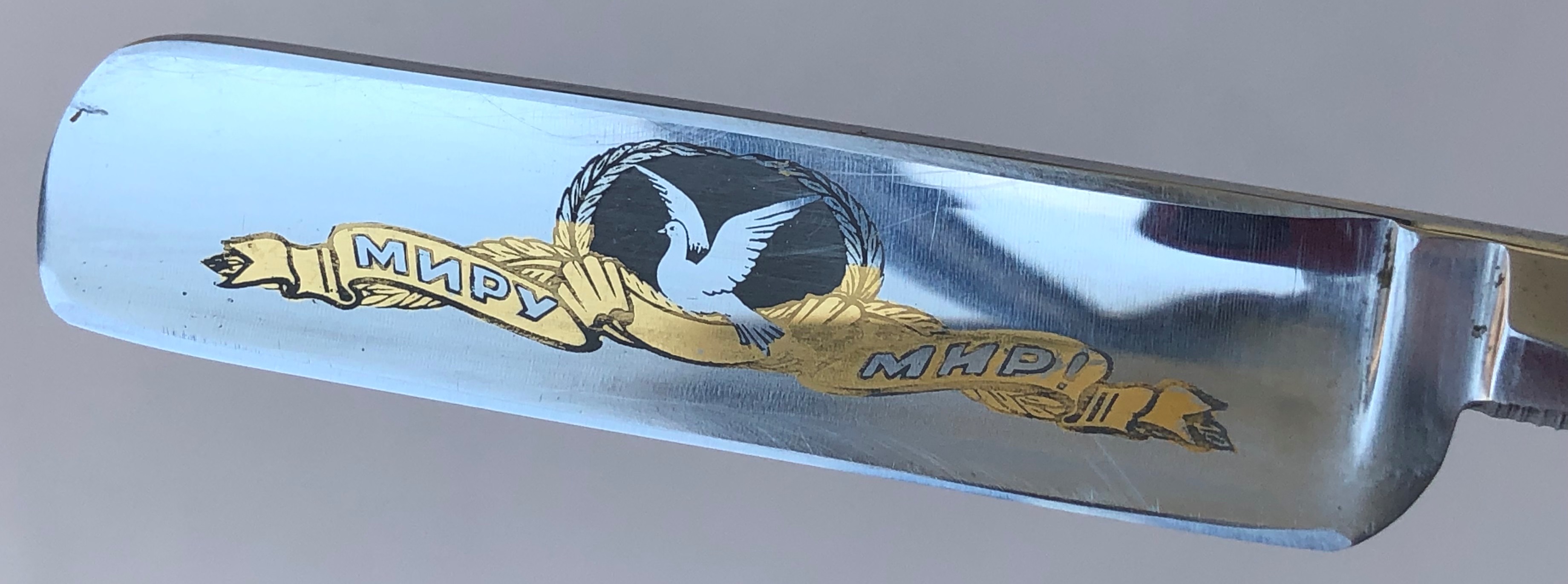 Бритва в очень хорошем и малопользованном состоянии.По всей видимости была однажды заточена и все. Небольшое количество еле заметных царапок под обушком имеются, но в основном очень все неплохо. Бритва не разбиралась и не ремонтировалась.Все заводское.Гравировка с голубем четкая, без потертостей.Также оригинальная коробочка 1959 года, что немаловажно! Я тут сравнил этот "ПОДАРОК" с "ГРАВЮРОЙ", с таким же изображением "МИРУ-МИР" и обратил внимание, что "ПОДАРОК" имеет более тонкое полотно,с более выраженной вогнутостью.А так,"ГРАВЮРЫ" попадаются заметно чаще."ПОДАРКОВ" практически нет, особенно в таком состоянии.