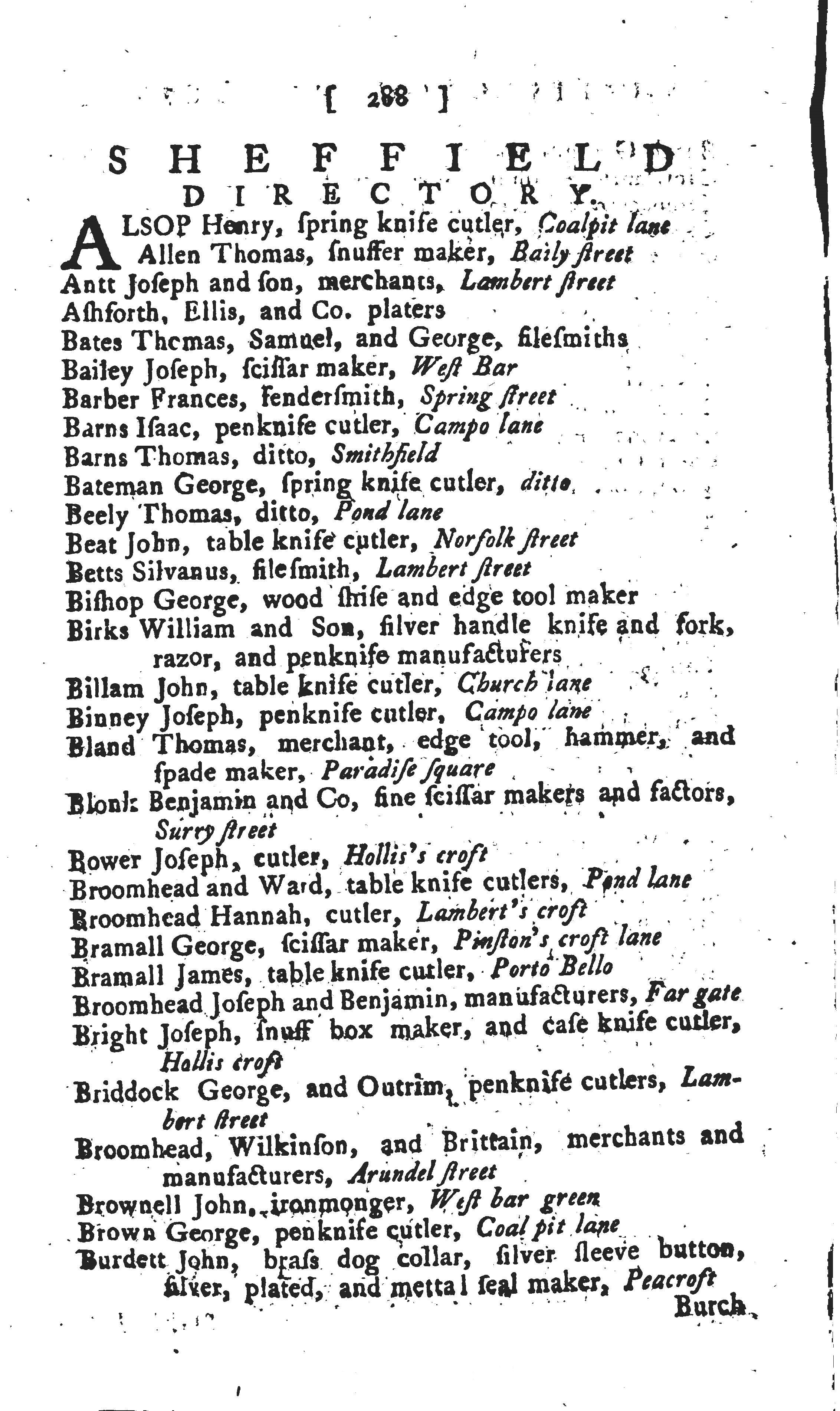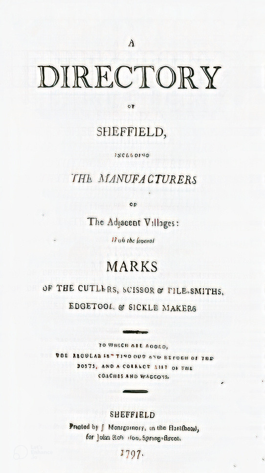1787, Гейлз и Мартин, Справочник Шеффилда, включая производителей соседних деревень. Очень старые английские бритвы (до 1810 года).1797, John Robinson, A Directory of Sheffield, Including the Manufacturers of the adjacent Villages.