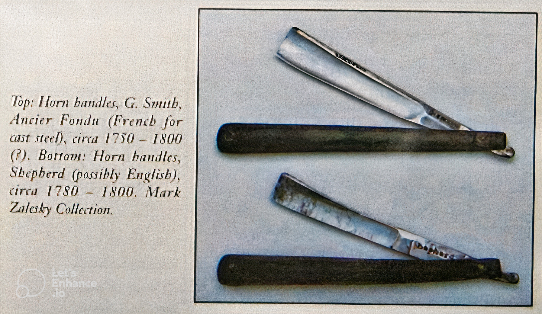 Торговая марка, крест и надпись "Smith". Ручка: черный рог, металлический наконечник. B. Дата 1780 год. Производитель, John Shepherd, Шеффилд, 1770-1795 годы. Торговая марка, корона и надпись "Wolf". Присутствует надпись "Acier fondu". Ручка: кость. C. Дата 1790. Производитель, Staniforth, Parkin & Co., Шеффилд, 1785-1800. Торговая марка "Parkin". Надпись "Acier fondu". Ручка: пестрый рог. D. Дата 1799. Производитель Clark & Hal, Шеффилд, 1797-1823. Надпись "Clark & Hall, cast steel" Ручка: пятнистый рог. Клинок травлен цветочным узором. E. Дата 1801. Производитель Samuel Norris, Шеффилд, 1795-1815. Торговая марка, звезда и "P". Надпись,"cast steel". Ручка, желтый рог. F. Дата 1810. Производитель William Greaves, Шеффилд 1780-1816. Надпись "W. Greaves, warranted". Ручка, черный рог, выдавлен сюжет - охота на лис. Еще одна статья "More Old Razors", "Больше старых бритв" Генри Т. Ламмуса была опубликована в 1927 году, в том же журнале ANTIQUES, в ней также были бритвы 18 века: 1. Дата 1770 г. Производитель неизвестен, но несомненно, Шеффилд, Англия. Торговая марка: трубка и буква N или Z. Рукоять: кость. Трубка в различных комбинациях использовалась в качестве товарного знака многими катлерами Шеффилда. 2. Дата 1775. Производитель John Brammal или Bramhall, местечко Storrs, близ Шеффилда (1770-1800). Торговая марка: Joppa. Надпись: "Bramall". Ручка: черный рог 3. Дата 1780 г. Производитель ohn Shepherd, Шеффилд (1770-1795). торговая марка: корона и волк. Рукоять: панцирь черепахи, металлические наконечники. 4. Дата 1785. Производитель Brittain, Wilkinson & Brownell, Шеффилд (1780-1840). Торговая марка: "France". Рукоять: красный рог. 5. Дата 1785. Производитель Thomas Warburton, Шеффилд (1770-1835). торговая марка: "Lisbon". Рукоять: черный рог, металлические наконечники. Очень старые английские бритвы (до 1810 года)."STANDARD GUIDE TO RAZORS, identification and values", third edition, Roy Ritchie and Ron Stewart. "СТАНДАРТНОЕ РУКОВОДСТВО ПО БРИТВАМ идентификация и ценности», третье издание, авторы Рой Ричи и Рон Стюарт: