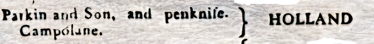 The family came from Howbrook, near Wortley. Joseph Parkin was Master Cutler in 1752. His sons included Josephus (c.1732-1812), James, and John (Clay, vol. IV, 18961). Apparently, Josephus purchased his Freedom in 1755. However, Parkin was a common name in the Sheffield cutlery trades and following this branch of the family in directories is confusing. Josephus Parkin appeared in the Sheffield directory (1774) as a cutler in Silver Street (one of a network of streets near the parish church). Josephus’ trade mark was an arrow head and the letter ‘L’. In the same directory, Parkin & Son was a manufacturer of razors and pen knives in nearby Campo Lane (trade mark ‘HOLLAND’).