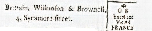 In 1774, Broomhead, Wilkinson & Brittain was a cutler and factor in Sycamore Street. Adam Broomhead (Broomhead, Hinchsliffe & Co) was apparently one partner. George Brittain (1740-1812) was another. So, too, was Jonathan Wilkinson (possibly). At some point, Jonathan France, a file smith of Blind Lane (who died on 10 December 1825, aged 74), was a partner. In 1784, Broomhead, Wilkinson & Brittain was dissolved. Later that year, George Brittain registered a silver mark ‘GB’ at Arundel Street and alongside Jonathan Wilkinson, Peter Brownell, and Joseph Ibberson launched a new cutlery partnership in his workshop. Ibberson dropped out and the next year a mark for ‘Brittain, Wilkinson & Brownill [sic]’, platers and silversmith, was registered (Bradbury, 19121). In 1785, a ‘Ring’ mark (picture) was registered for silver wares. Other marks used by the firm included: ‘BROOMHEAD’, ‘FRANCE’, ‘GB’ (with Maltese Cross), ‘FONDU’, and ‘EXCELLENT’.