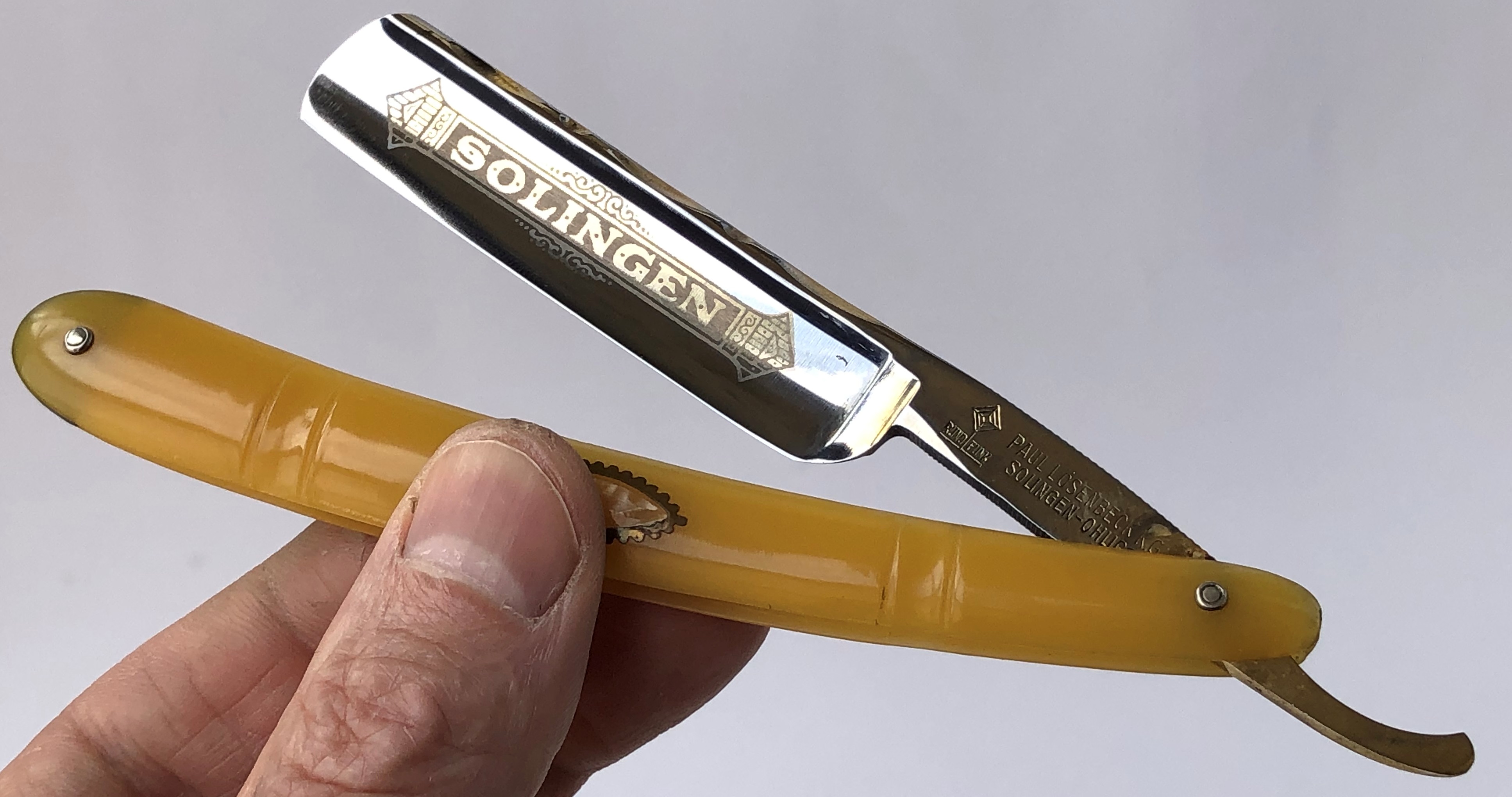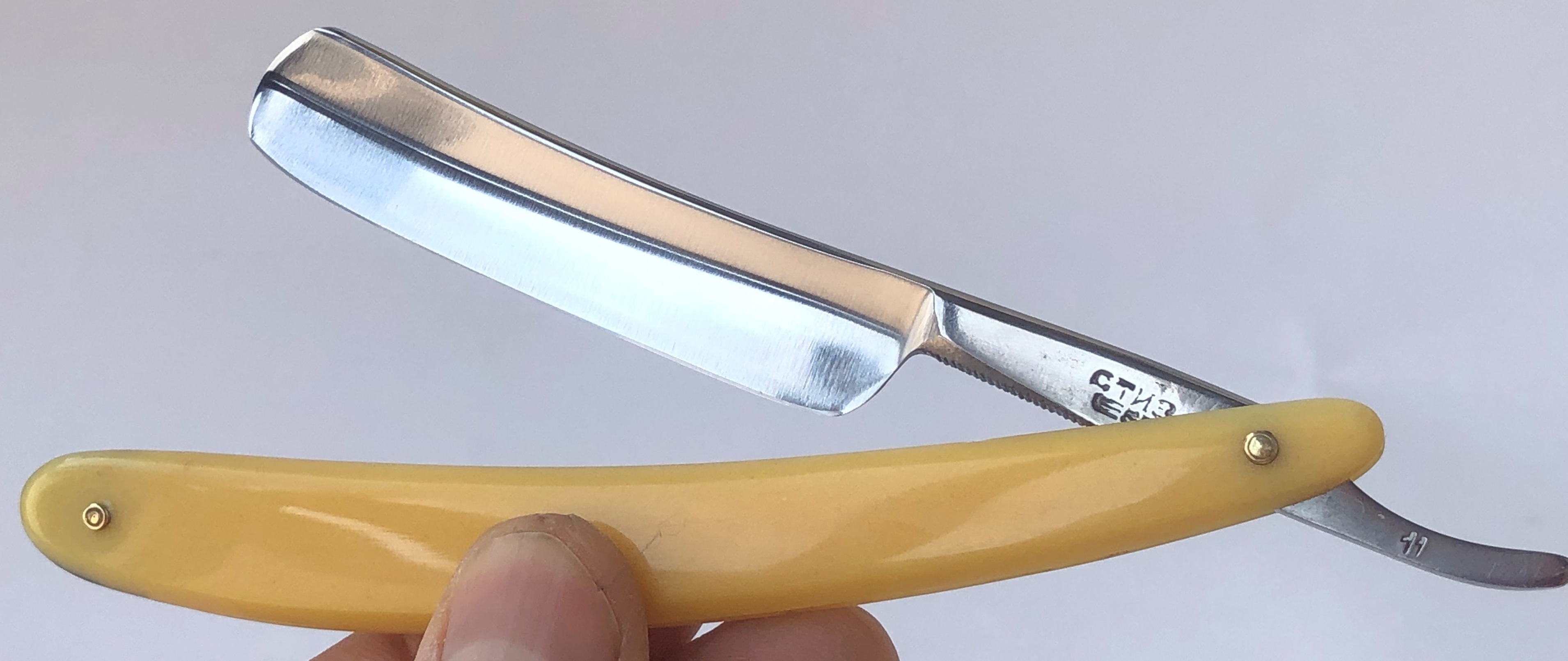 Убрал старинную патину, царапины и умеренно отполировал.Родной осевой пин был аккуратно заново установлен.Бритва в состоянии новой.Идеальная геометрия клинка:кромочка равномерна по всей длине.Бритва удобна во всех отношениях, хоть для новичка, хоть для опытного пользователя.Дорогой родной бакелитовый кейс в комплекте! Бритва заточена и готова к бритью.