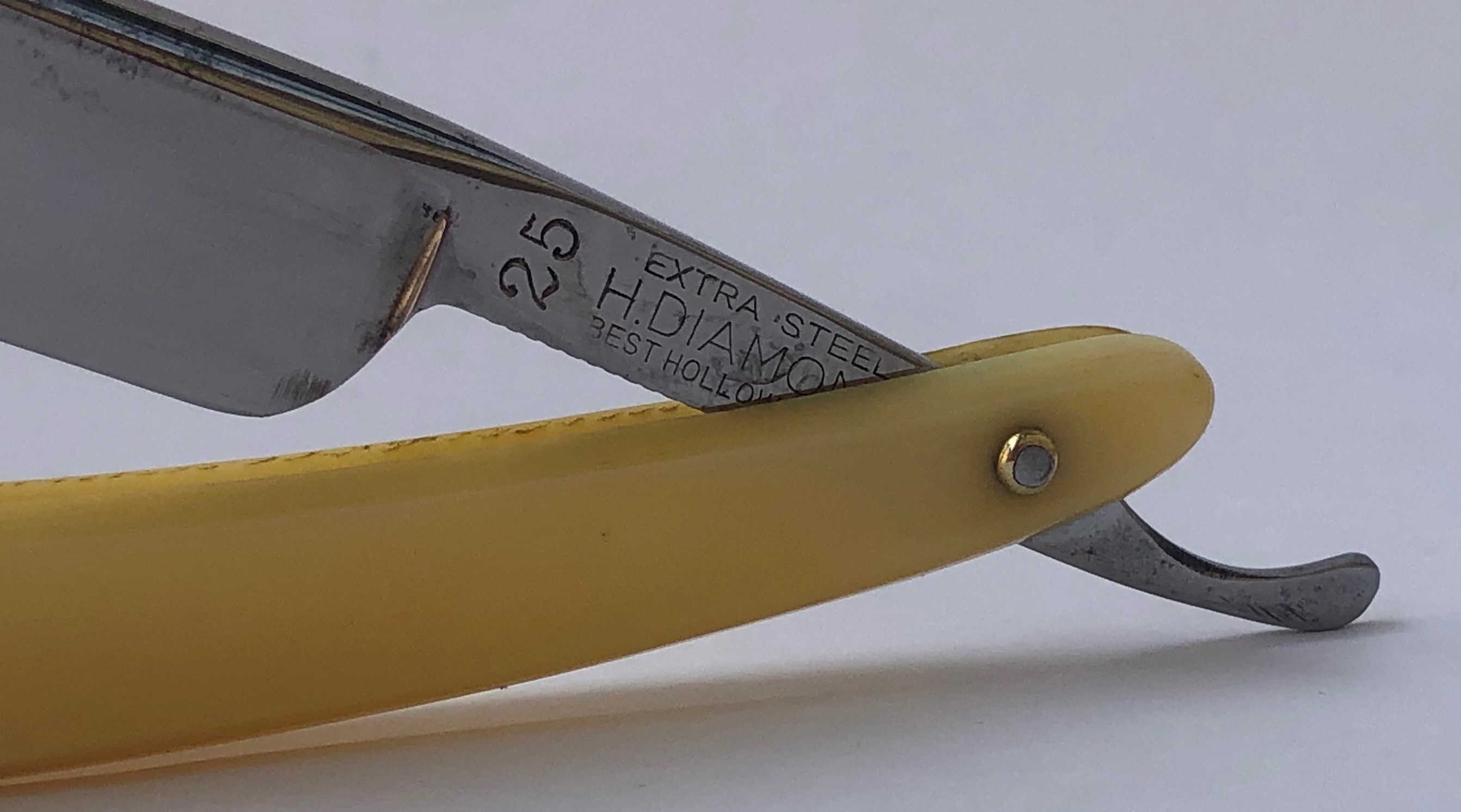 Клинок не ремонтировался.Оригинальная шлифовка и полировка.Ничего тут не делалось. Бритву разобрал для заметны пинов, так как родной осевой был неудачно поставлен, в связи с чем клинок закрывался криво.Еле заметные элементы патины не стал убирать, чтобы сохранить заводскую оригинальность клинка.Видимых дефектов не обнаружено.Бритва хоть и среднего размера, но достаточно тяжёлая, из за своей формы лезвия.Идеальная геометрия полотна:кромочка равномерна по всей длине и еле заметна.Заточена и готова к бритью.