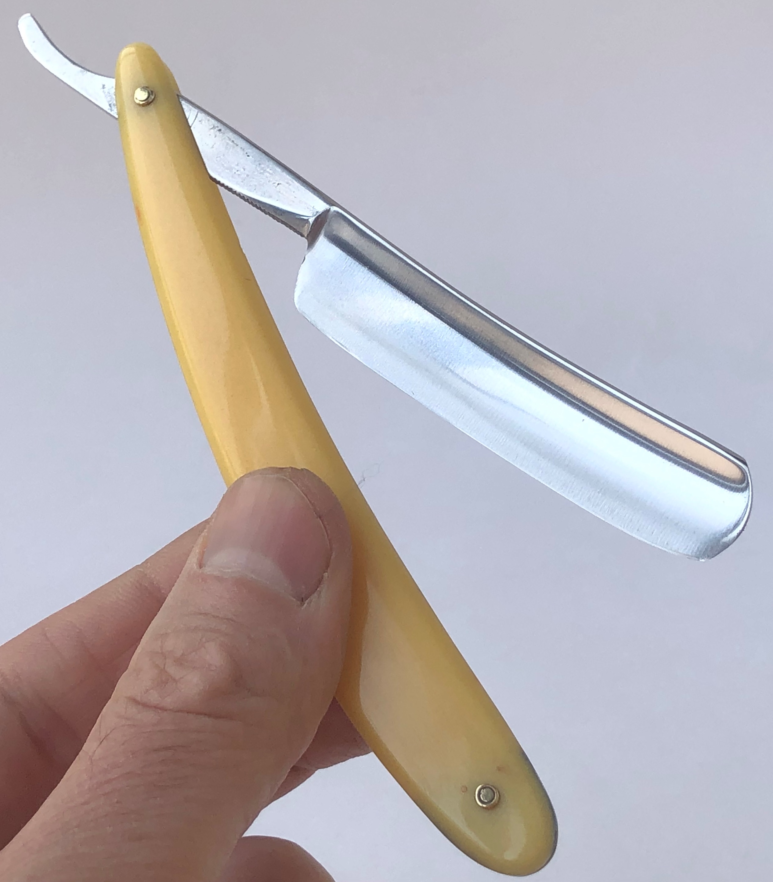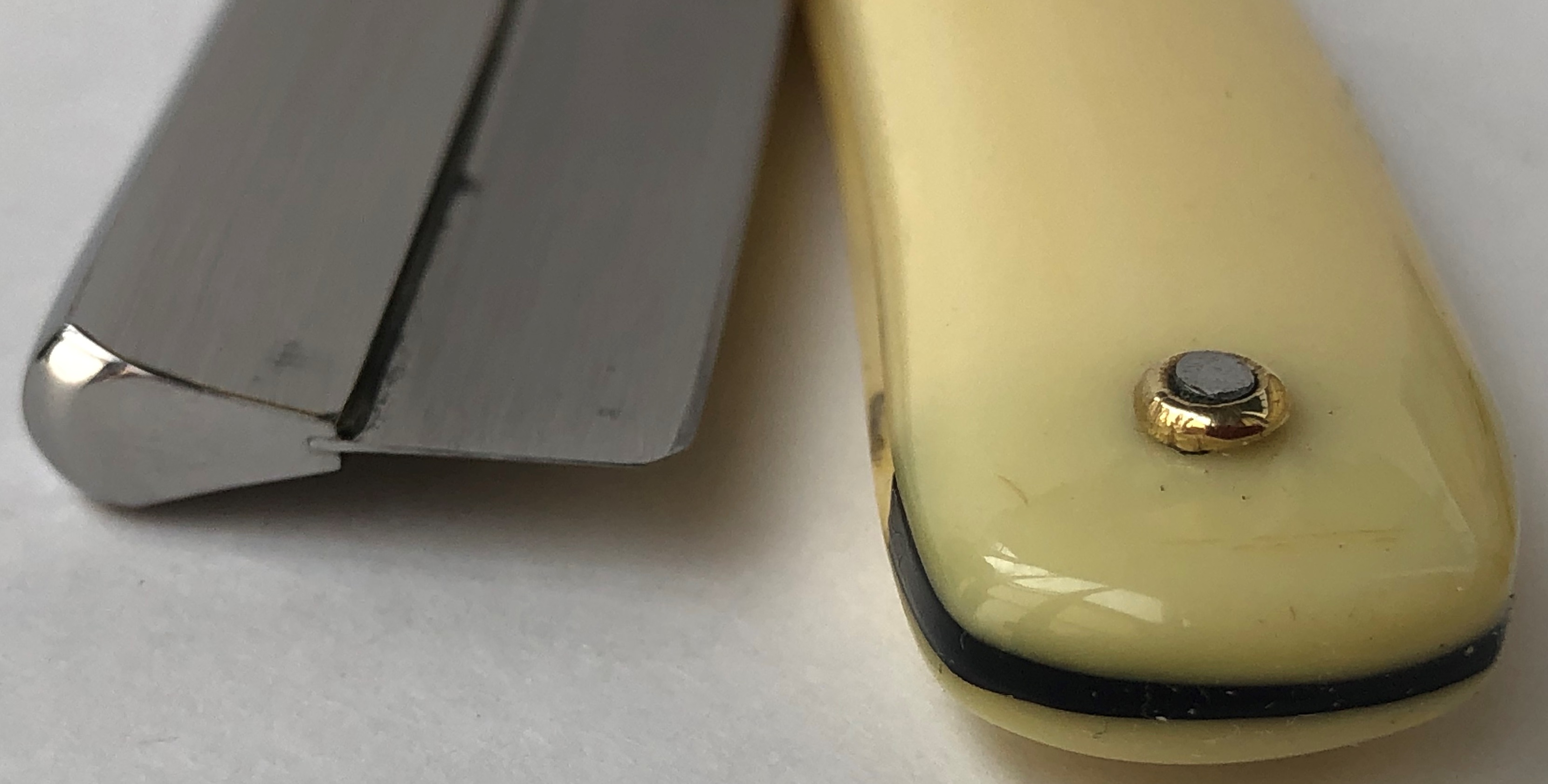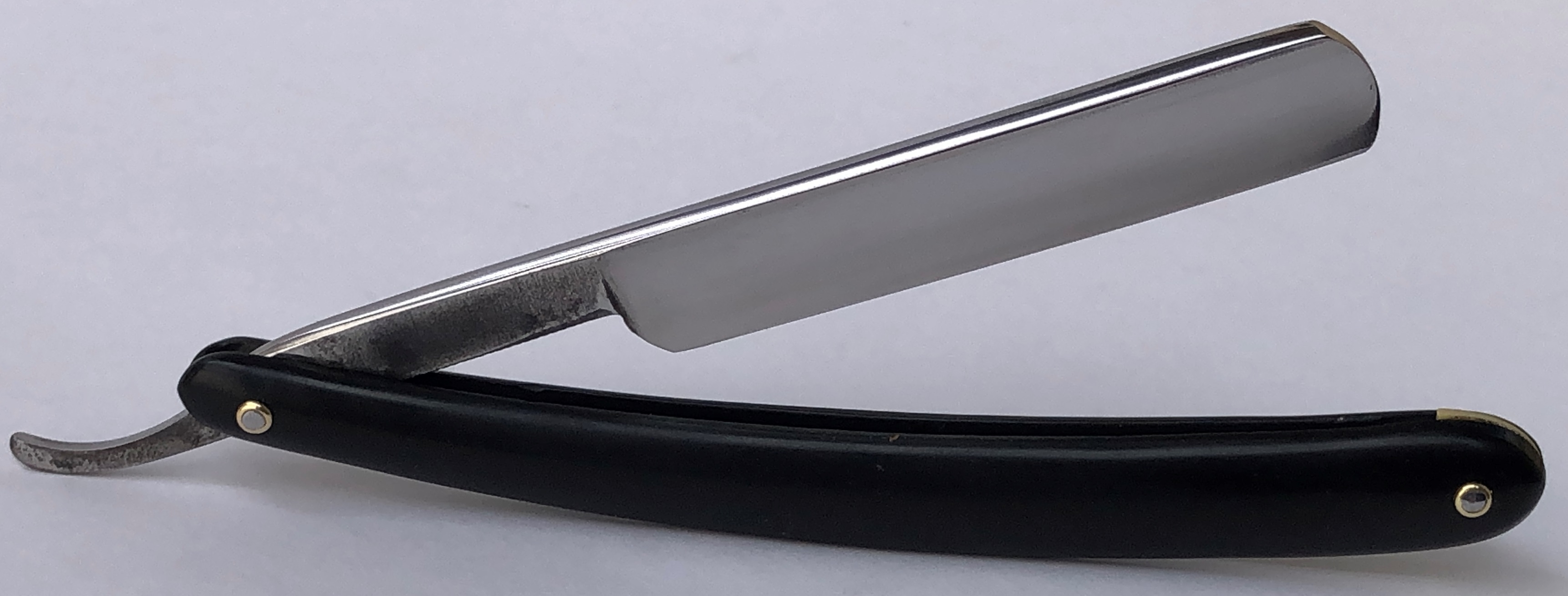 Убрал старинную патину, царапины и умеренно отполировал.Родной осевой пин был аккуратно заново установлен.Бритва в состоянии новой.Идеальная геометрия клинка:кромочка равномерна по всей длине.Бритва удобна во всех отношениях, хоть для новичка, хоть для опытного пользователя.Дорогой родной бакелитовый кейс в комплекте! Бритва заточена и готова к бритью.