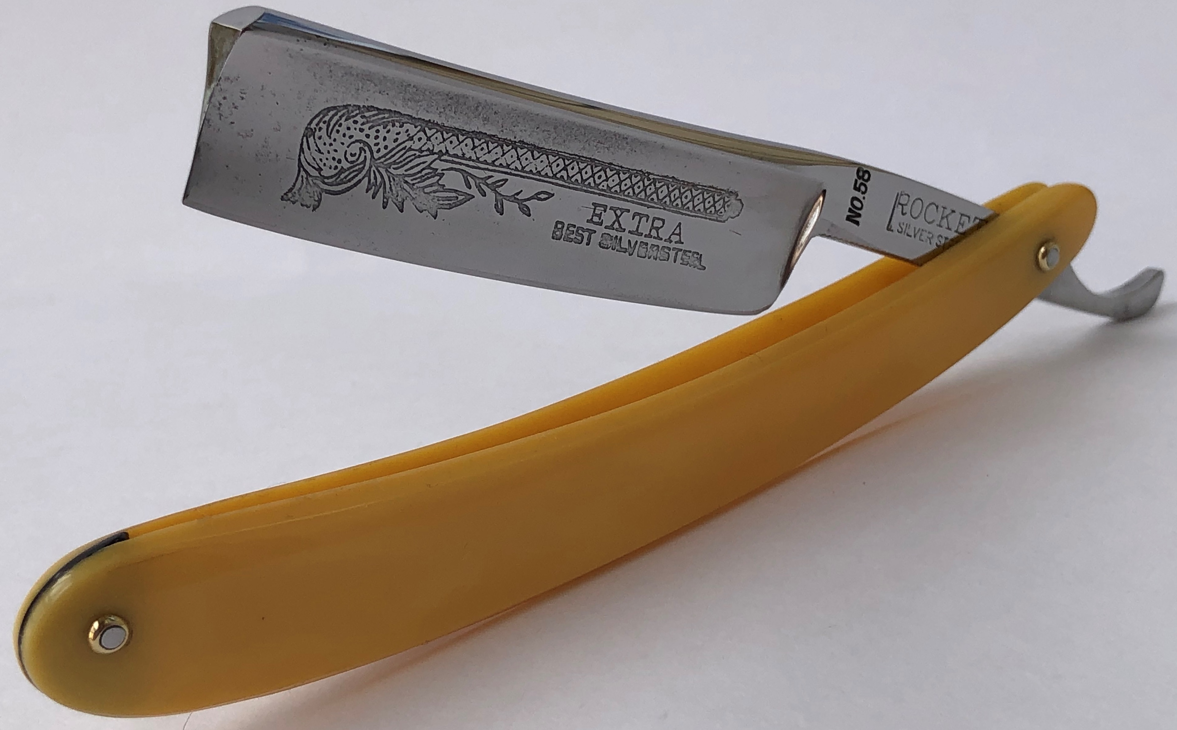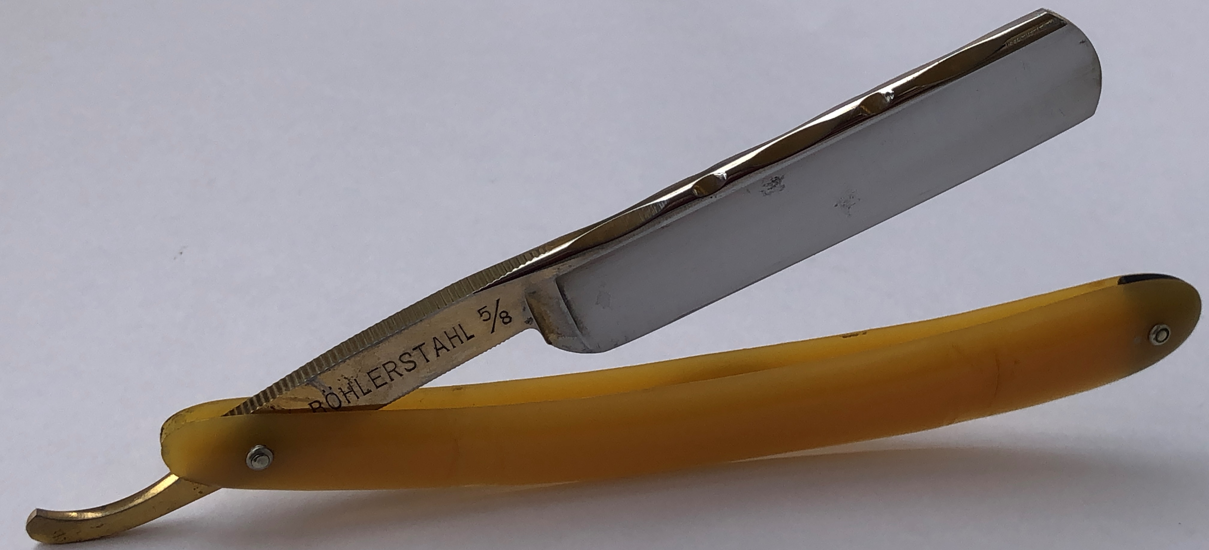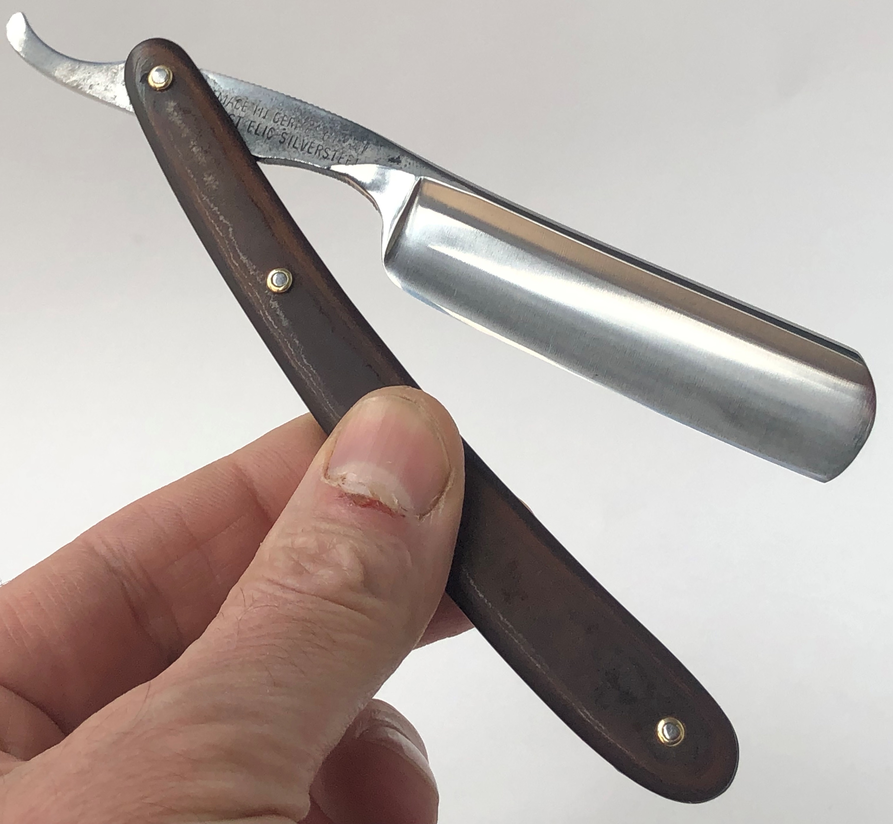 Убрал старинную патину, царапины и умеренно отполировал.Родной осевой пин был аккуратно заново установлен.Бритва в состоянии новой.Идеальная геометрия клинка:кромочка равномерна по всей длине.Бритва удобна во всех отношениях, хоть для новичка, хоть для опытного пользователя.Дорогой родной бакелитовый кейс в комплекте! Бритва заточена и готова к бритью.