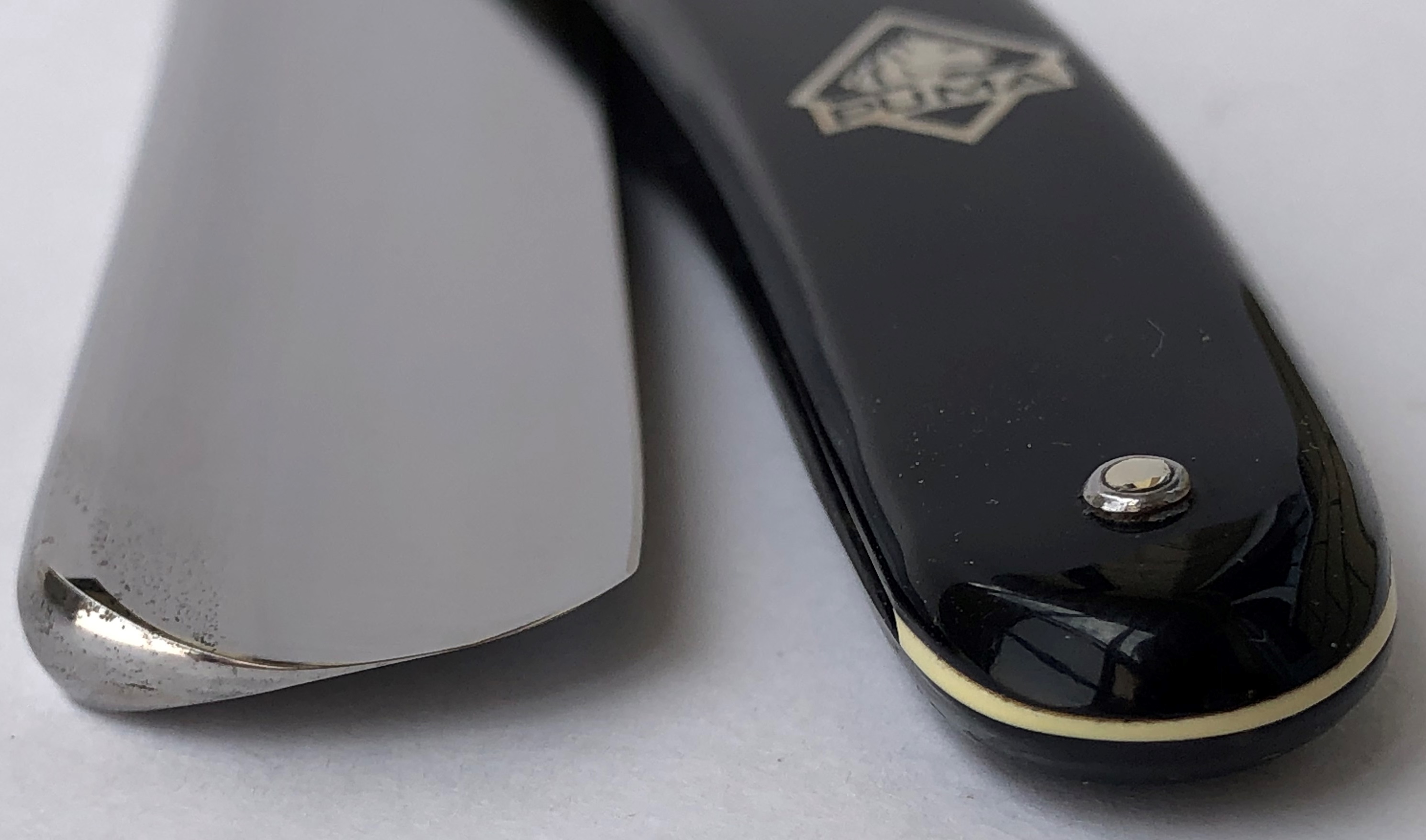 Клинок не ремонтировался.Оригинальная шлифовка и полировка.Ничего тут не делалось. Бритву разобрал для заметны пинов, так как родной осевой был неудачно поставлен, в связи с чем клинок закрывался криво.Еле заметные элементы патины не стал убирать, чтобы сохранить заводскую оригинальность клинка.Видимых дефектов не обнаружено.Бритва хоть и среднего размера, но достаточно тяжёлая, из за своей формы лезвия.Идеальная геометрия полотна:кромочка равномерна по всей длине и еле заметна.Заточена и готова к бритью.
