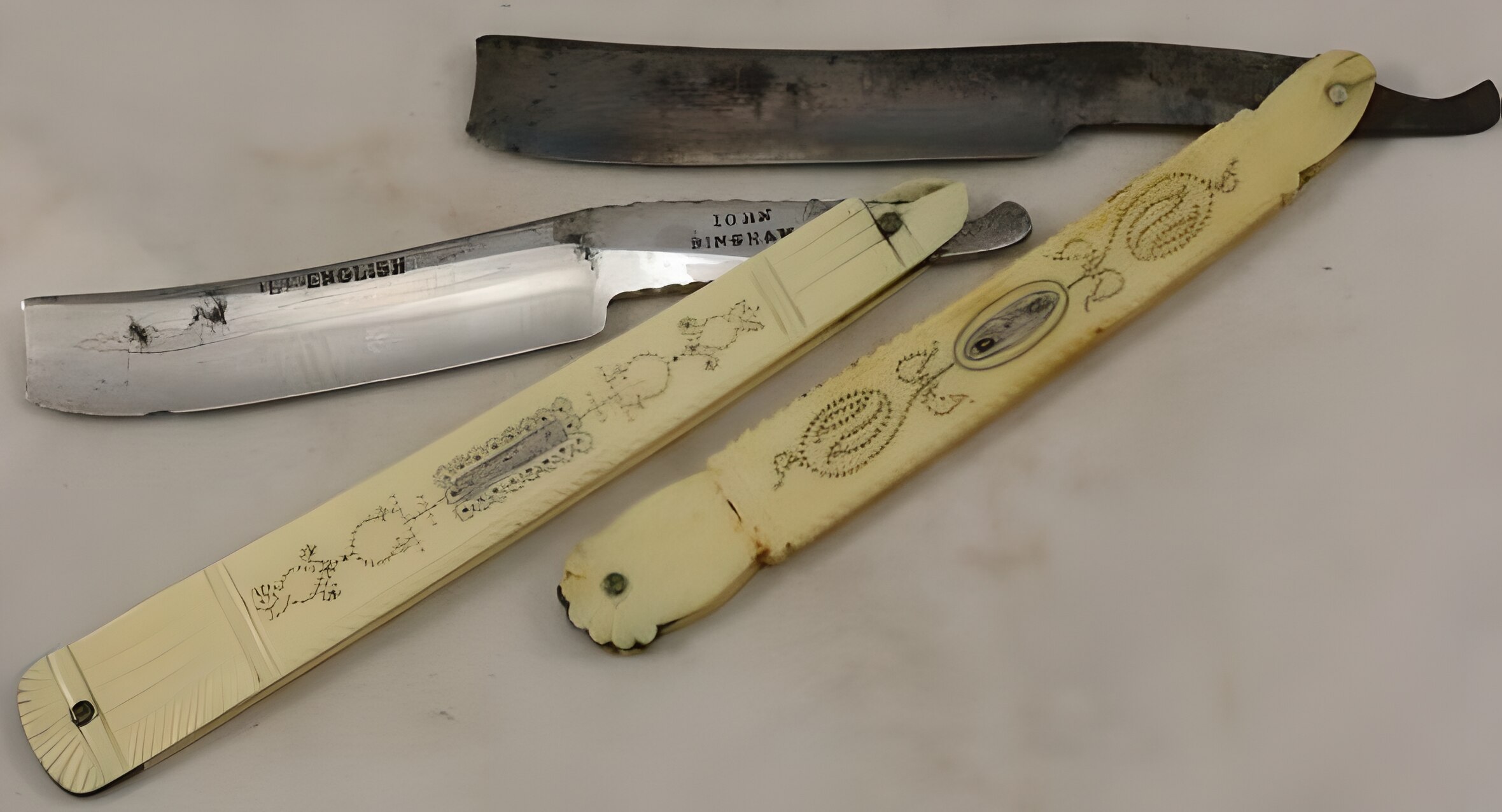Ручки (оправы) английских бритв из перламутра, черепахи, слонаДобыча слоновой кости в 19 веке была сложным и опасным делом, в романе Луи Анри Буссенара "Похитители бриллиантов. Опасные приключения трех французов в Южной Африке", написанном в 1883 году, есть сцена охоты на слонов (действие романа разворачивается около 1875 года):