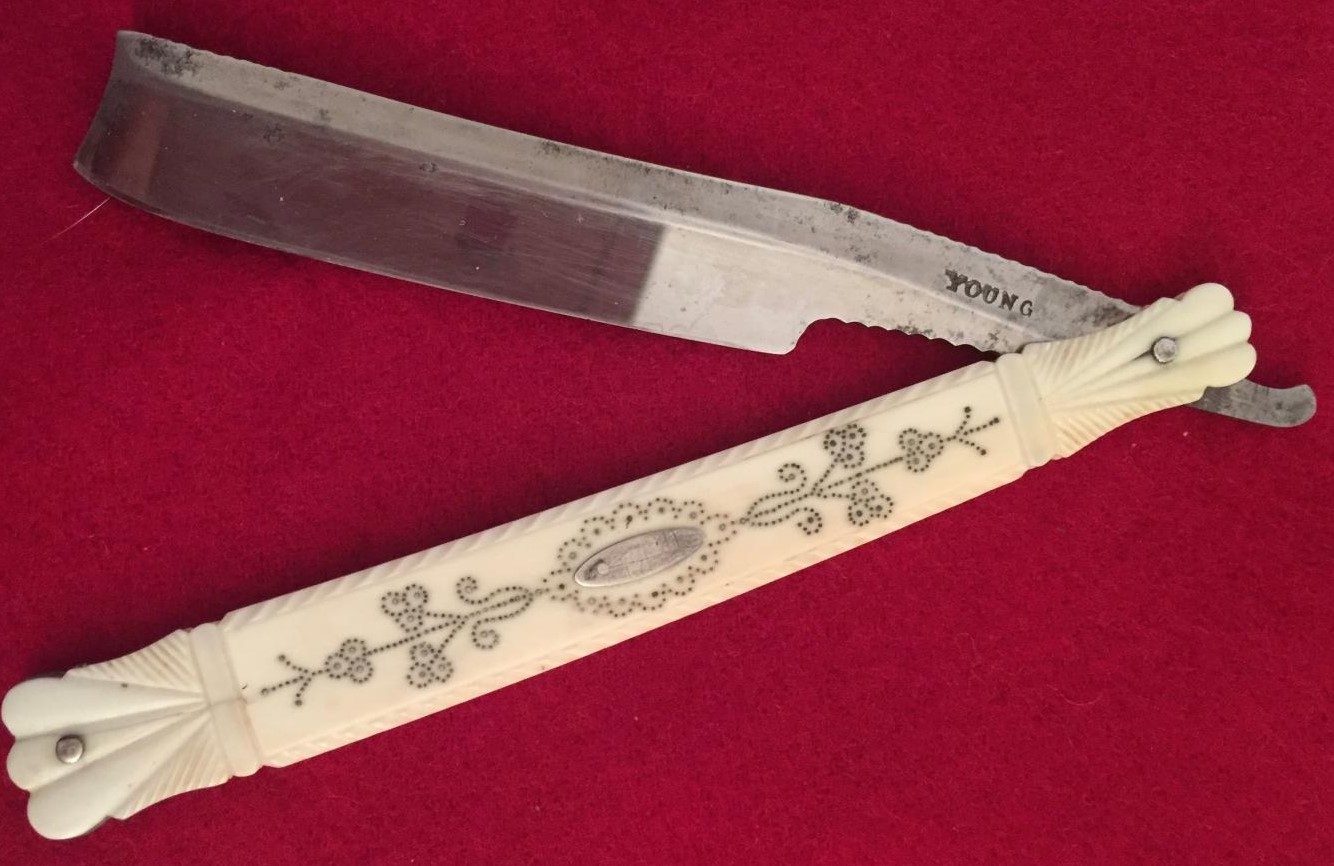 Ручки (оправы) английских бритв из перламутра, черепахи, слонаДобыча слоновой кости в 19 веке была сложным и опасным делом, в романе Луи Анри Буссенара "Похитители бриллиантов. Опасные приключения трех французов в Южной Африке", написанном в 1883 году, есть сцена охоты на слонов (действие романа разворачивается около 1875 года):