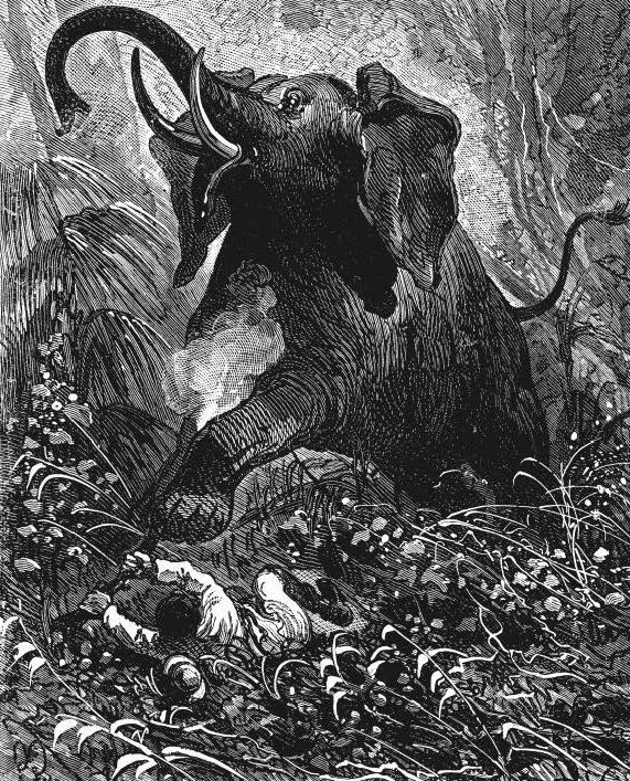 Spoiler Show "<>Слова «слон», «носорог», «бегемот» пробудили в наших трех французах охотничью страсть. Свалить такое огромное толстокожее, совершить такой ловкий и смелый поступок, осуществить эту мечту всякого цивилизованного Нимрода и вместе с тем сделать доброе дело – вот вам двойной соблазн, и они даже не подумали ему сопротивляться. Переводчик вызвался служить им проводником. Они согласились с понятной радостью и отправились немедленно, оставив черным слугам гладкоствольные охотничьи ружья и захватив крупнокалиберные карабины. После довольно трудного перехода, длившегося не меньше часа, они добрались до почти совершенно высохшей реки, куда обычно приходили на водопой крупные звери. Здесь кончается пустыня и лес подымается высокой зеленой стеной. Нечего и думать о том, чтобы пробраться в эти заросли верхом. Лошадей стреножили и оставили. Проводник советовал соблюдать абсолютную тишину. Скоро на водопой придут слоны. Они придут непременно. Видно сразу по свежим следам, что они сюда ходят. Охотники легли на землю, за деревьями, зарядили карабины и стали спокойно ждать. Не успели они, однако, приготовиться, как издалека в листве послышался шум, похожий на грохот приближающегося поезда. Сходство усилилось еще и благодаря размеренному покашливанию, напоминавшему пыхтение паровоза. Нетрудно было разобрать, что шум идет со стороны чащи, из глубоких проломов, ведущих к реке. Альбер де Вильрож лежал ближе других. Он приподнялся на локтях и увидел в пятидесяти метрах от себя огромного слона. Александр, расположившийся вправо от своего друга, вскоре заметил на полянке еще восемь слонов. Они шли через поляну гуськом. По их массивным формам, огромной величине, по могучим бивням Александр узнал самцов. Девятый слон, чуть поменьше, замыкал шествие. Это была беззубая самка. Таких буры зовут «cari cop» –«голая голова». Смелые охотники зачарованы. Они любуются гигантами, шагающими с той уверенностью, право на которую им дает непомерная мощь. Слоны двигаются медленно и торжественно, сотрясая землю и ломая заросли мимозы и баугинии с непреодолимой силой снаряда. Выйдя к спуску, ведущему к воде, они имели совершенно фантастический вид. Александр выжидал удобной минуты, чтобы выстрелить. Плотно прижавшись к земле, согнув локти под прямым углом и крепко держа карабин в руках, как в сошках, он прицелился в третьего слона, выбирая точку между ухом и глазом. Альбер, столь же храбрый, но более горячий, вспомнил поучительные слова доктора Ливингстона: «Пусть тот, кто собирается стрелять слонов, станет посреди железнодорожной колеи, пусть он слушает свисток и убежит не раньше, чем поезд будет в двух-трех шагах от него. Тогда он будет знать, позволяет ли ему его нервная система идти на слона». И в самом деле, нетрудно понять, как опасно тягаться с этим огромным животным, которое бегает, как лошадь в галопе, и не знает никаких препятствий. Этот гигант прорывается сквозь заросли, опрокидывает или ломает все, что ему попадается на пути, вырывает хоботом из земли или растаптывает ногой, след которой имеет до двух метров в окружности, все, что может служить защитой его врагу, и ко всей этой грозной мощи присоединяет ужасный рев. Каталонец увидел, что все описания, которые он читал у знаменитых охотников, справедливы. Ни Левайян, ни Андерссон, ни Вальберг, ни Болдуин, ни