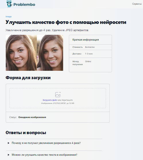Есть только ограничение на бесплатной версии до 15 фото в сутки. Интерфейс простой: По кнопке "Загрузите файл" добавляем фото, обработка начнется автоматически, ждем секунд 30, после завершения нажимаем кнопку "Загрузить улучшенную копию изображения". Результат: До: После: