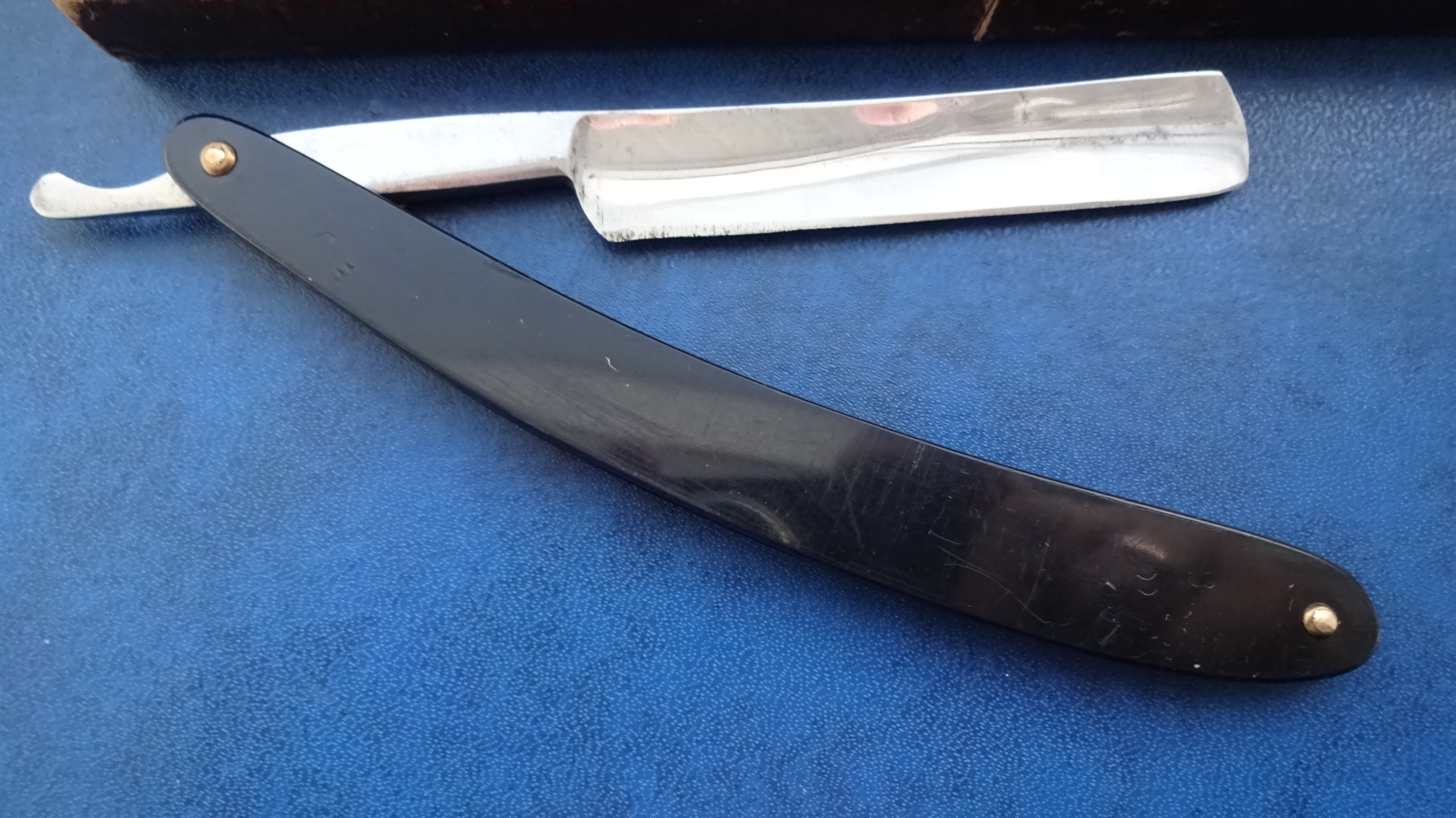 Получил вчера бритвочку *Арт.Бритва*.Убитая немного,но интересная.Клеймо такое еще не встречалось-модель 75.Год выпуска не указан,пластик на рукоятке светлый очень,даже какой-то розоватый.Стоит клеймо 2с.Предполагаю,второй сорт из-за замина на обушке сверху(как бы приплюснут)и эрль немного отклонен от лезвия с сторону,хотя само лезвие ровненькое,т.е.геометрия его вполне нормальная.Видно,что от пасты лезвие поуточилось местами,да и следы наждака обнаружил.Обух-4.1мм,длина клинка-7,3мм.Ширина:пятка-15,2мм,самое уточеное место-14.3мм,носик-14,7мм.Интересен еще и клинышек.он абсолютно прямой.бритва,по моему мнению,не разбиралась,пины родные,медь.Я сначала разобрал,не подумал сфотографировать в неразобраном виде.Потом дошло только.