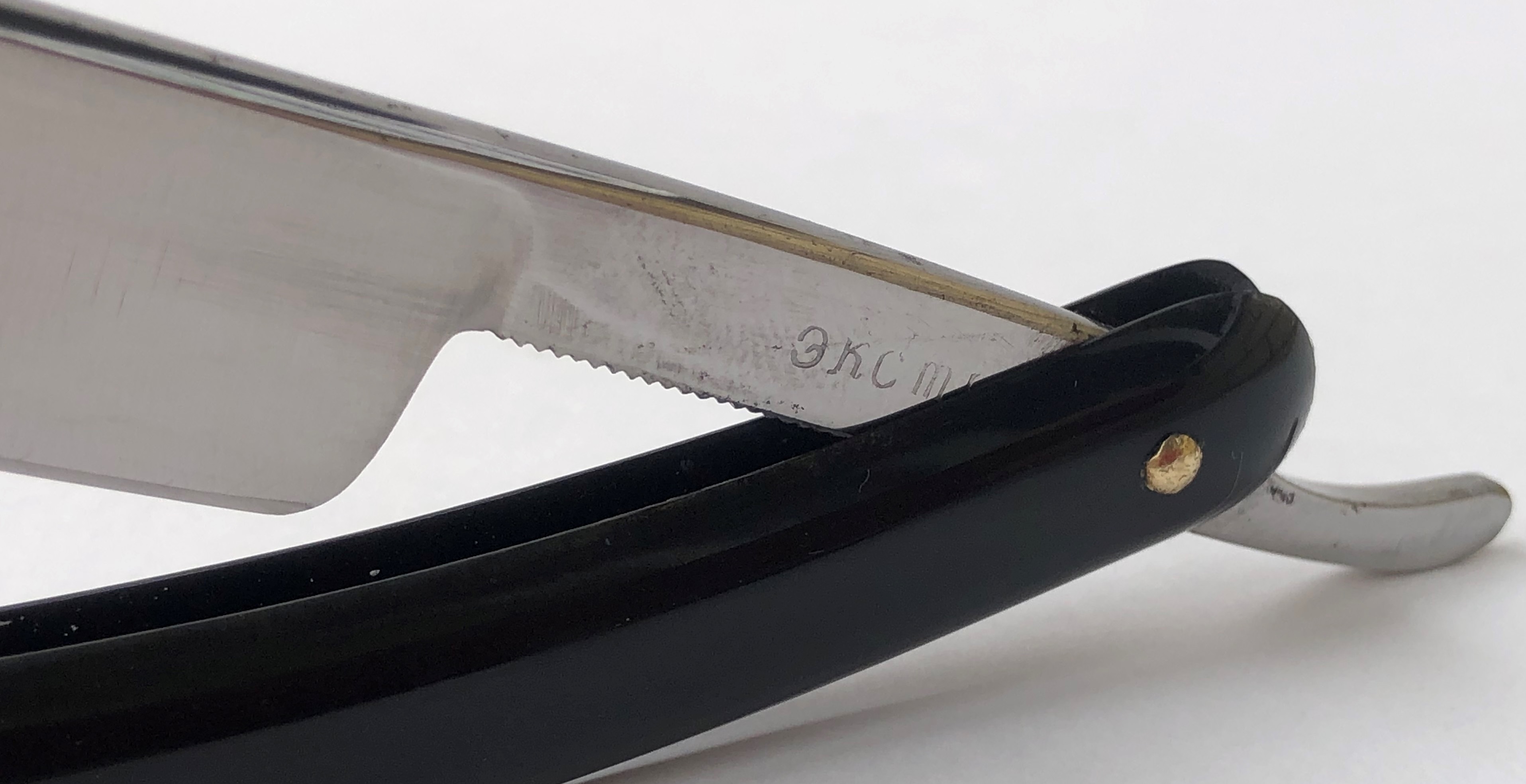 (Хотел обратить внимание на нечеткий штамп.Это заводской нюанс, а не стертость в результате чистки. Есть у меня в коллекции совершенно новая бритва с таким же дефектом, а также ранее попадались 2х-заковные с тем же самым.)