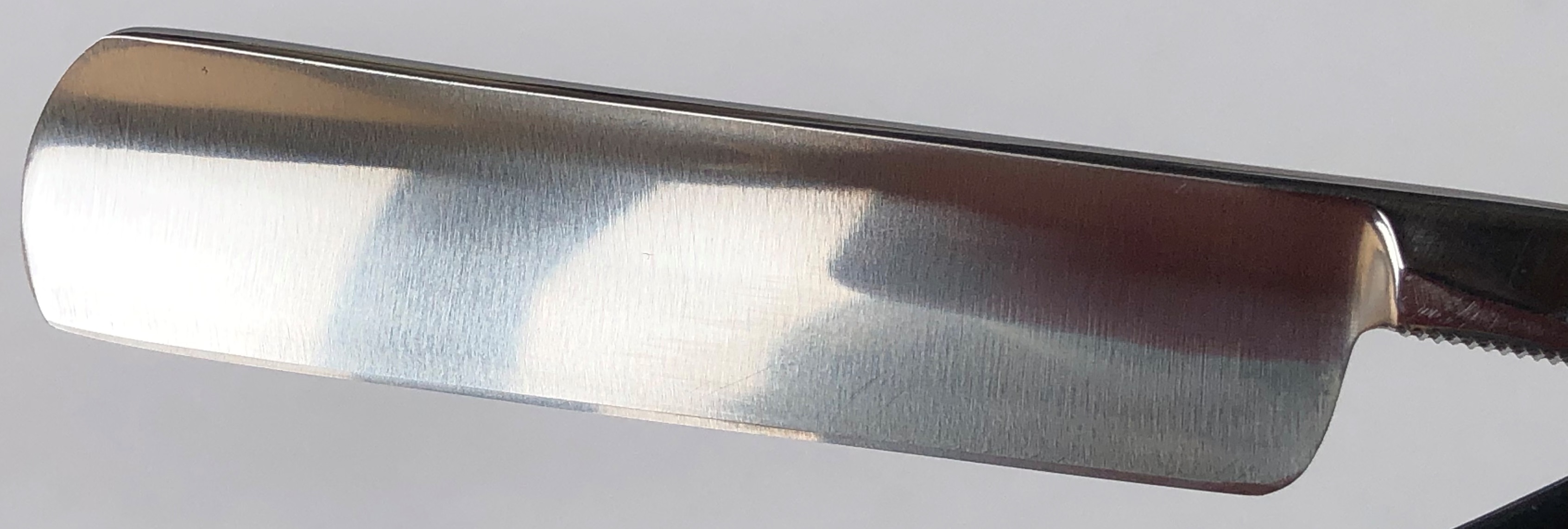 Внимание!Полотно имеет дефект. На удалении 8 мм от пятки имеется неглубокая микро-трещинка.Почти не видно на фото и на яву. При бритье не должна никоим образом беспокоить, так как эта часть полона практически не участвует в процессе.Трещинка "не гуляет" ,а сам клинок в районе кромки имеет достаточную жесткость. Поэтому принял решение подготовить бритву для использования. Бритва перед отправкой будет заточена и подготовлена в бритью.