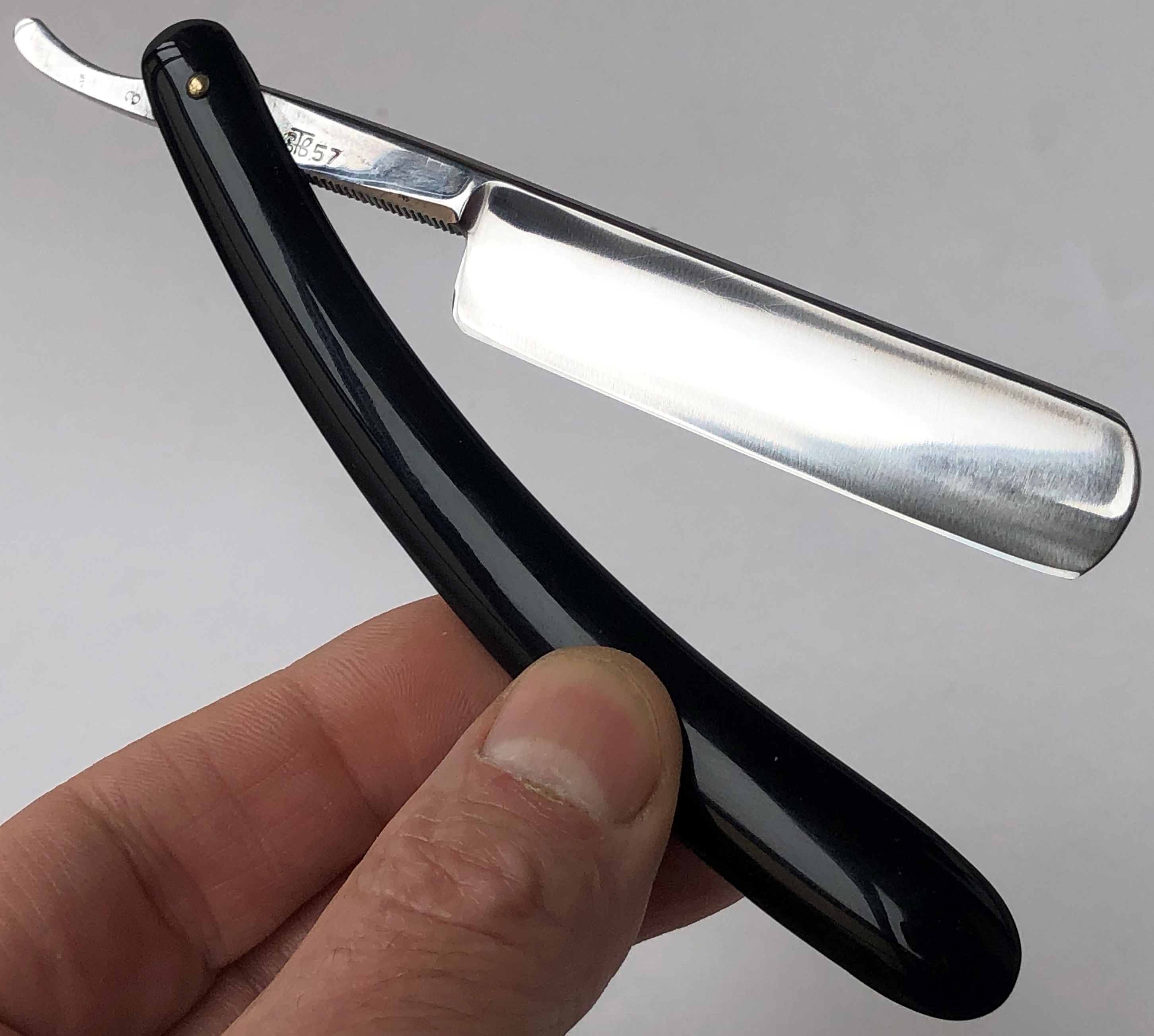Бритва без следов пользования и по всей видимости в работе еще не была.Разобрал, для удаления незначительных "следов времени" и заново собрал, сохранив родные пины , а также добавив внутренние шайбы, для порядка.Бритва в идеальном состоянии, практически как вчера с завода. Кромочка тоненькая.Эффектные и удобные пластиковые накладки на эрле, дают возможность не так ответственно следить за районом осевого пина после бритья и не пропустить образование ржавчины в этом месте. Эта модель немного легче своих "цельнометаллических" собратьев такого же размера, но ко всему можно привыкнуть, так что для кого то это станет преимуществом и бОльшим удобством, чем пользование обычной бритвой.А избыточно толстый обушок даёт возможность не выставлять угол атаки при бритье, а класть бритву плашмя на лицо и таким образом бриться с самым минимальным углом.Бритва заточена и лично протестирована. Напомнила мне английские бритвы с полной вогнутостью, начала 20-го века. Такая же комфортная сталь, средней твердости, с характерным "шелестом" сбриваемой щетины. После бритья кромочка прекрасно проходила тест на рез волоса на весу,без правки на ремне.