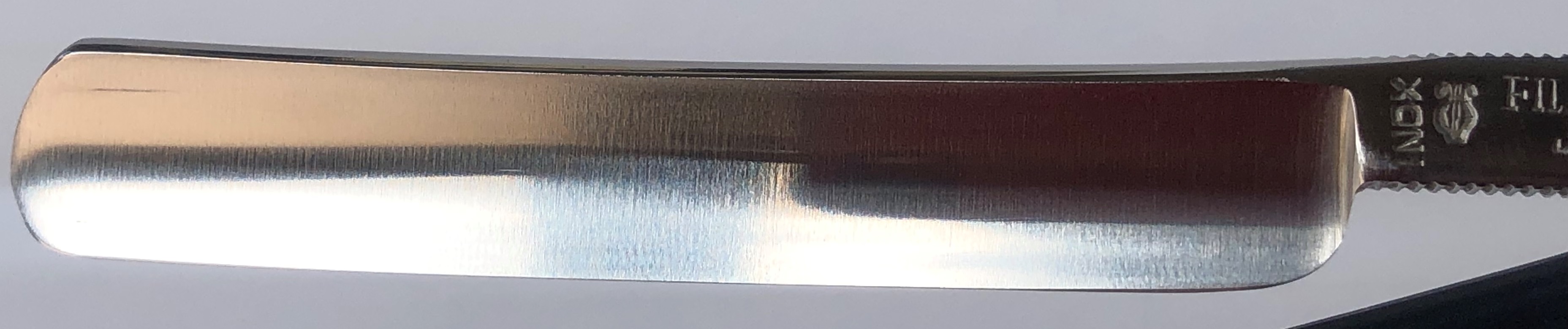 Клинок идеальный и ни разу не точился. Имеет оригинальную шлифовку и полировку полотна. Разобрал, чтобы установить внутренние шайбы и убрать радиальные царапины на эрле.Оригинальный пин установил обратно, так что сложно сейчас заметить.Можно сказать, что бритва как вчера с завода.Идеальная геометрия полотна:кромочка равномерна по всей длине.Родная коробочка того же 1958 года в комплекте!
