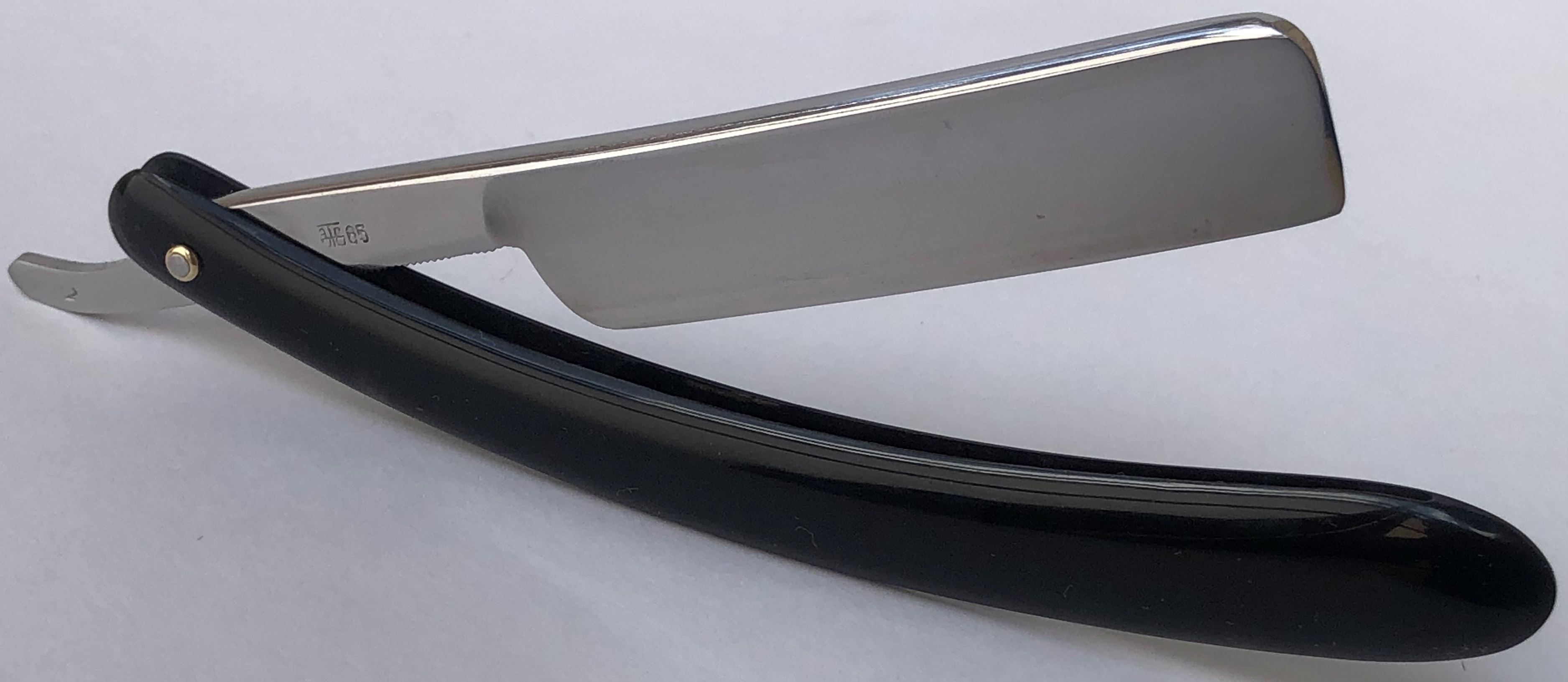 Клинок привел в порядок, убрал небольшую утОчку обушка, перешлифовал и умеренно отполировал."Cледы времени" в районе осевого пина оставил, для придания старинному клинку естественного вида.Родную ручку заменил на другую, пластиковую.Внутренние шайбы и новые втулки поставил.Кромочка ровненькая по всей длине.Парикмахерская метка. На мой взгляд, очень неплохая и недорогая бритва из прошлого.