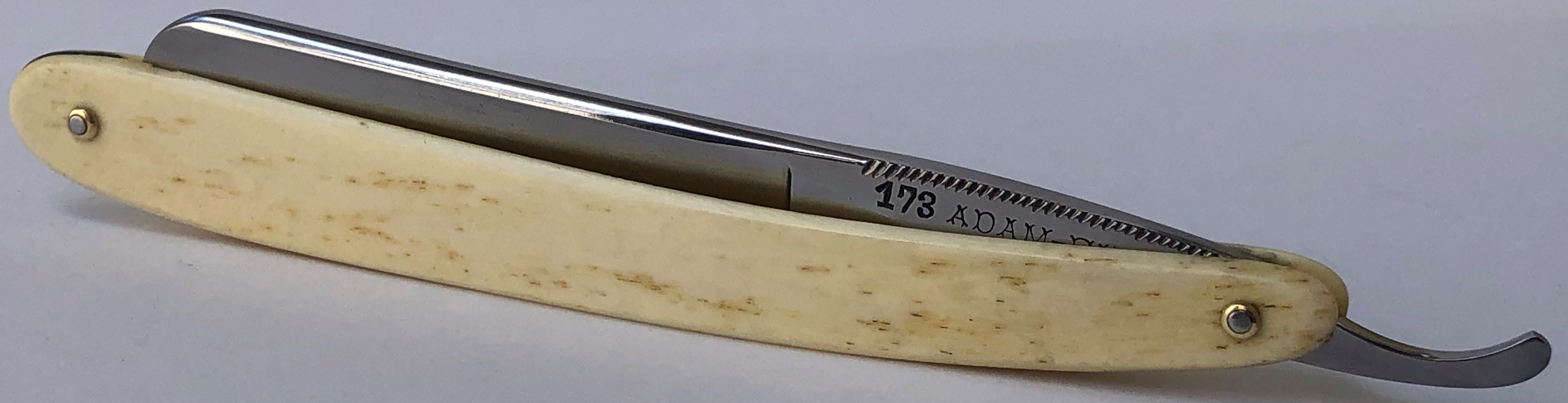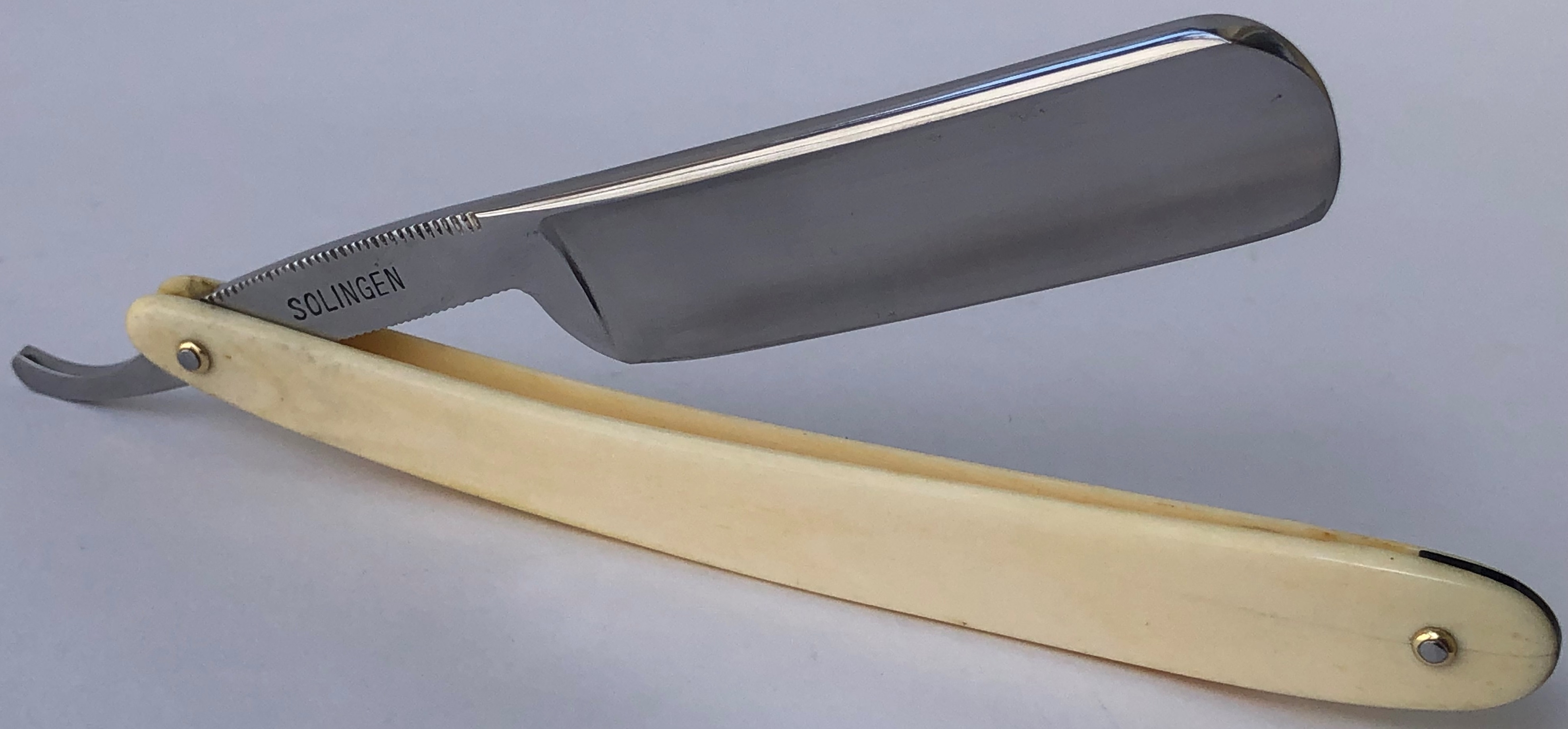 Бритва без признаков пользования. Клинок был немного освежён от следов древней патины.Идеальная геометрия полотна. Кромочка равномерна по всей длине. Шикарная оправа из натуральной кости.Микротрещинка(практически незаметная) в районе нижнего пина была намертво проклеена в обеих сторон и никак не повредит дальнейшей эксплуатации.Новые двух-цветные втулки, а также внутренние шайбы.Достаточно тяжёлая бритва, с удобной формой лезвия, что очень хорошо ,особенно для новичка.На мой взгляд очень красивая бритва.