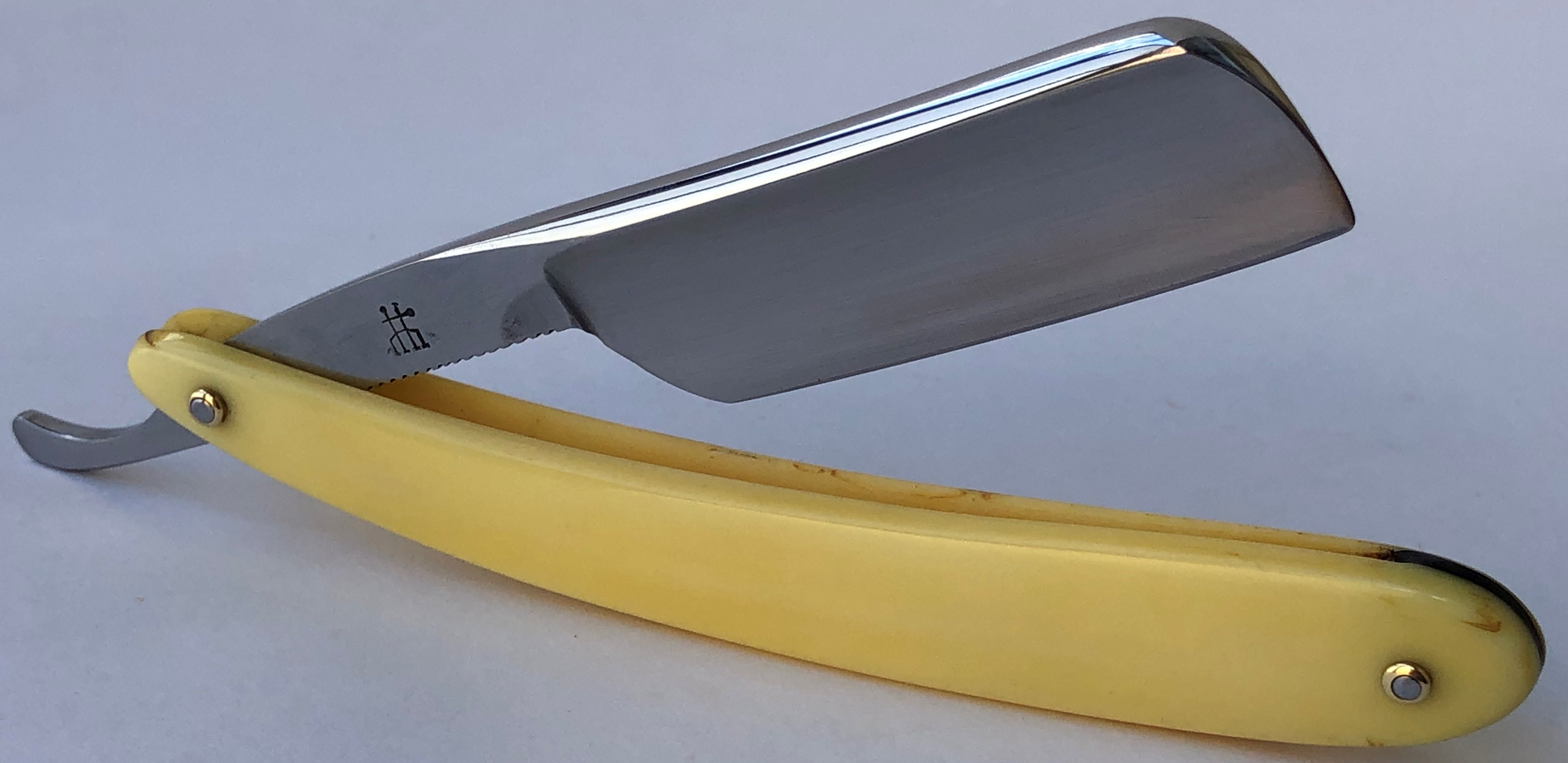 Привел в порядок старушку, так что послужит еще не один год.Немного откорректировал утОчку обушка, перешлифовал и умеренно отполировал.Пяточка совсем чуть задрана, на 0.5 мм, но не стал ничего больше исправлять, дабы сохранить драгоценный металл. Сталь чистая от разного рода видимых дефектов. Взамен сломанной оправы поставил ручку от другого древнего немца, сохранив также старинные пины.В общем и целом вполне живая и приятная бритва, с отличной , проверенной временем сталью. С учетом всего, бритва продаётся с 70-ти процентной скидкой от эталона.Не пропустите совершенно недорогой и легендарный экземпляр.