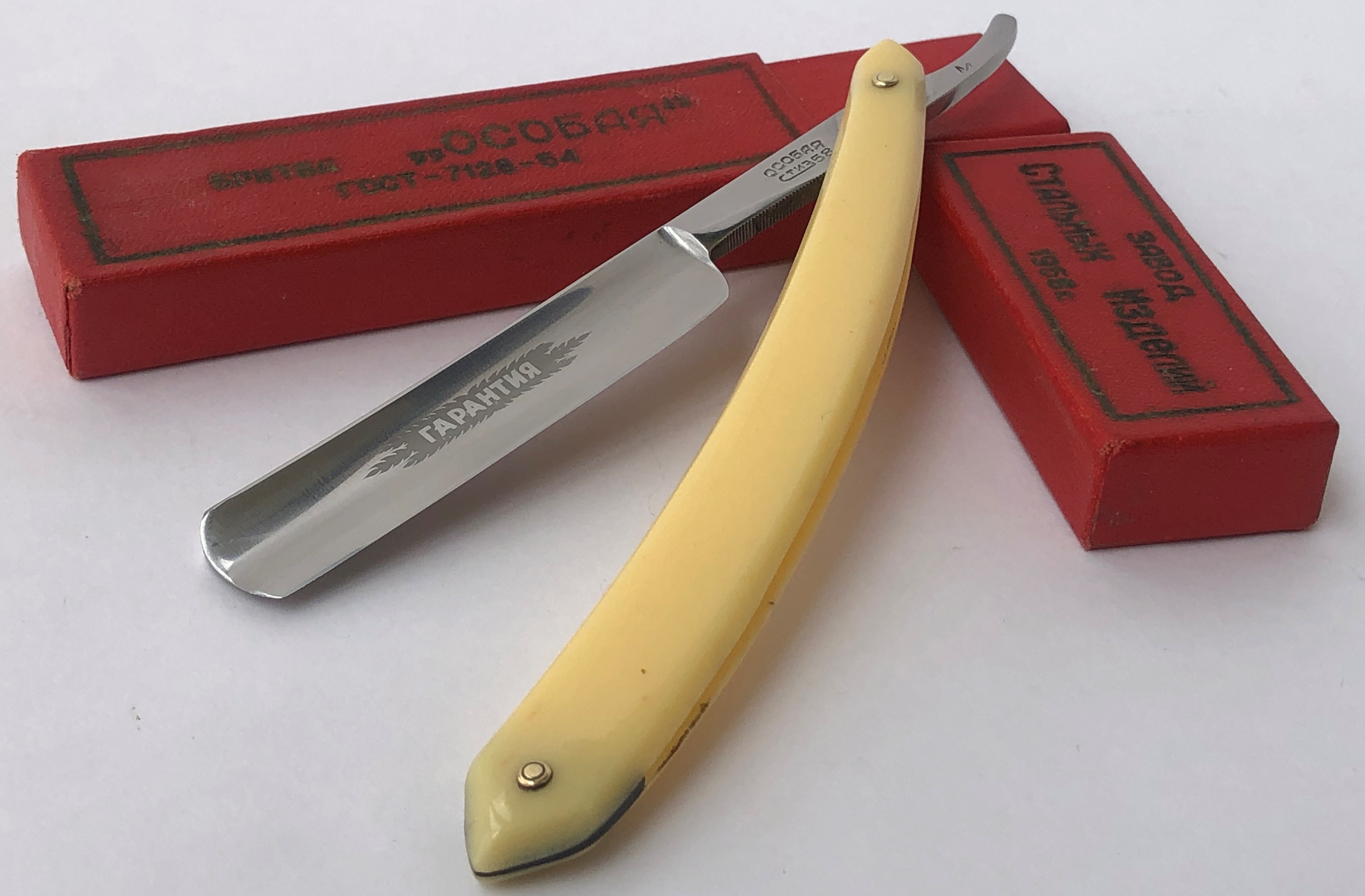 Клинок идеальный и ни разу не точился. Имеет оригинальную шлифовку и полировку полотна. Разобрал, чтобы установить внутренние шайбы и убрать радиальные царапины на эрле.Оригинальный пин установил обратно, так что сложно сейчас заметить.Можно сказать, что бритва как вчера с завода.Идеальная геометрия полотна:кромочка равномерна по всей длине.Родная коробочка того же 1958 года в комплекте!