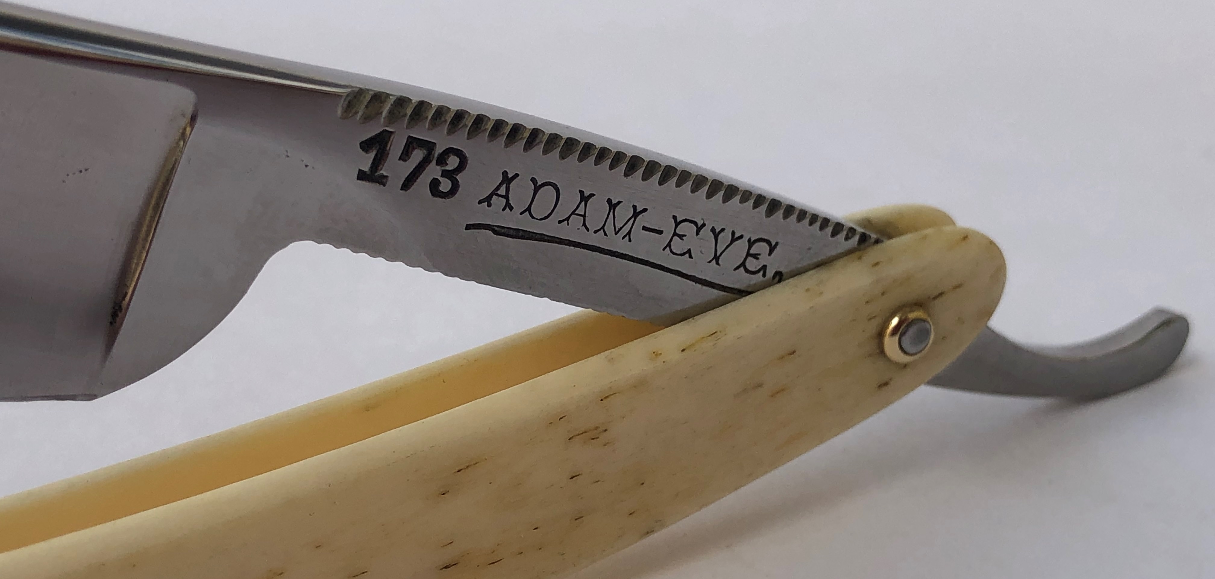 Бритва без признаков пользования. Клинок был немного освежён от следов древней патины.Идеальная геометрия полотна. Кромочка равномерна по всей длине. Шикарная оправа из натуральной кости.Микротрещинка(практически незаметная) в районе нижнего пина была намертво проклеена в обеих сторон и никак не повредит дальнейшей эксплуатации.Новые двух-цветные втулки, а также внутренние шайбы.Достаточно тяжёлая бритва, с удобной формой лезвия, что очень хорошо ,особенно для новичка.На мой взгляд очень красивая бритва.