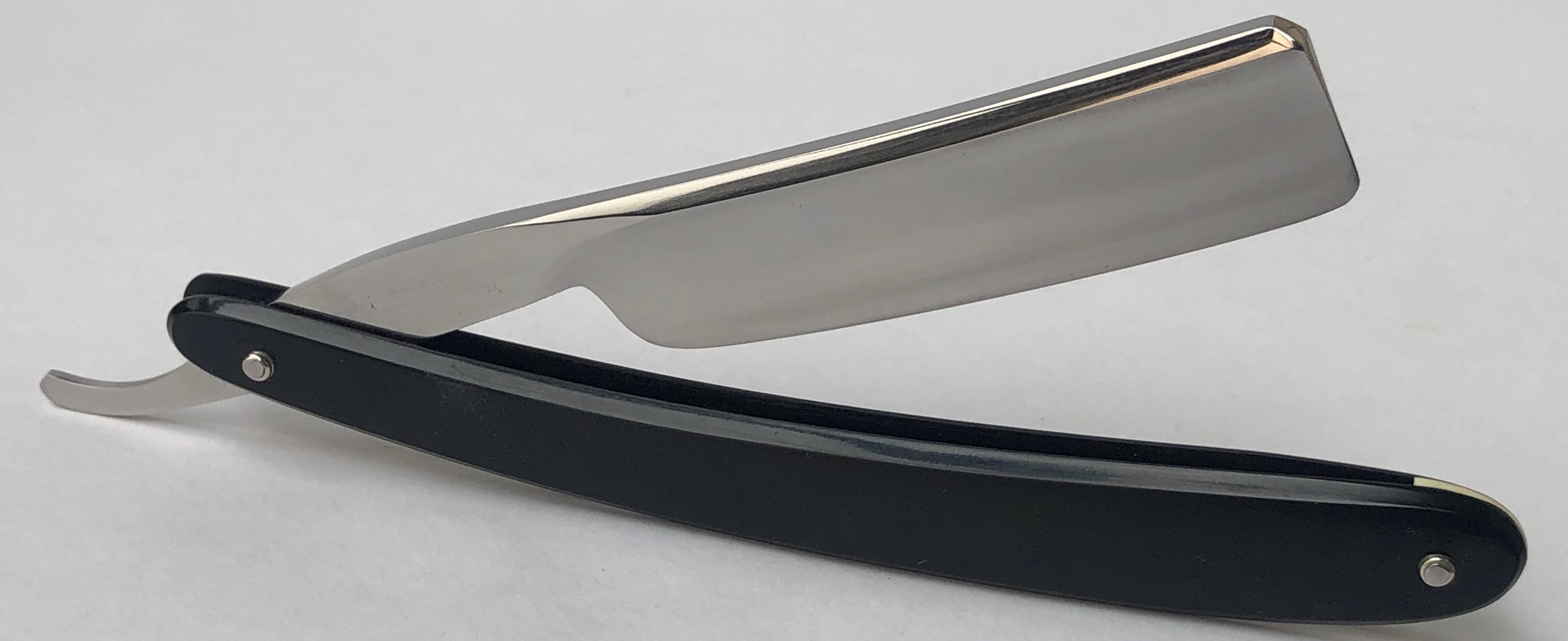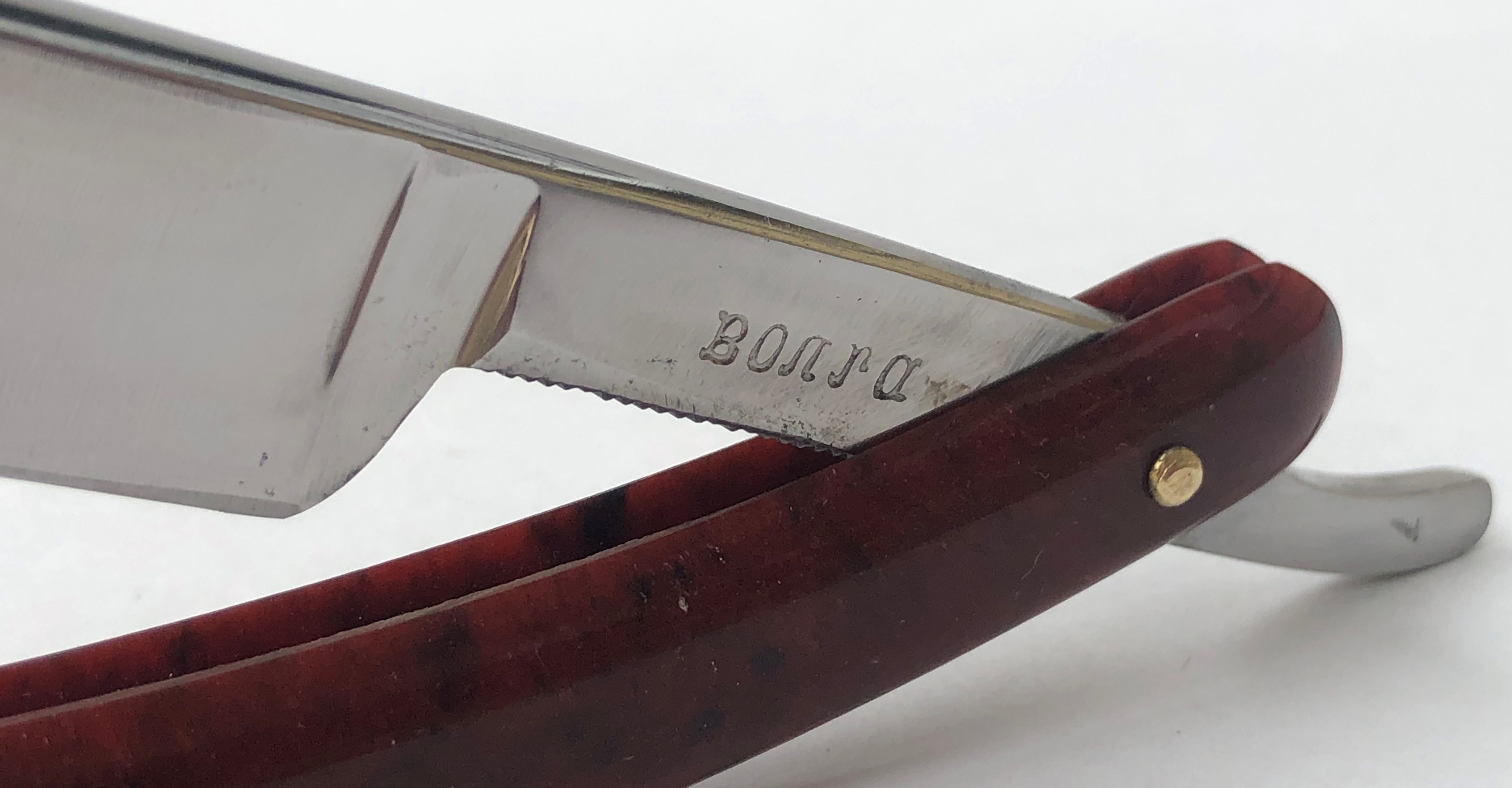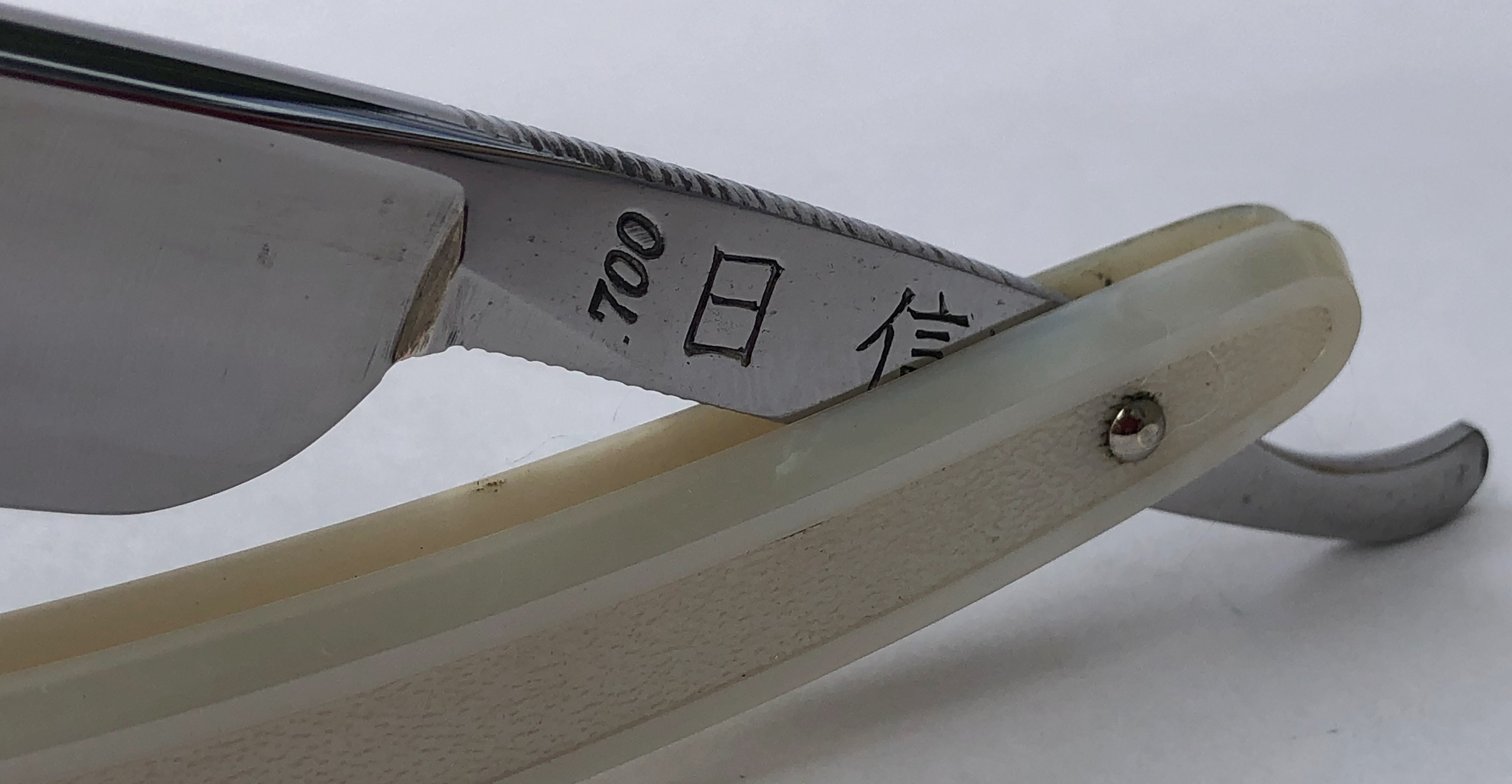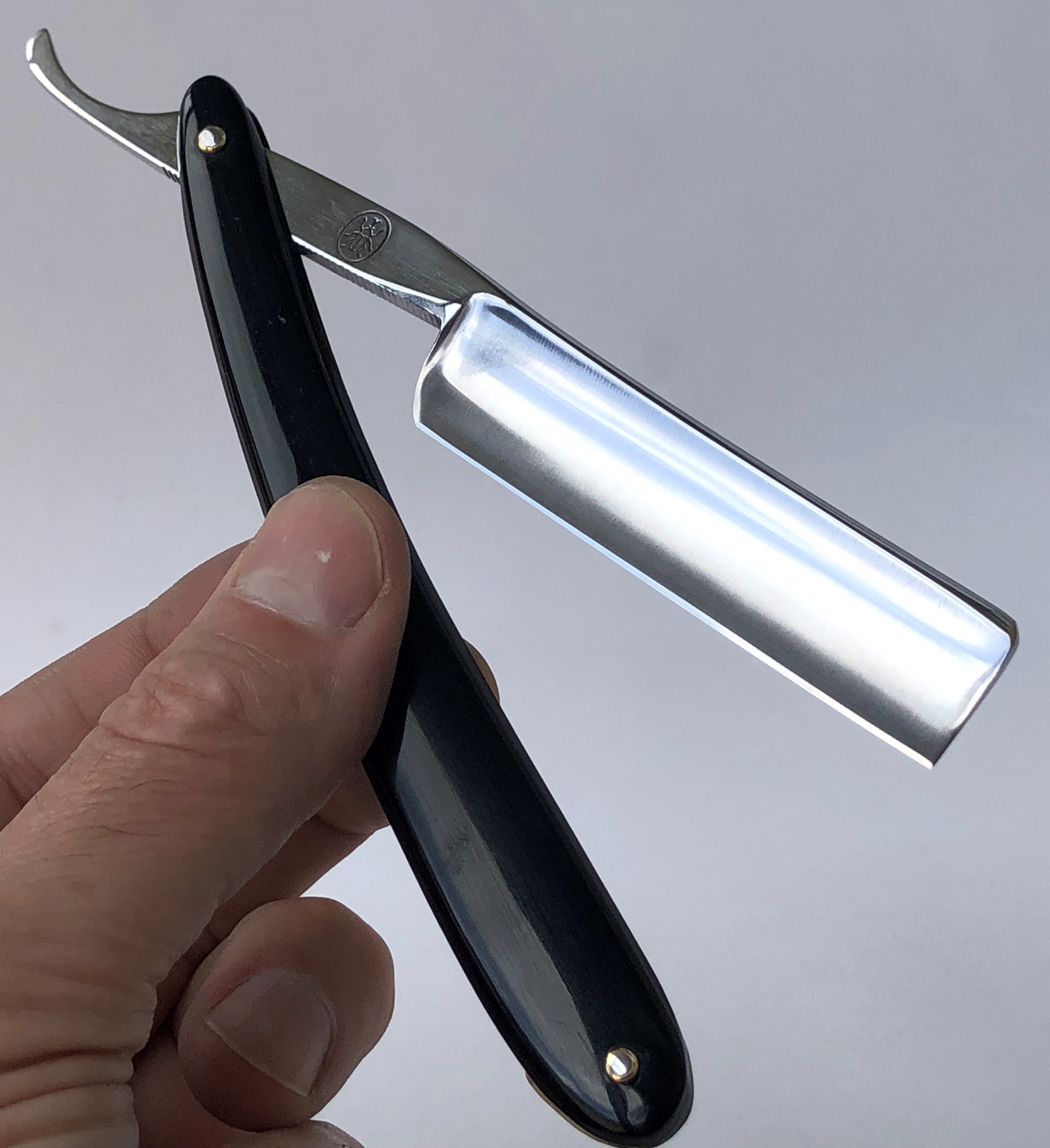 Бритва без следов пользования,но пришлось разобрать, для удаления следов окисления в районе осевого пина.Заменил медную заклепку на двух-цветную втулку,а также добавил внутренние шайбы.Заводская шлифовка и полировка полотна. Идеальная геометрия:кромочка равномерна по всей длине полотна.Очень хороший и недорогой вариант для новичка..