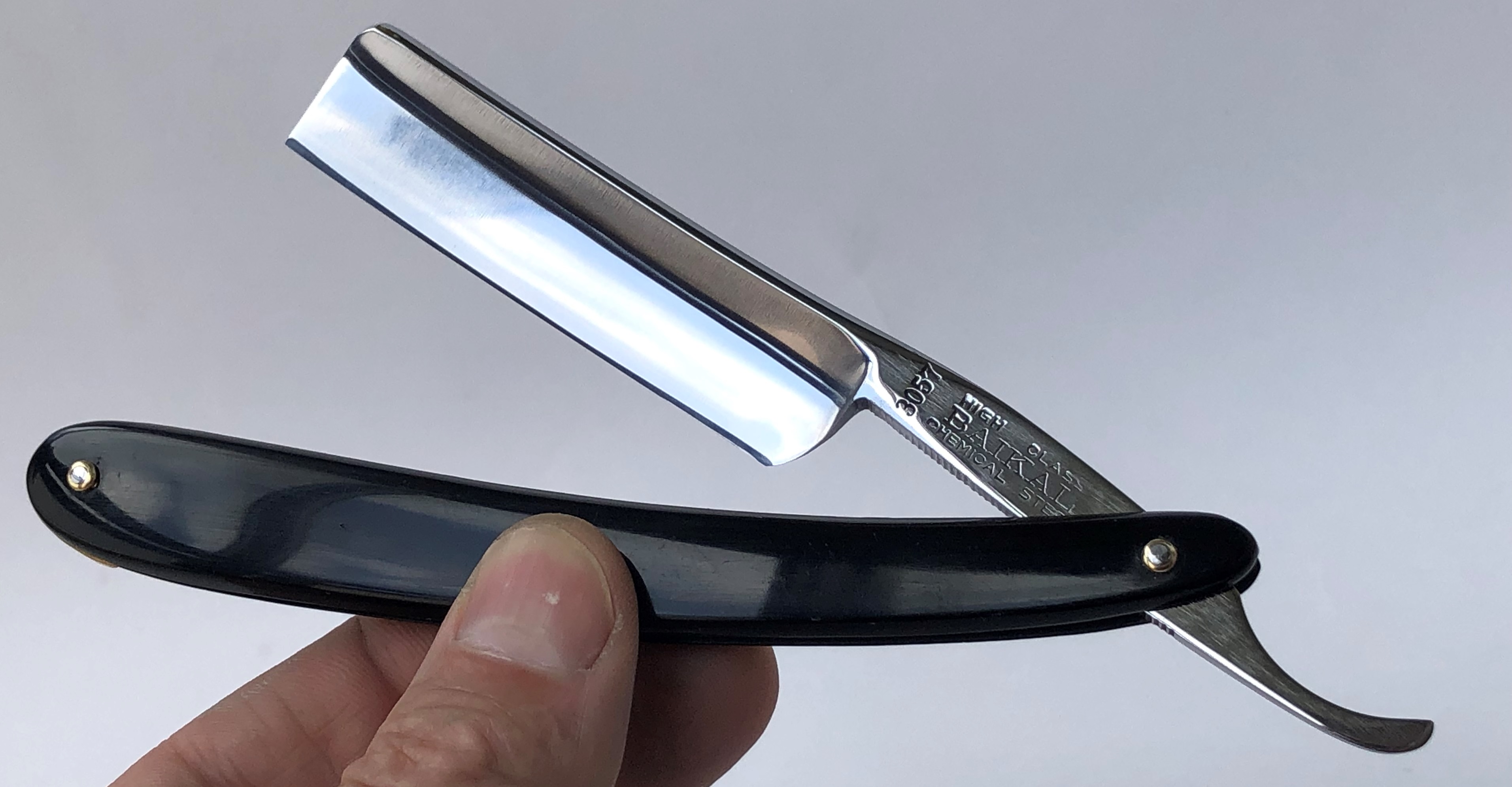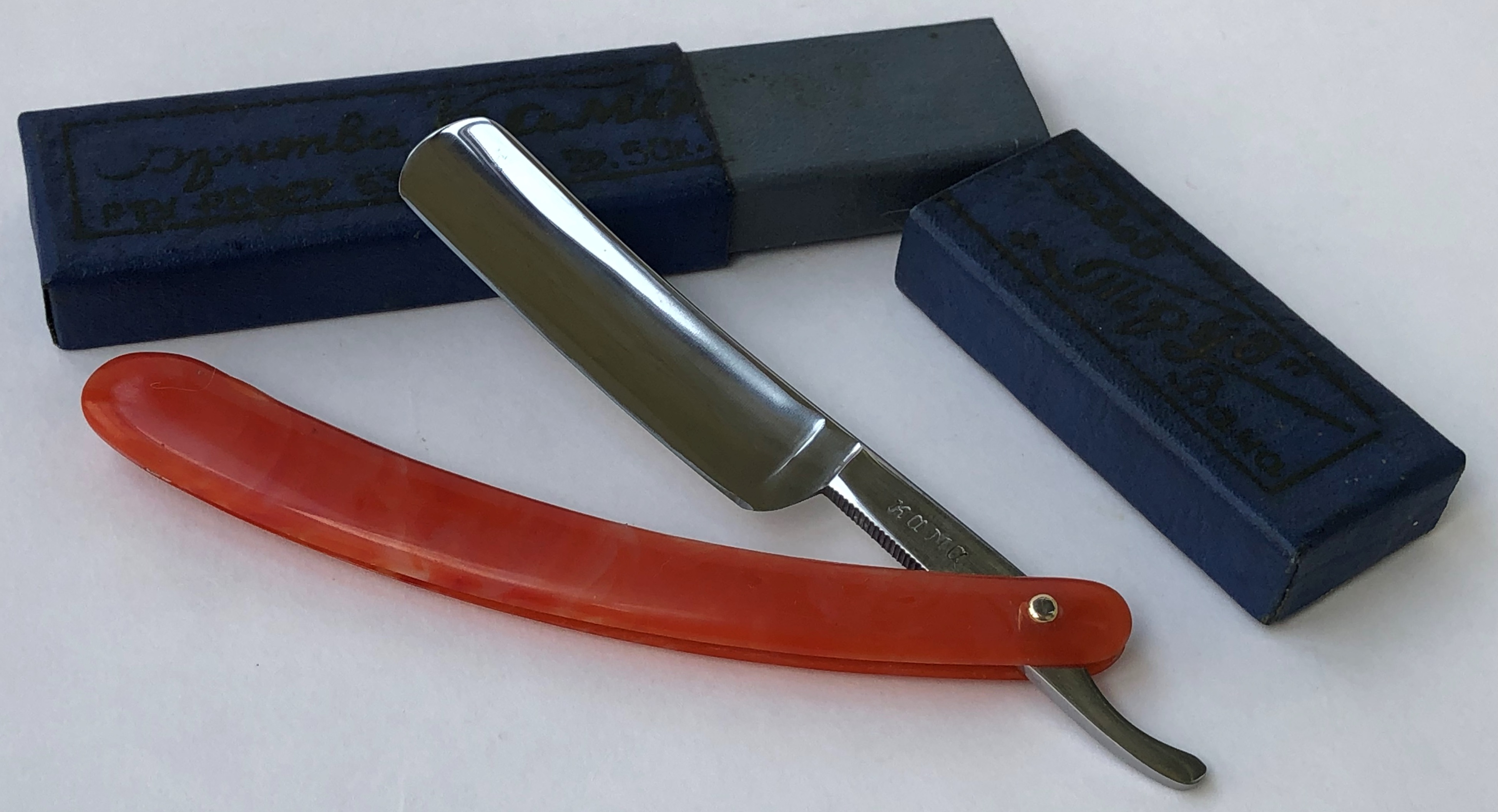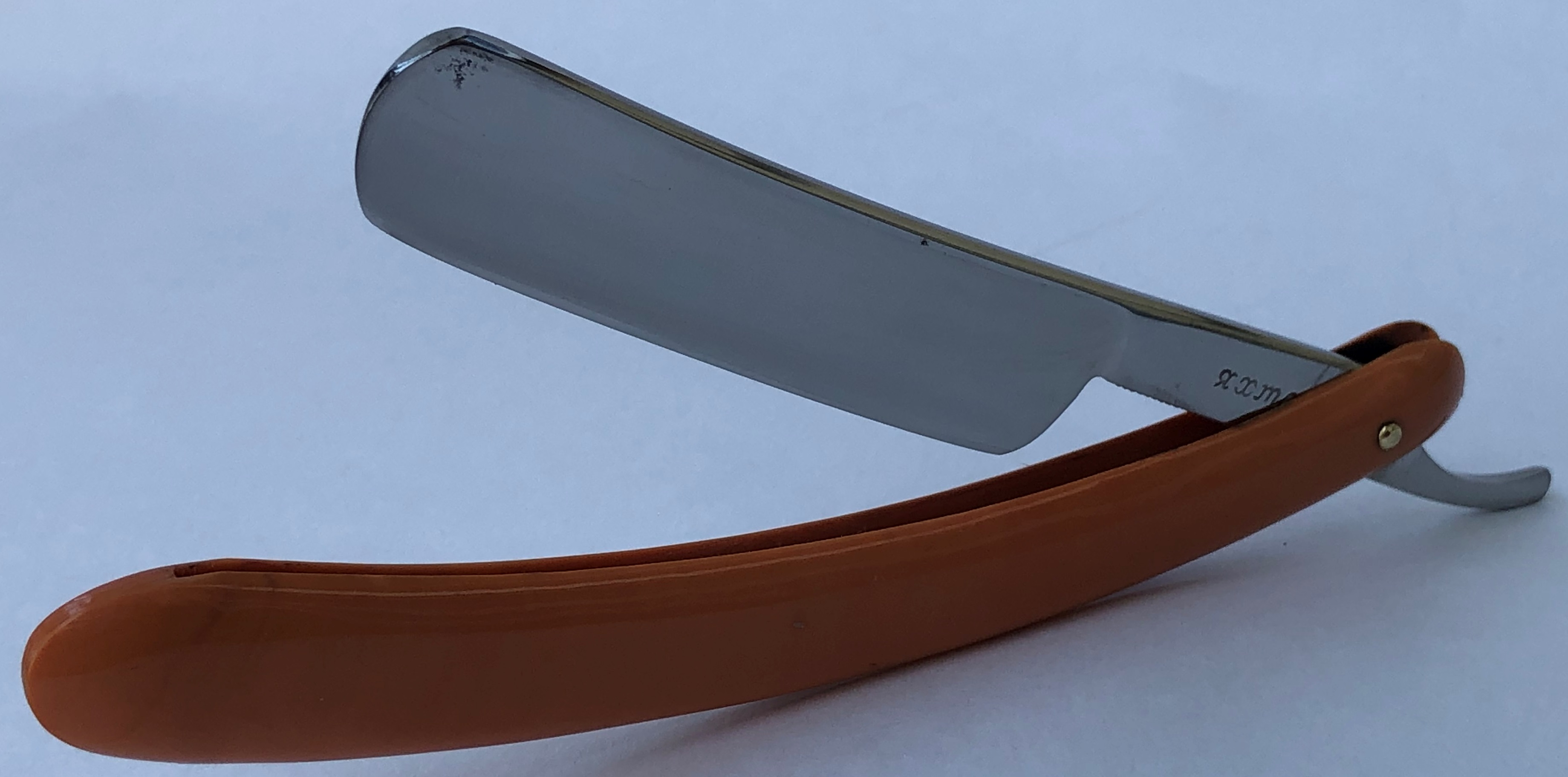 Довольно редко встречающаяся модель бритвы.Хочу обратить внимание, что форма лезвия является оригинальной, а не следствие каких то работ.(За 13 лет попадается третья и везде форма клинка была такая же).Если мне не изменяет память, то это единственная модель Хенка, с таким "гранёным" обушком.