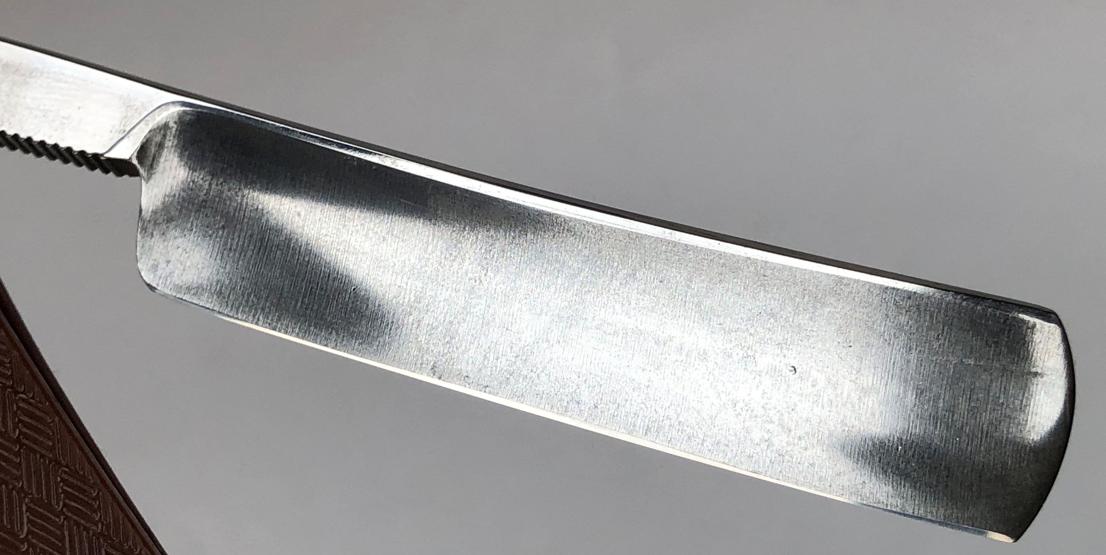 Бритва не разбиралась и не ремонтировалась. Оттер от остатков смазки с хранения. Есть несколько "следов времени", но трогать ничего не стал, чтобы сохранить полную оригинальность.Имеются следы от электро-химической заводской заточки.Идеальная геометрия полотна:кромочка равномерна по всей длине.Заводская заточка была переточена и доведена до комфортного бритья.