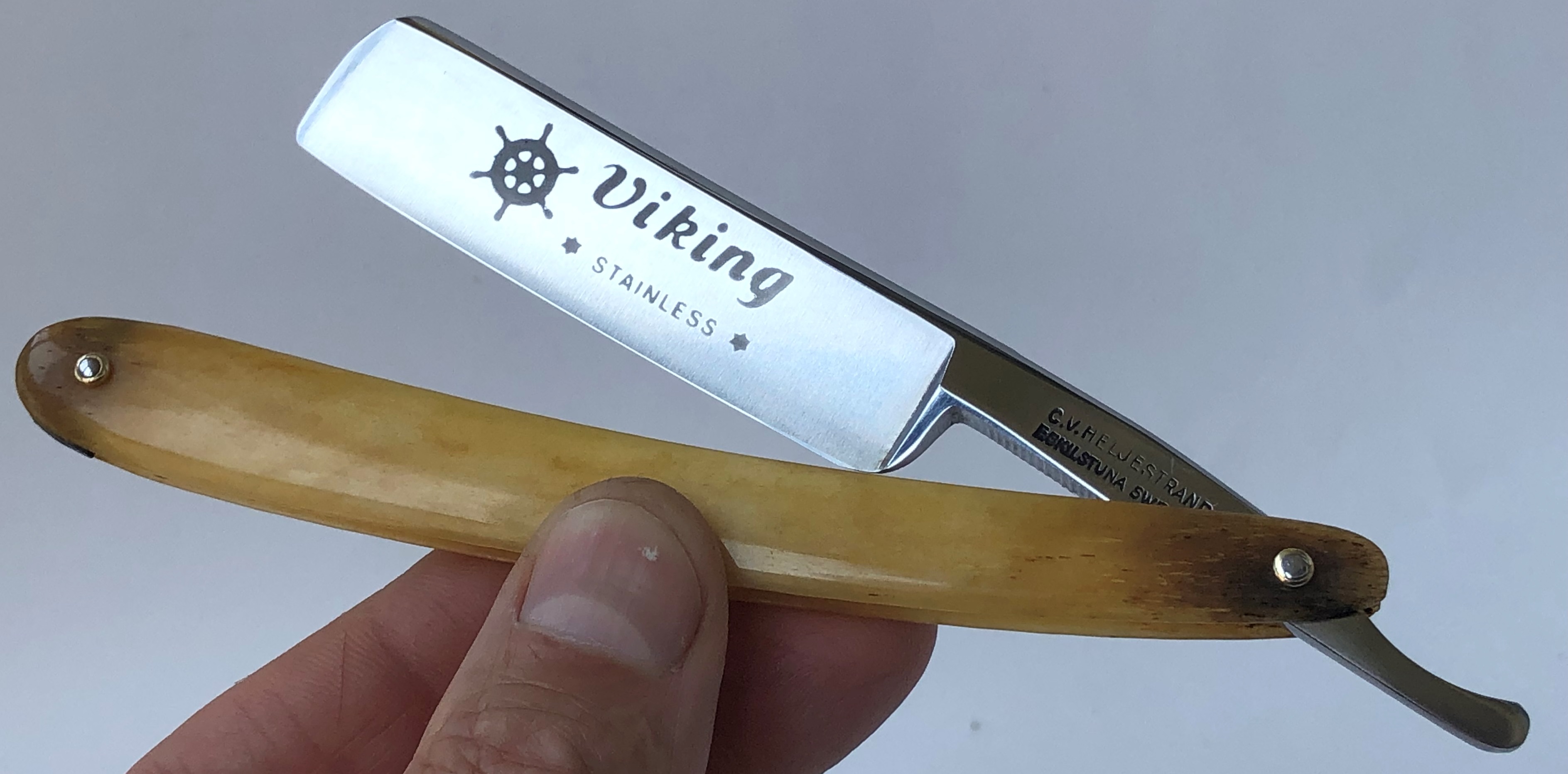 Клинок совершенно непользованный. Не шлифовался и не полировался.Сталь чистая, без видимых дефектов. Идеальна геометрия полотна:кромочка равномерна по всей длине и практически незаметна.Родную пластиковую ручку поменял на более дорогой сюртук, в виде натуральной и древней кости.Шведки довольно часто компоновались ручками из слона и кости, поэтому и тут все выглядит в рамках допустимого,причем текстура данного экземпляра просто шикарна.Тяжёлая, красивая бритва. Не пропустите. Заточена и готова к бритью.
