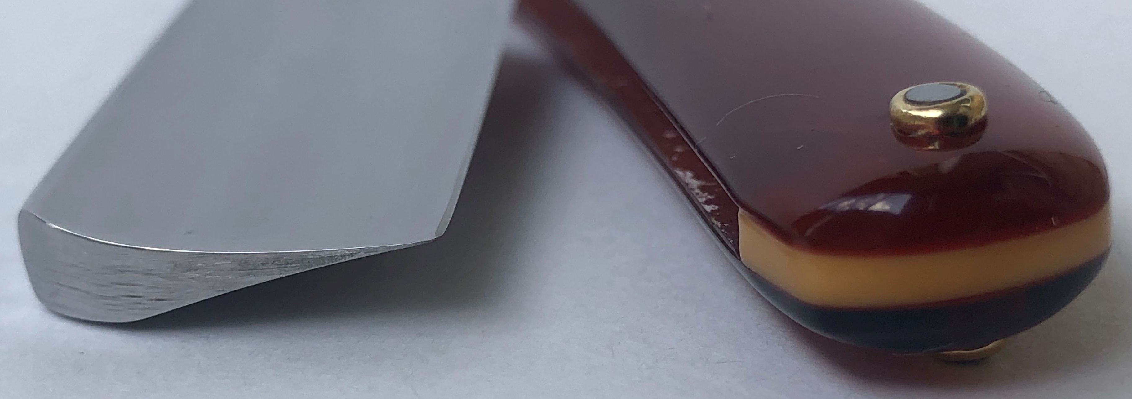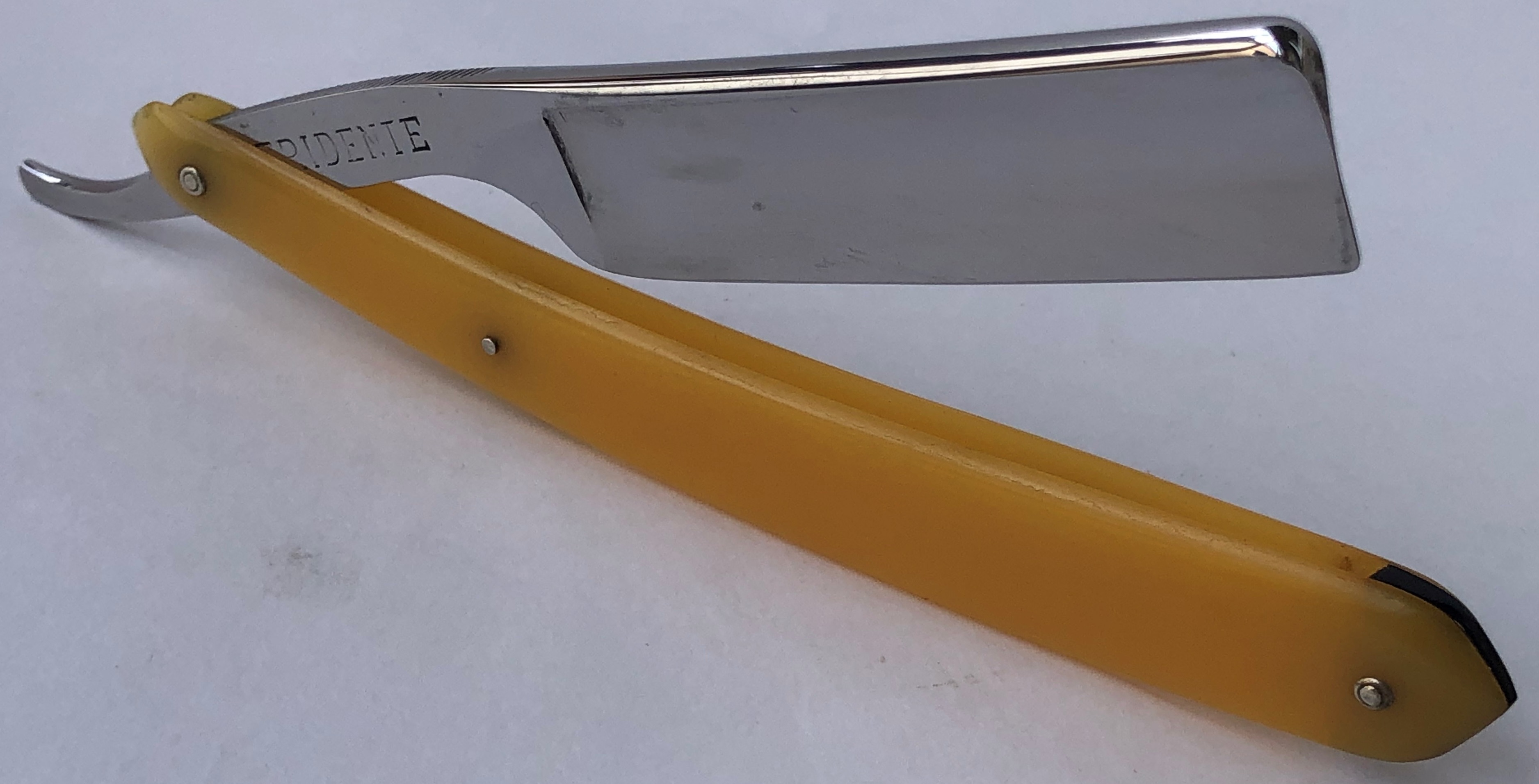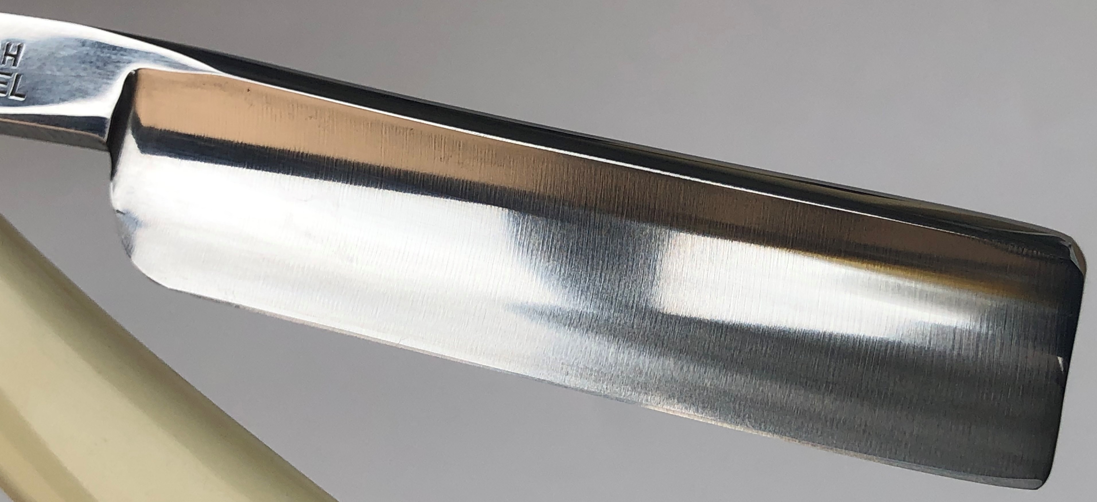 Бритва в очень хорошем состоянии.Непонятно, была ли в пользовании или нет, так как следов на обушке от заточных камней не наблюдается, но ширина полотна неоригинальна.Возможно был изначально скол, а может быть просто правильная и профессиональная эксплуатация.Бритва была разобрана для удаления следов окисления и царапин.Добавил внутренние шайбы и поставил втулку.Кромочка почти равномерна по всей длине. Сталь чистая от видимых дефектов.