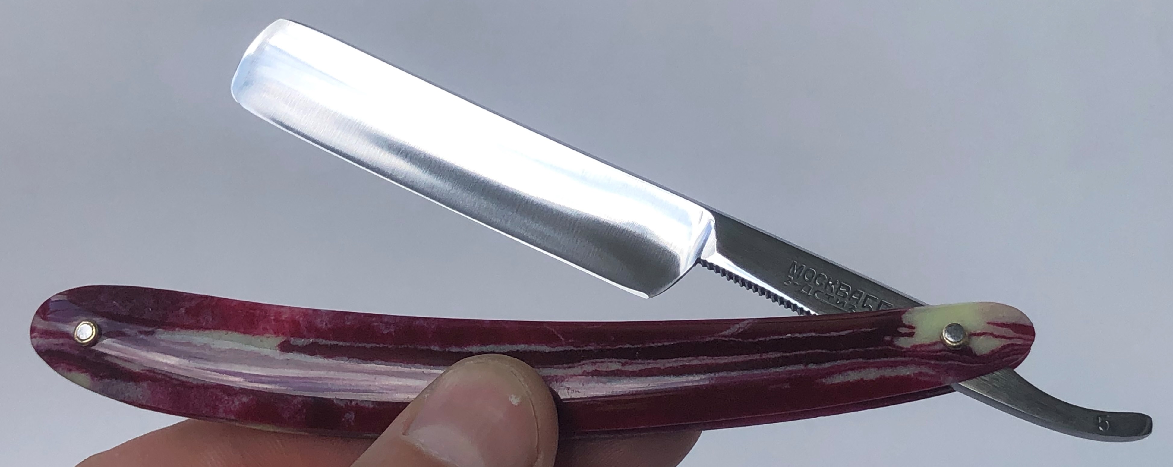 Бритва сохранилась очень хорошо. Немного откорректировал утОчку обушка, заново перешлифовал и умеренно отполировал.Рытвинки в районе осевого пина оставил, чтобы не убирать лишнего, да это собственно и не нужно.На сколько известно, данная модель бритвы комплектовалась рифлёной оправой из прессованного картона. Не стал переустанавливать родную оправу, а поменял ее на примерно такую же(и того же периода производства), только пластиковую , от Труд Вача.Новые пины и внутренние шайбы, для надежности. Очень приятная, не часто встречающаяся, элегантная бритва.Заточена и готова к бритью.