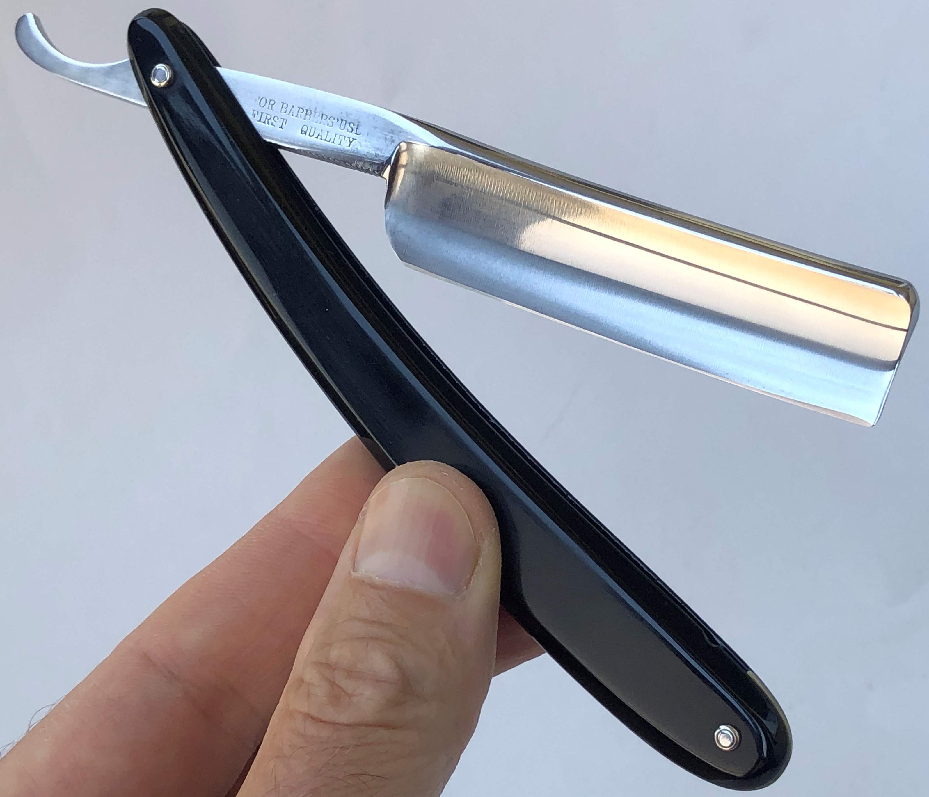 Бритва в очень хорошем и малопользованном состоянии.Была разобрана для приведения косметических работ.Умеренная полировка полотна. Кромочка равномерна по всей длине.Сталь и кромка чистые от разного рода видимых дефектов.Отличная высококачественная, парикмахерская бритва.Тяжёлая. Не дорогой инструмент на все случаи жизни.