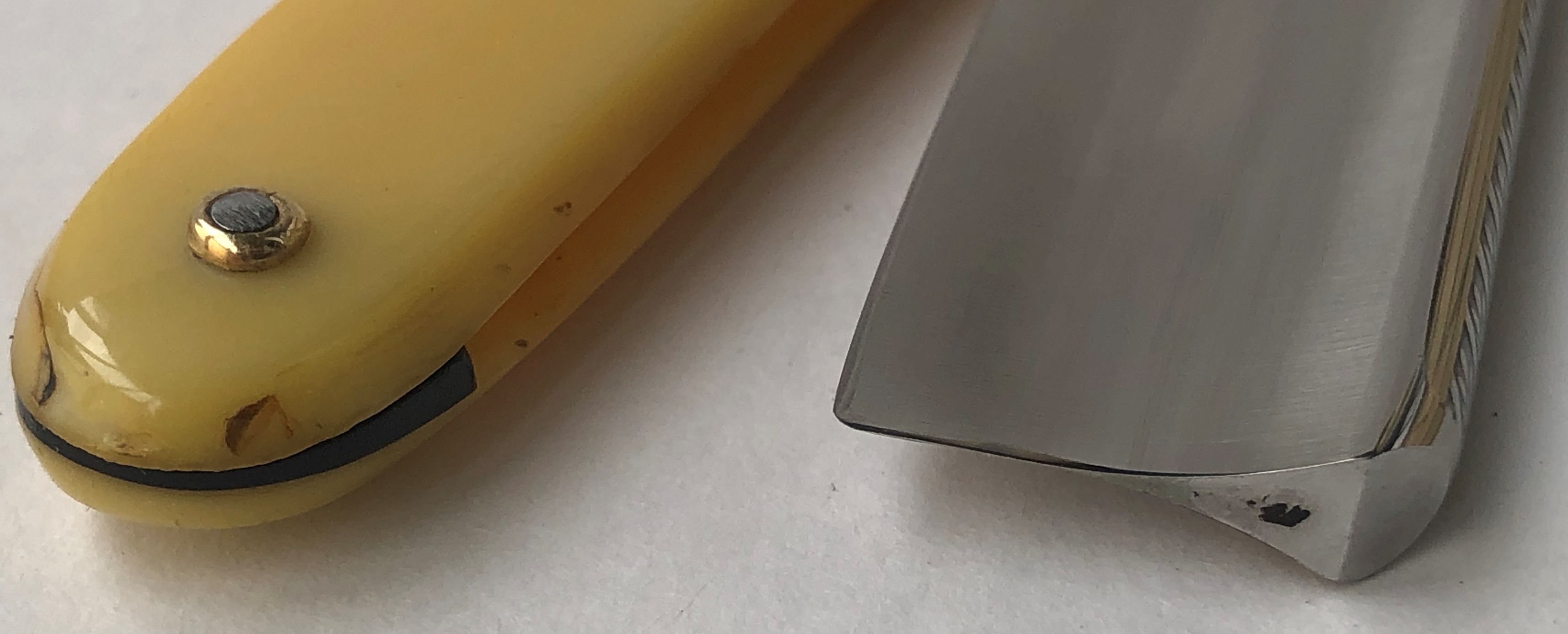 Клинок в прекрасном и малопользованном состоянии для своих лет. Бритва была разобрана, для приведения в порядок и снова собрана, с заменой пинов на двух-цветные пины, а также с добавлением внутренних шайб.