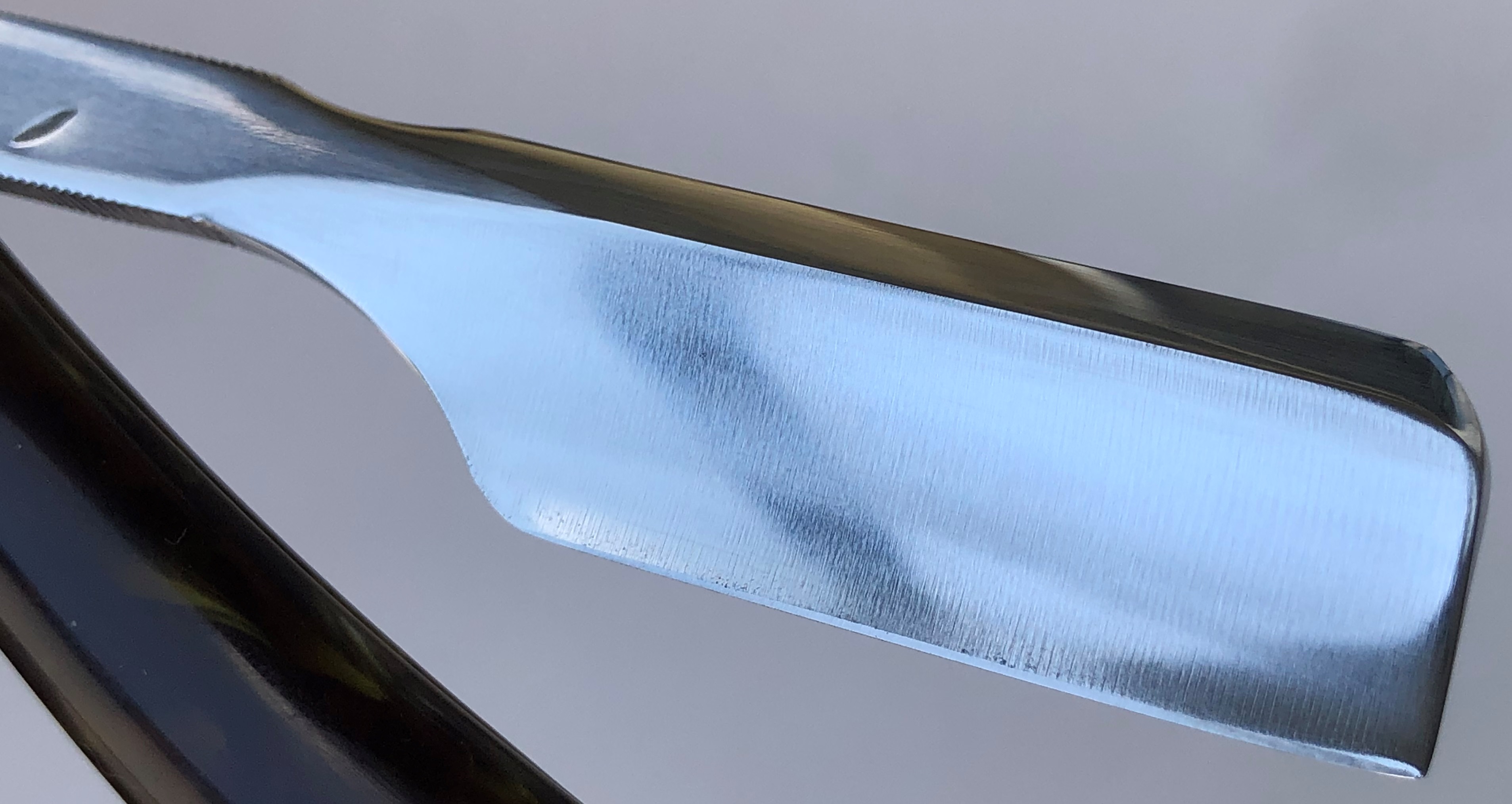 Попробовал вдохнуть вторую жизнь в старушку.Разобрал, откорректировал утОчку обушка и исправил небольшую "обратную улыбку".Скошенная пятка в результате удаления скола.Умеренная полировка.Кромка сейчас равномерна по всей длине. Оставил немного красивого налета патины на эрле. Неглубокую трещинку на ручке также хорошо проклеил.В общем и целом получалась неплохая, недорогая и удобная бритва. Заточена и готова к бритью.