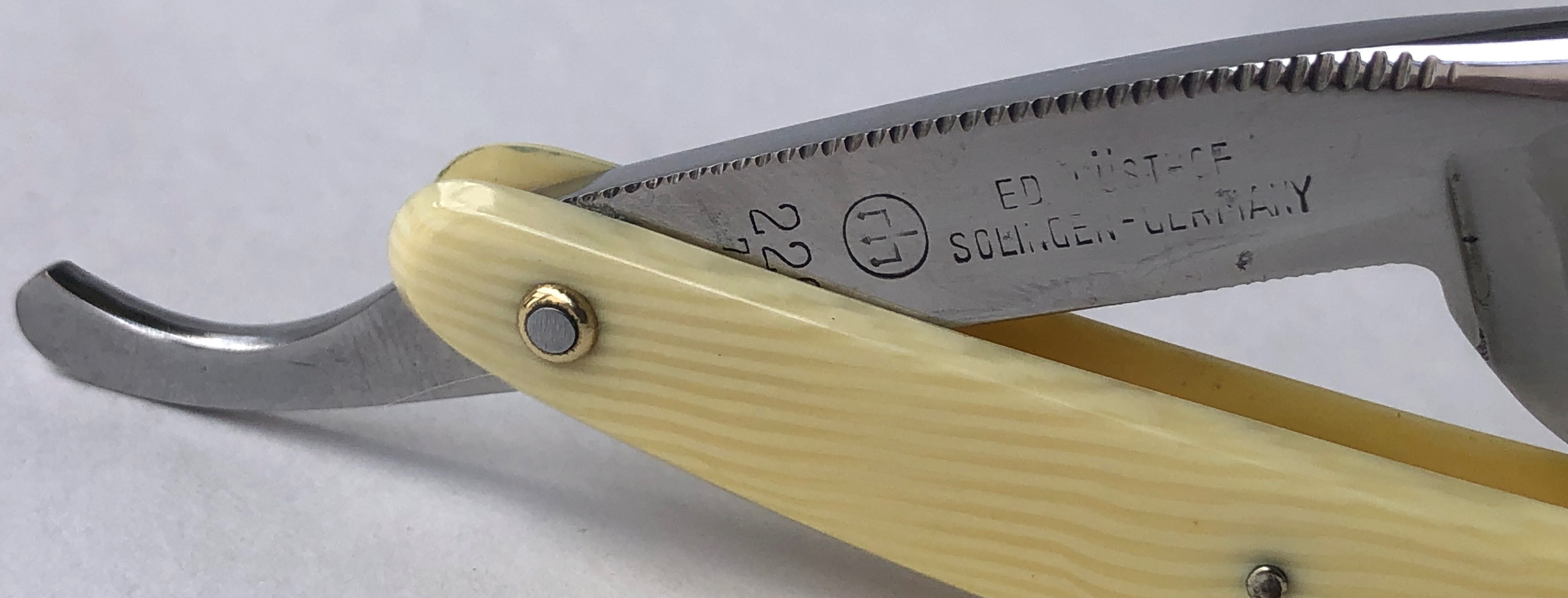 Сохранил благородный налет патины на эрле, дабы сохранить аутентичный вид и подчеркнуть почтенный возраст бритвы.Сам клинок имеет идеальную геометрию, с тоненькой кромочкой по всей длине. Редко толстый обух для бритв этого бренда.Тяжёлая. За счет такого обушка есть возможность бриться, не выставляя угла атаки, а просто кладя бритву плашмя.Бритва среднего размера, но тяжёлая и верткая. Уверен, что опытный пользователь в полной мере оценит все преимущества такого инструмента.Красивая и редкая вещь. Заточена и лично протестирована. Бритье чистое, с неким металлическим отзвоном сбриваемой щетины. Умеренно агрессивная,впрочем как и большинство немцев.Не пропустите!
